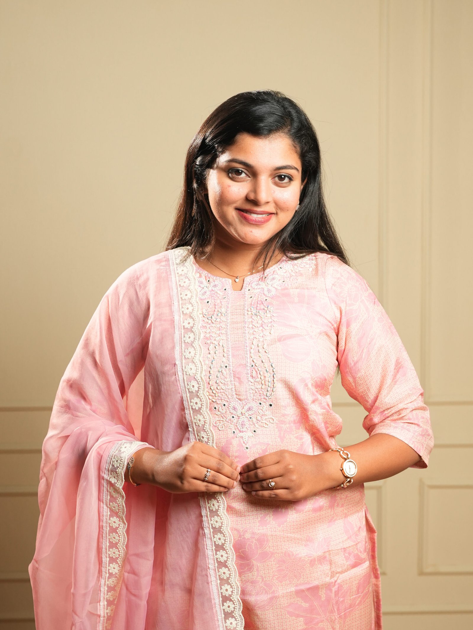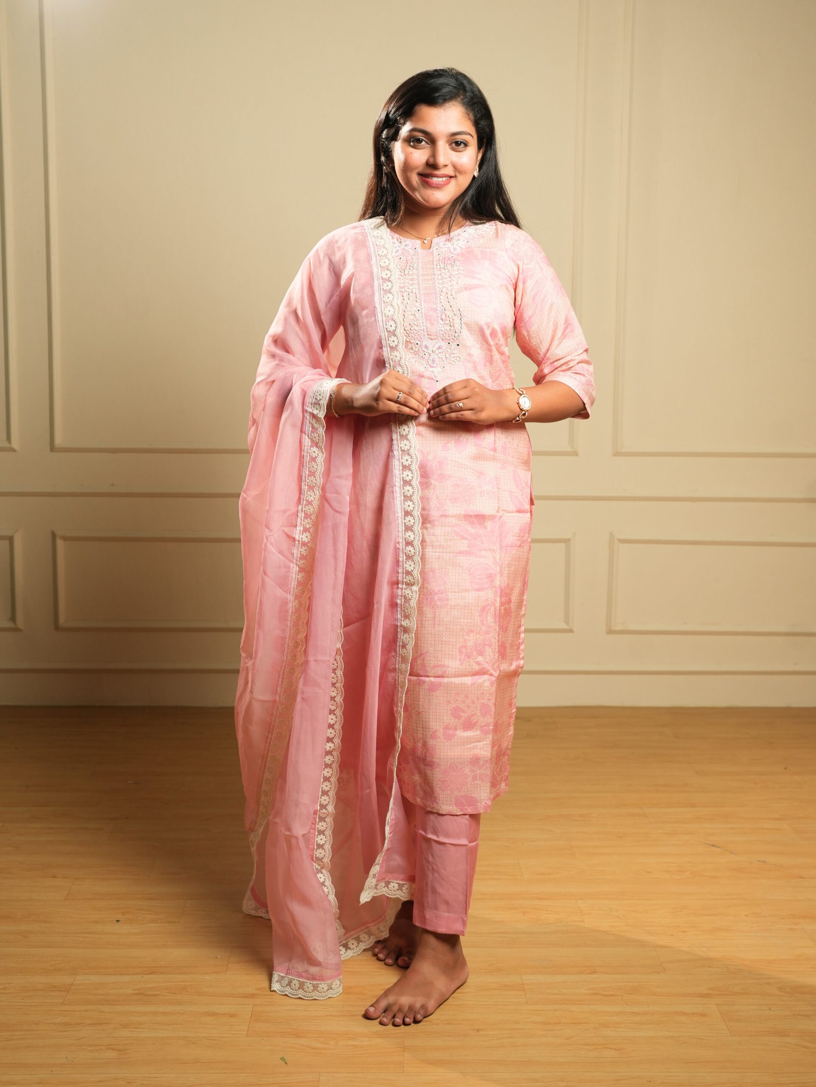 A soft baby pink kurti set featuring delicate embroidery, matching pants, and a beautifully bordered dupatta — perfect for festive wear, office wear, and elegant day outings.