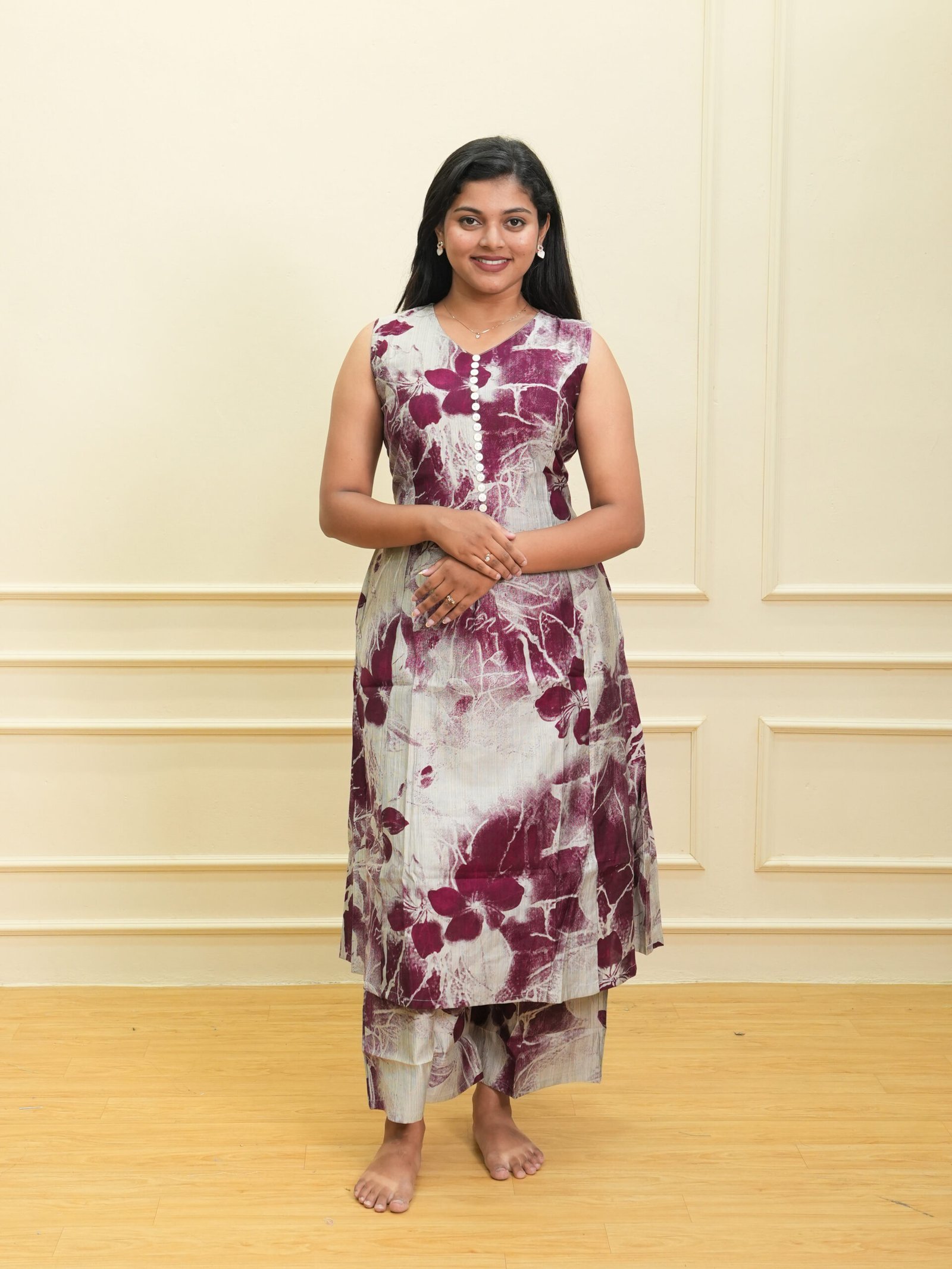 This beige and maroon floral printed kurta set blends modern aesthetics with breathable comfort. The sleeveless kurta features a V‑neckline and a straight silhouette that offers a flattering fit for all-day wear.