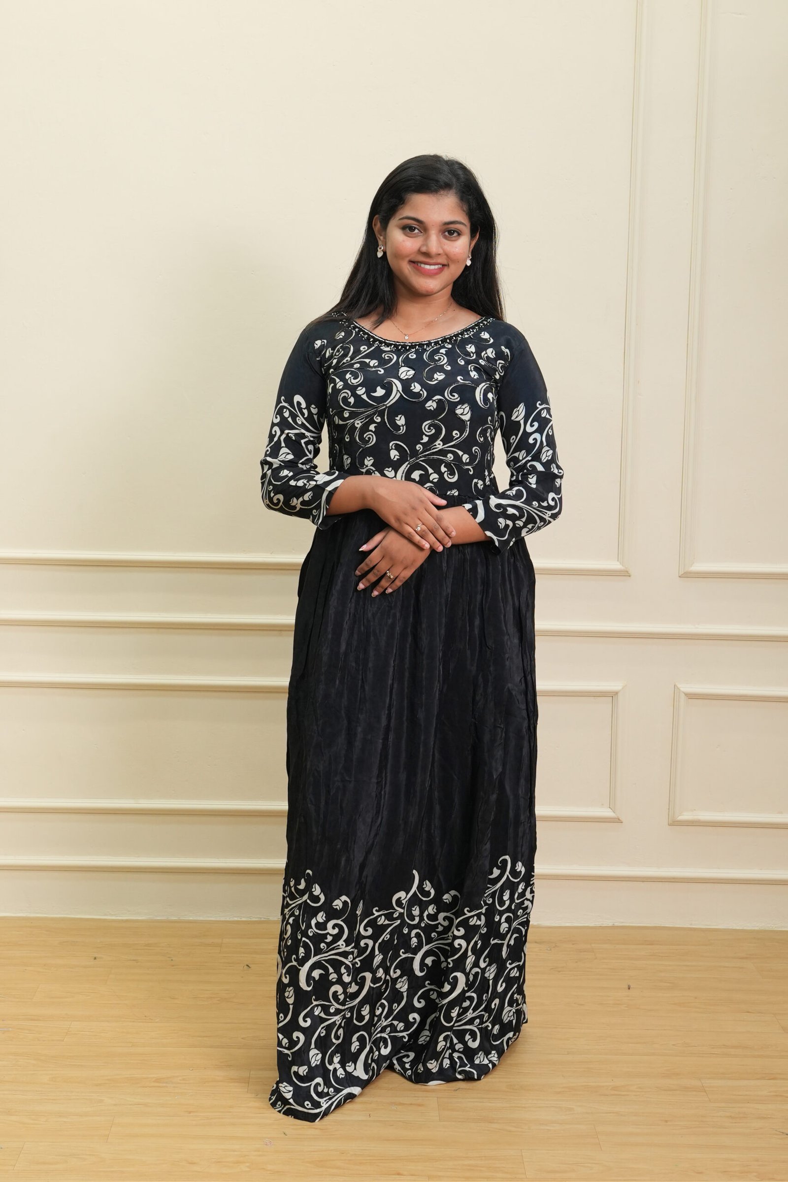 This black long maxi dress combines elegance, comfort, and timeless design. The upper portion features intricate white floral embroidery, adding sophistication and contrast to the deep black fabric. The round neckline and three‑quarter sleeves provide a modest and graceful appearance, while the long flowy skirt enhances comfort and movement. Crafted from lightweight, breathable material, this maxi dress is ideal for festive wear, family functions, casual gatherings, and semi‑ethnic styling. The embroidered detailing along the hemline adds a beautiful finishing touch, making the outfit visually striking and suitable for both day and evening events.