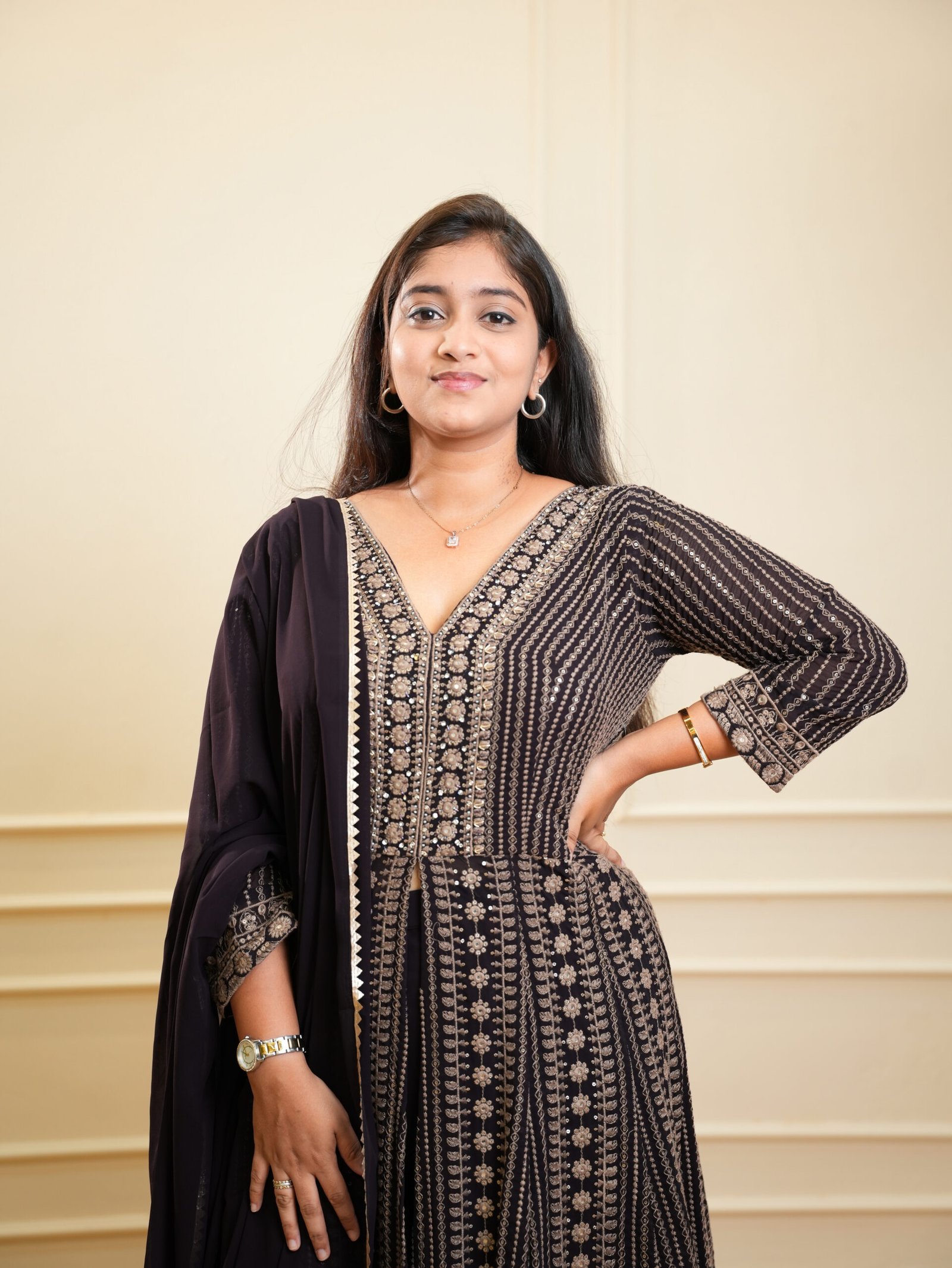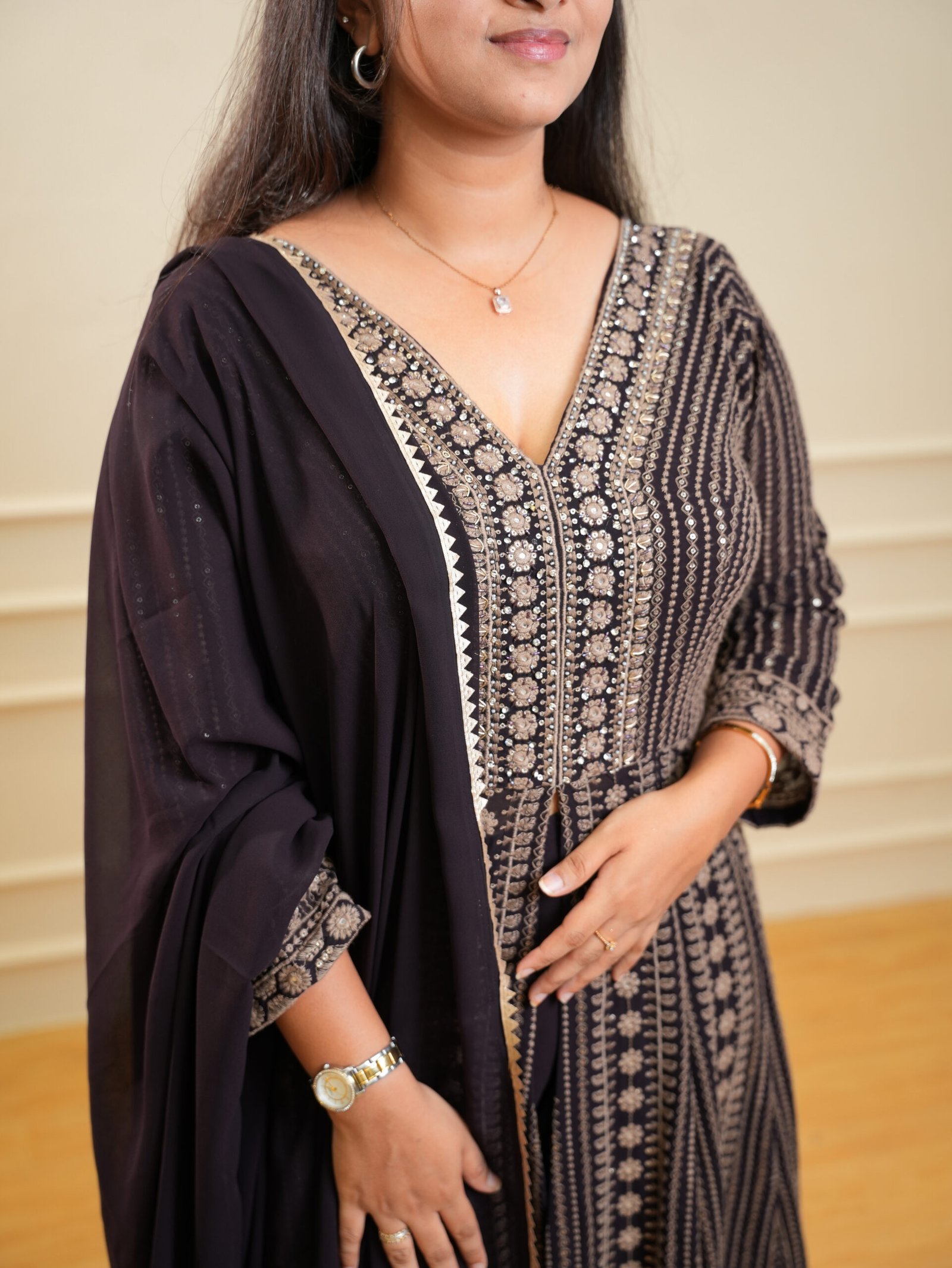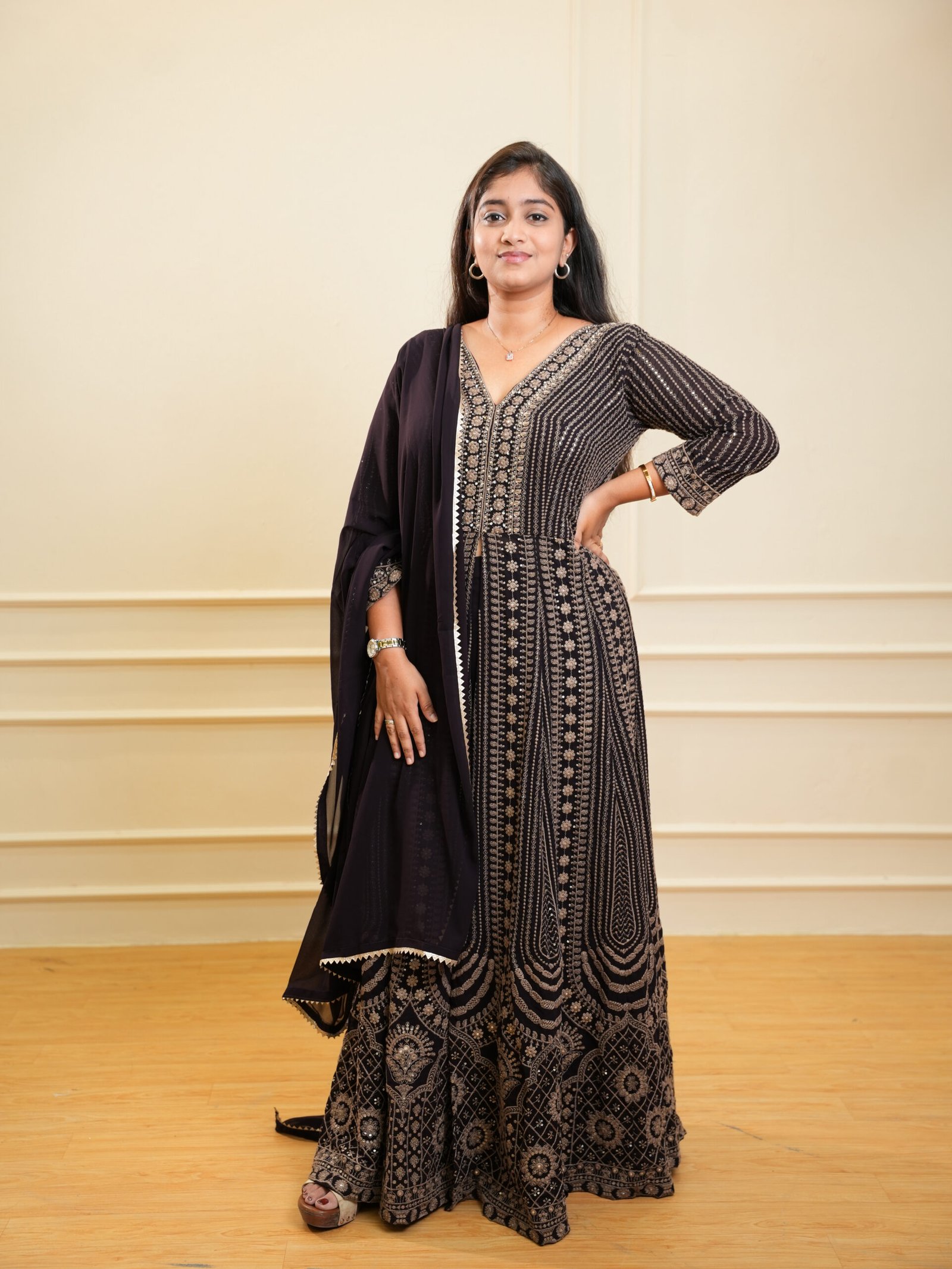 - Flared Anarkali silhouette for elegant movement