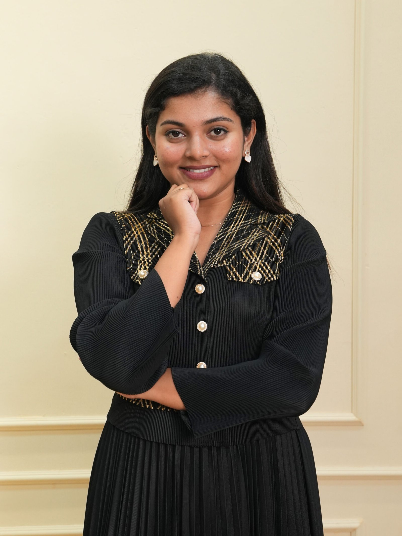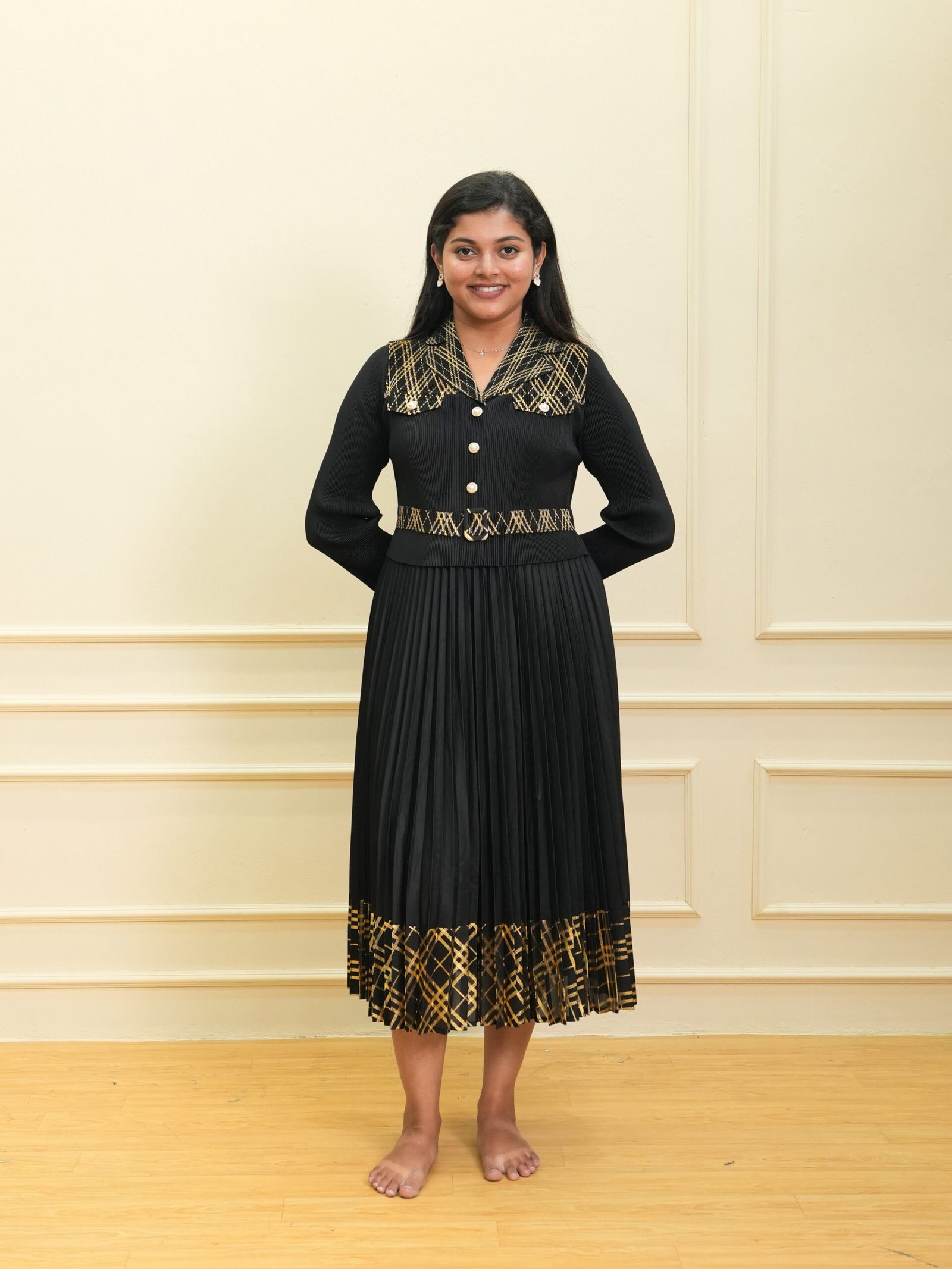 This black textured top with pleated midi dress brings together sophistication, structure, and modern detailing. The button‑down upper bodice features a refined textured pattern complemented by gold geometric printed accents on the collar and waistband. Gold-toned buttons add a luxurious touch, enhancing the overall refined appearance.