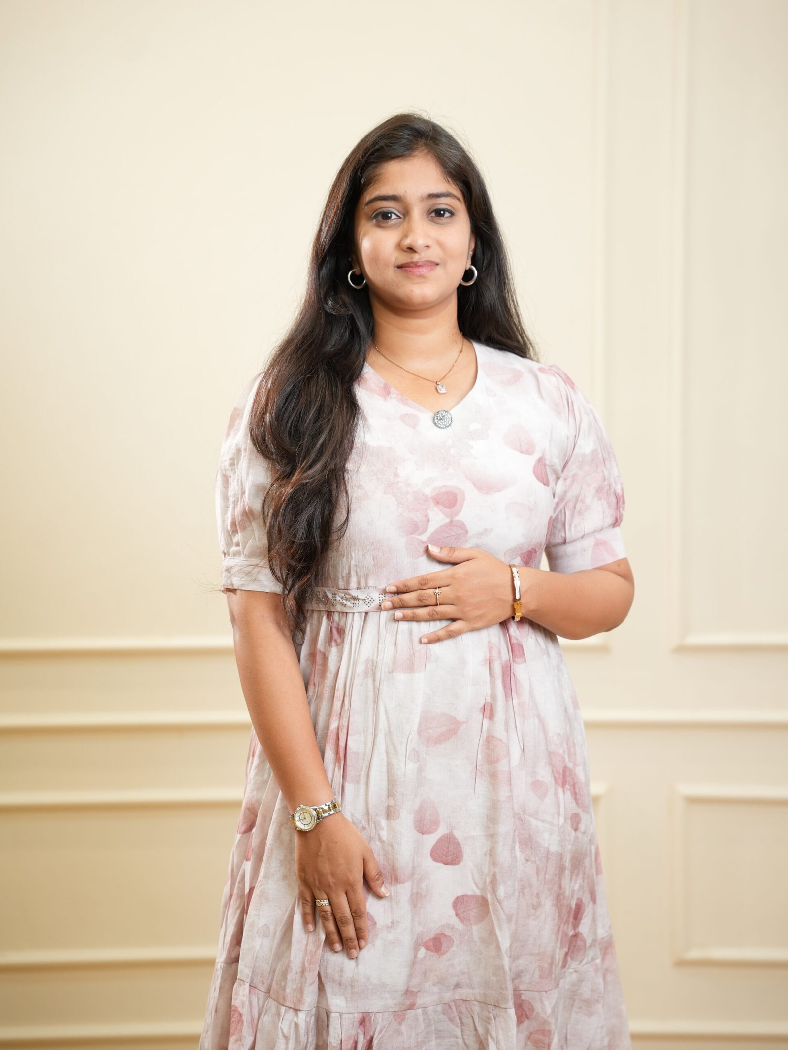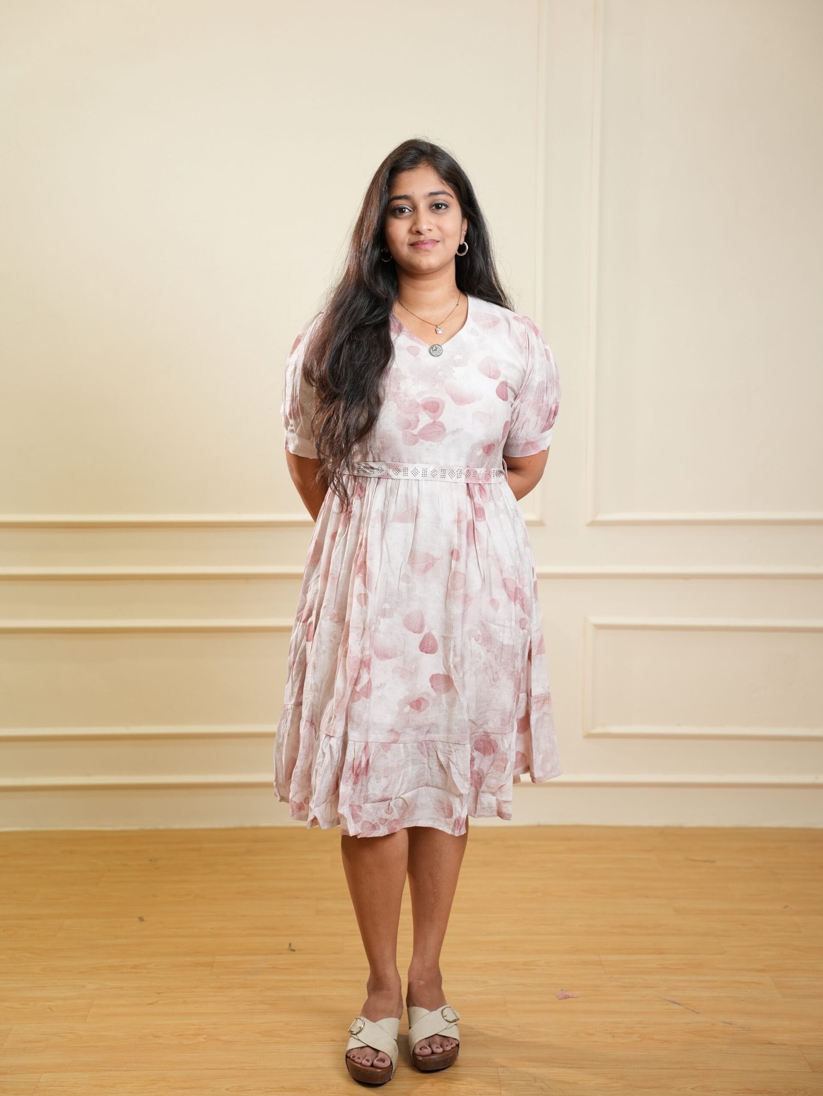 Add subtle sophistication to everyday dressing with this blush pink printed knee‑length dress, crafted for effortless comfort and timeless style. The dress features delicate abstract motifs spread evenly across a soft blush pink base, creating a calm and refined visual appeal.