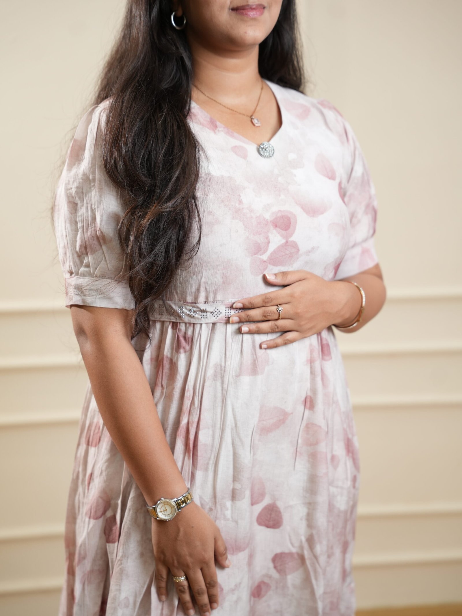 - Soft blush pink base with delicate all‑over prints