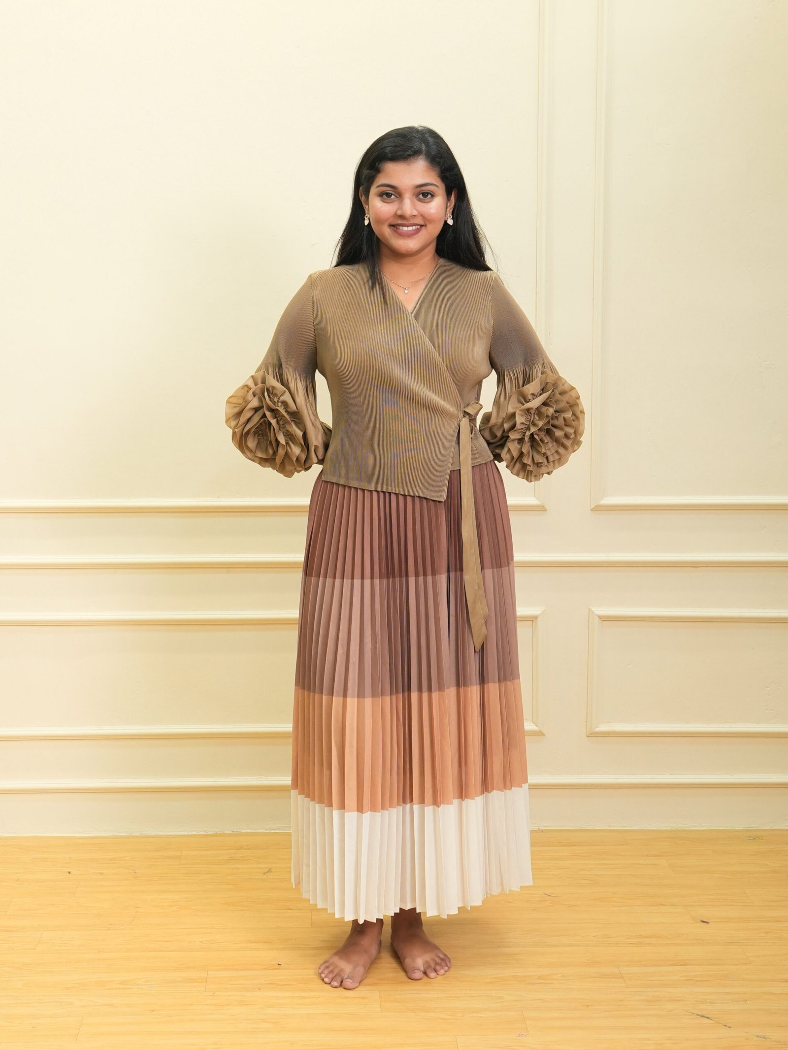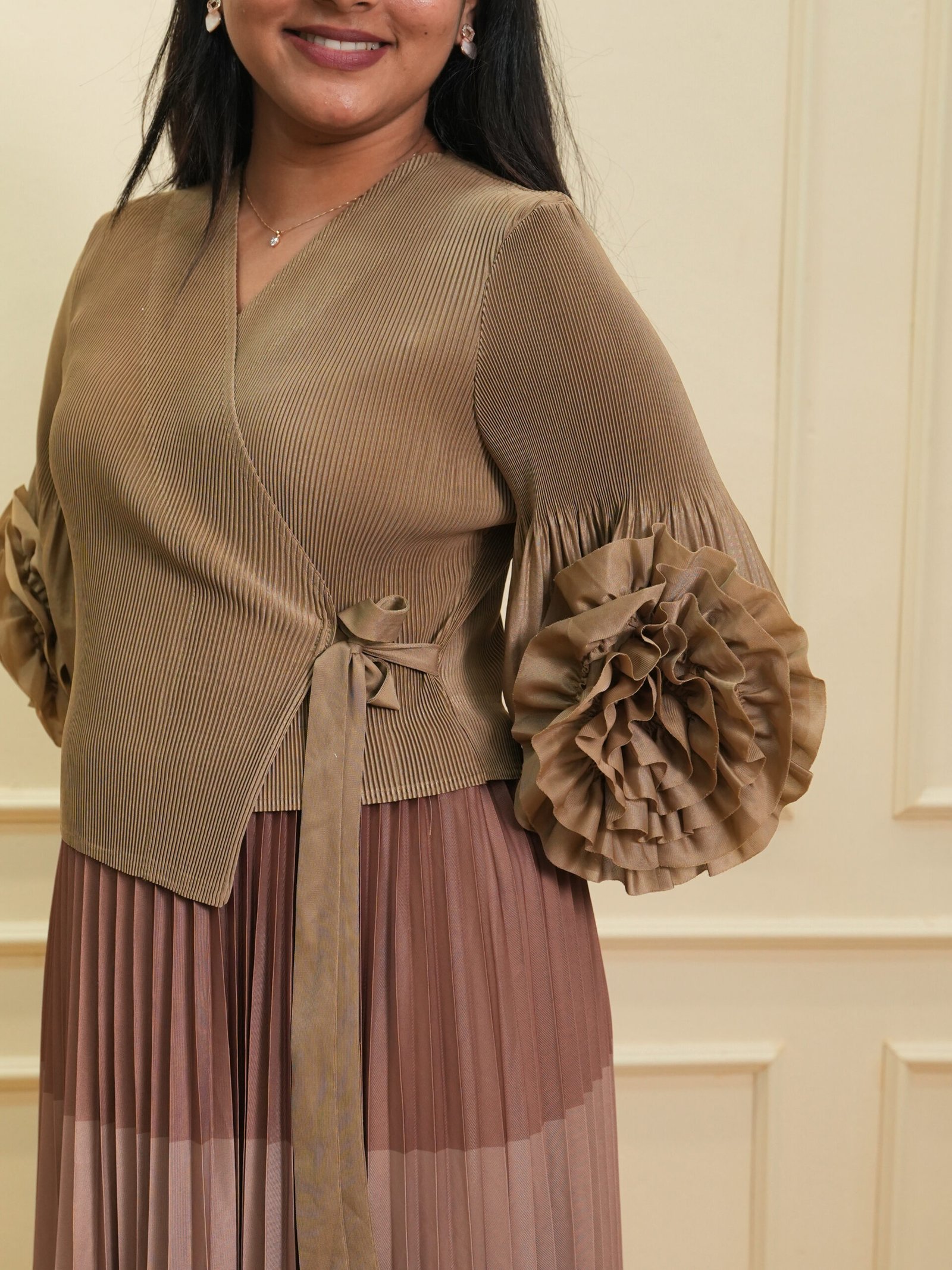 This chic multi‑tone pleated maxi dress is designed to bring elegance and comfort together. The upper portion features a textured wrap-style bodice with a self-tie detail, offering a flattering fit and elevated aesthetic. The sleeves are crafted with ruffled, voluminous detailing that adds a designer touch, making the outfit stand out effortlessly.