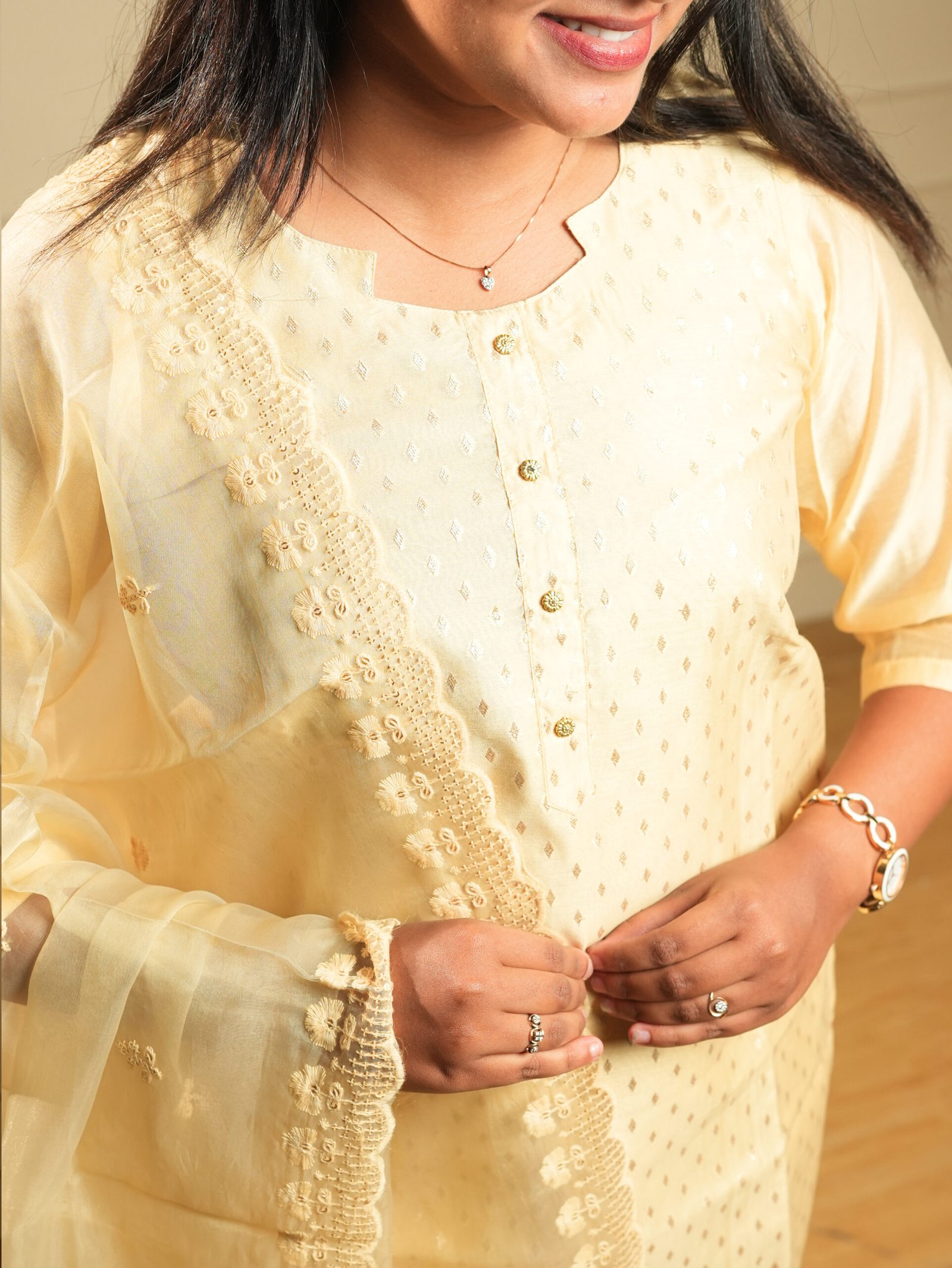 - Pattern: All-over self-tonal chikankari-style floral embroidery with scattered butti motifs