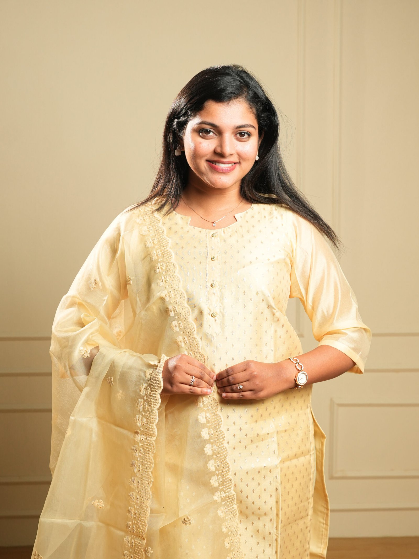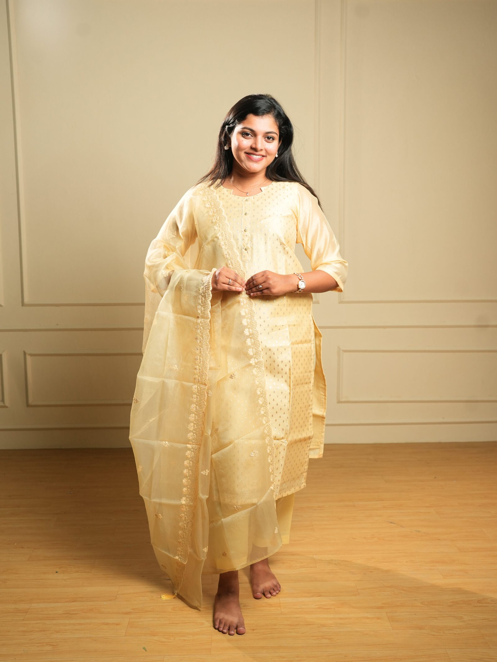 Embrace understated luxury with this Cream 3-Piece Chikankari Embroidered Kurta Set, a beautifully refined ensemble that celebrates the timeless elegance of tonal white-on-white Indian embroidery. The kurta is crafted from a premium tissue/silk-blend fabric with a soft golden sheen, featuring all-over self-tonal chikankari-style floral embroidery and scattered butti motifs that catch the light subtly and beautifully.