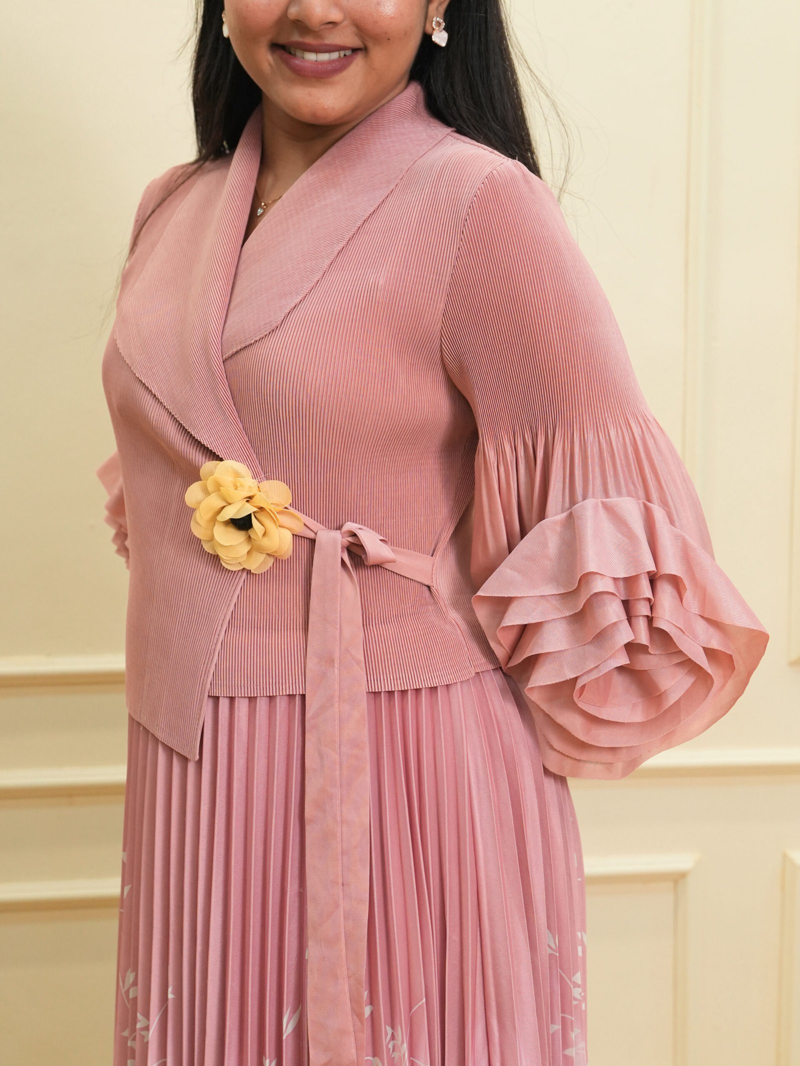 This dusty pink textured wrap top with floral ombre pleated maxi skirt is a beautifully crafted ensemble blending modern fashion with subtle elegance. The top showcases intricate textured patterns with a wrap-style front, secured by a tie-up belt and an attached floral accent. The layered ruffle sleeves add a dramatic and fashionable touch, creating a structured yet graceful silhouette.