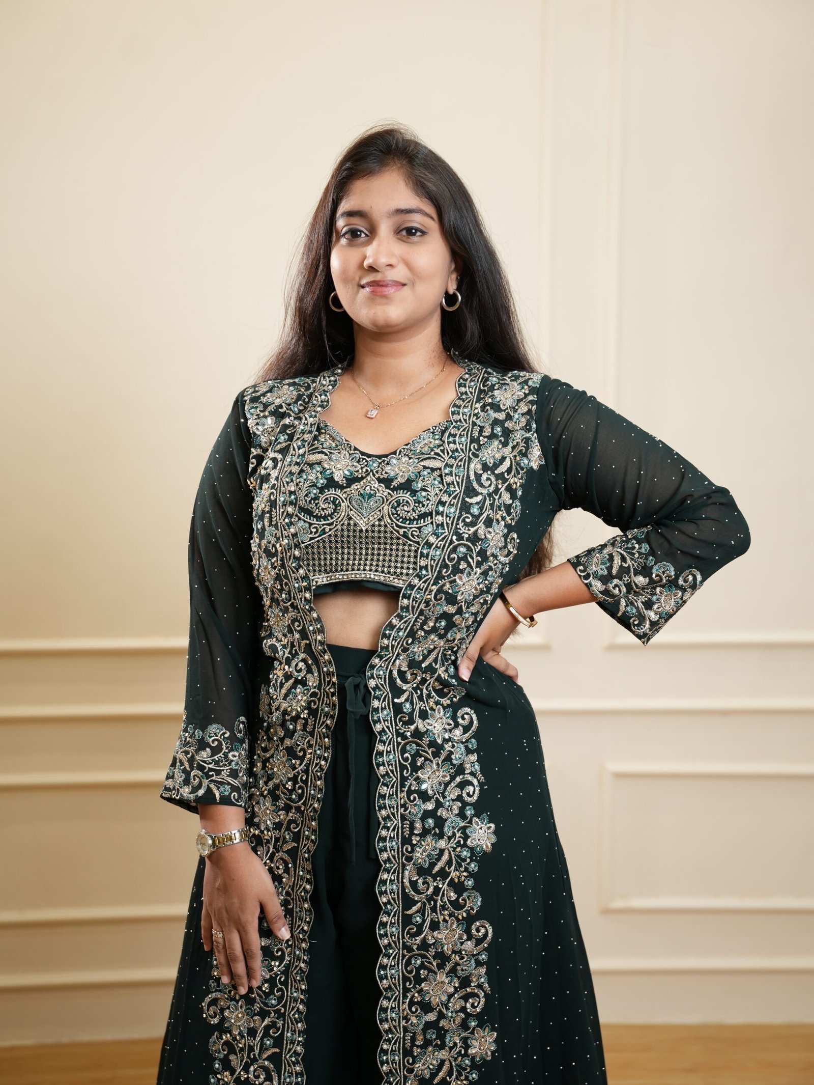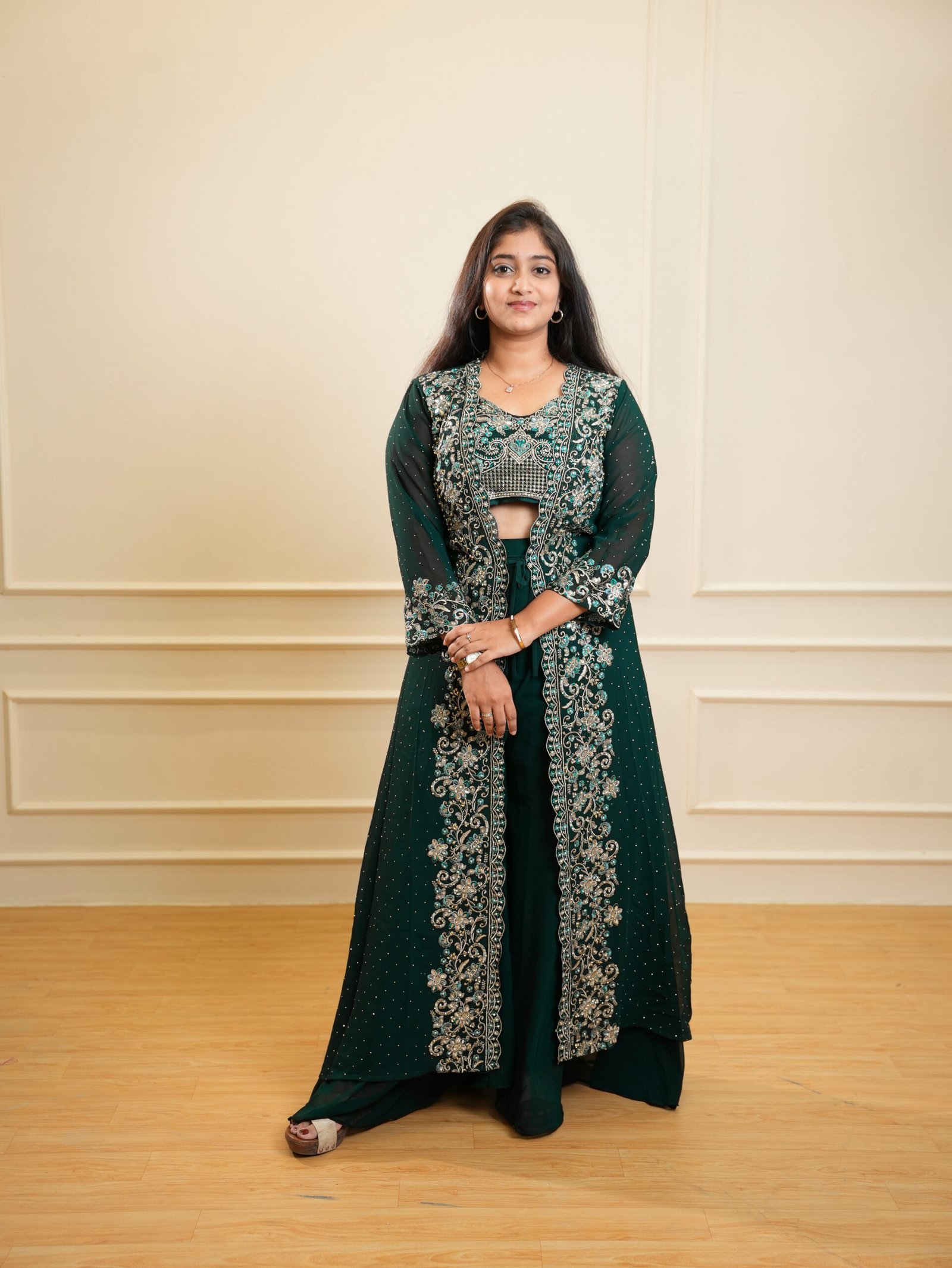 - Rich emerald green color with intricate embroidery