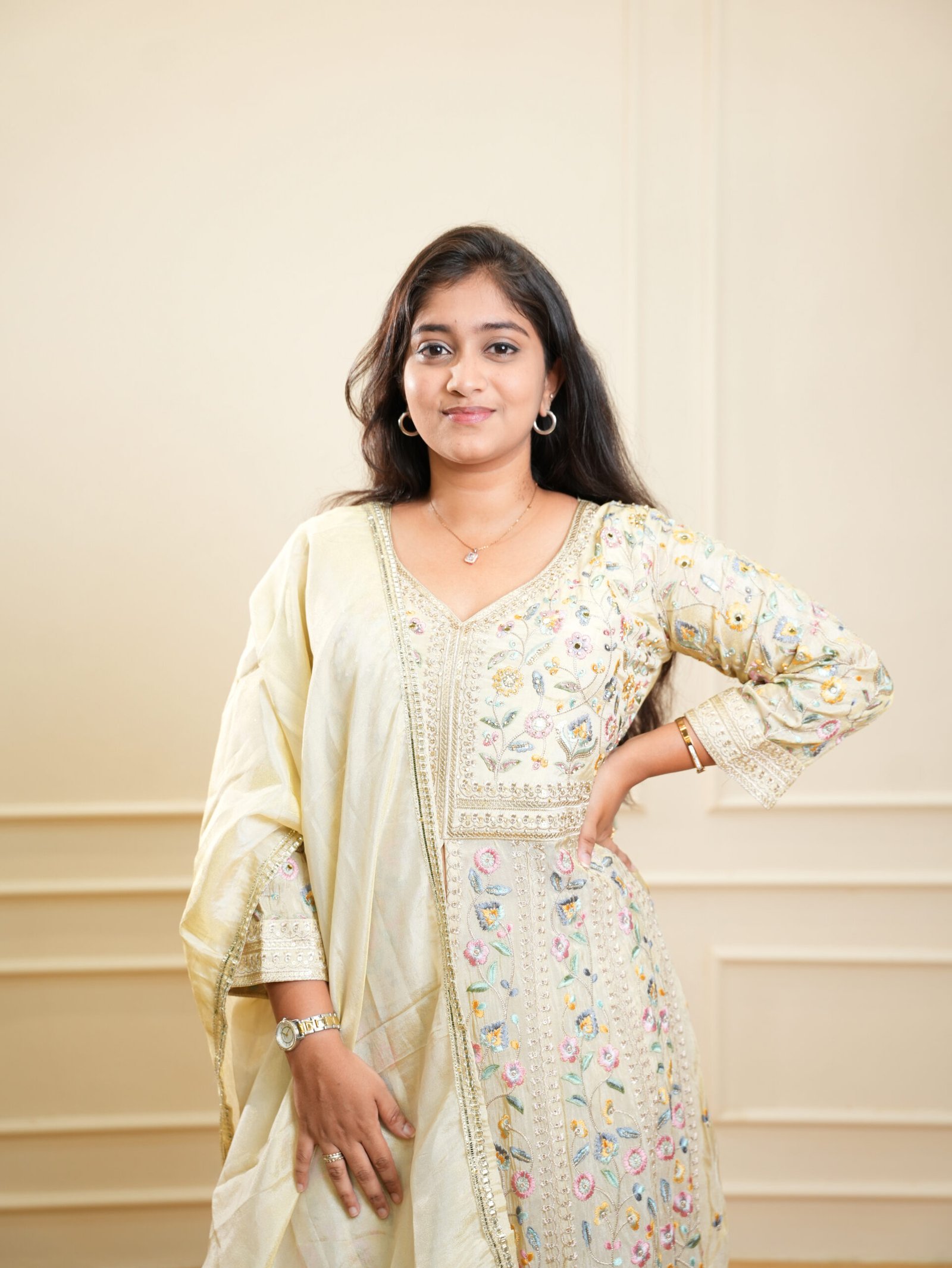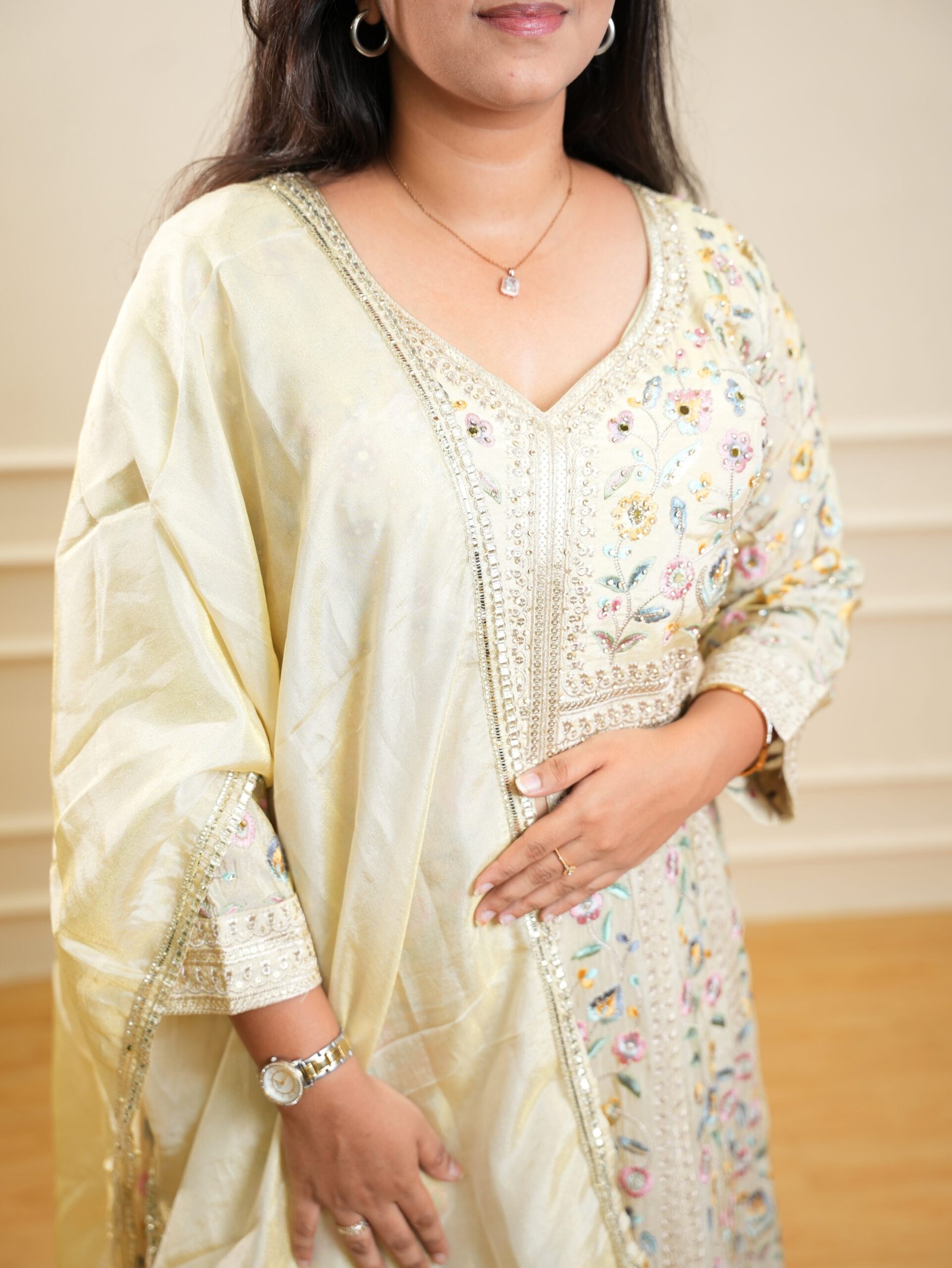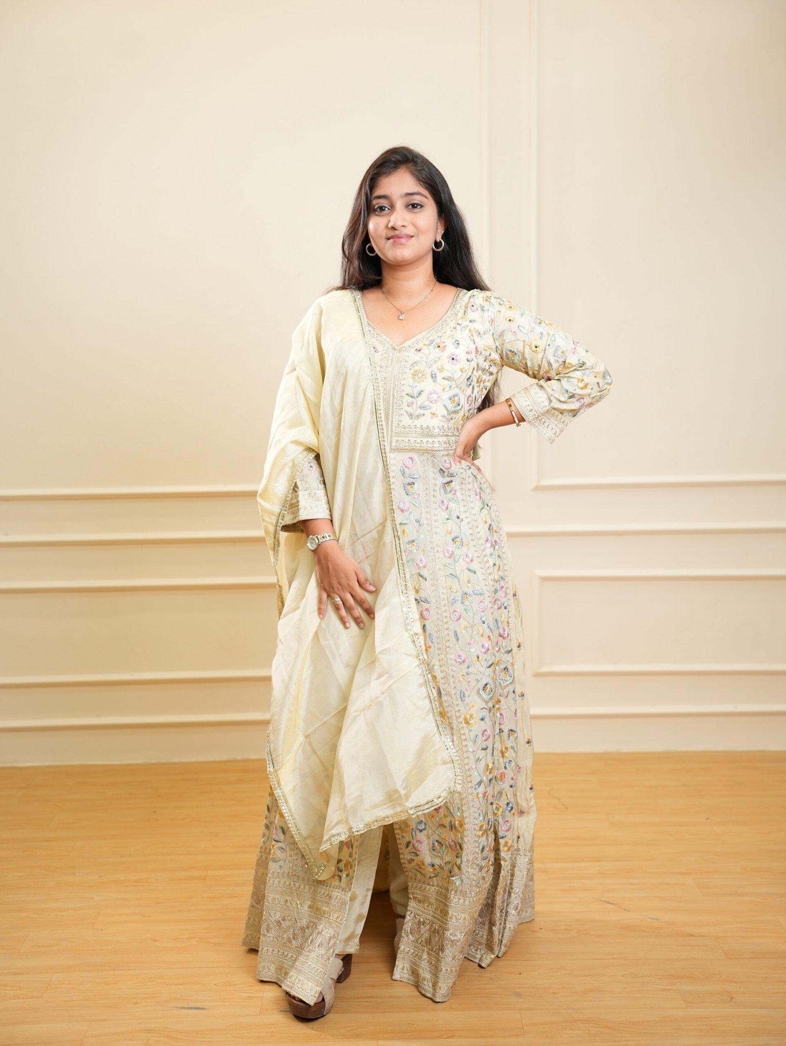 - Flared Anarkali silhouette for graceful movement