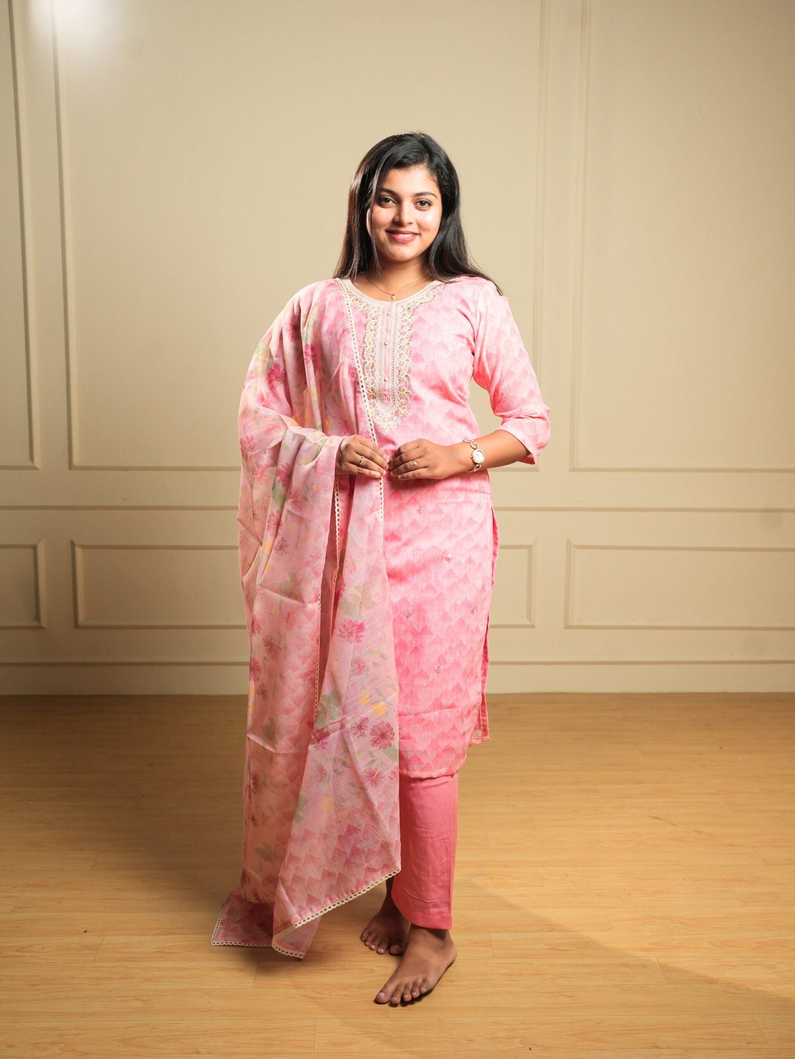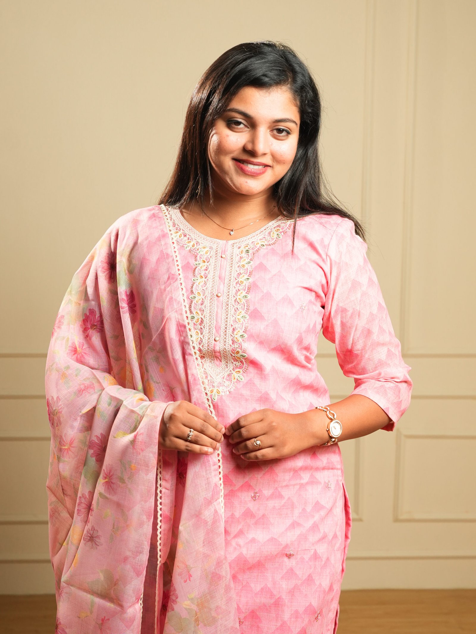Bring a touch of grace and elegance to your ethnic wardrobe with this Light Pink Embroidered Kurti Set with Dupatta, crafted for comfort and effortless sophistication. The kurti showcases fine embroidery along the neckline and front panel, adding a subtle festive charm. Made from a breathable, lightweight fabric, the kurti ensures comfort for long hours, making it suitable for work, celebrations, and day‑to‑day wear.