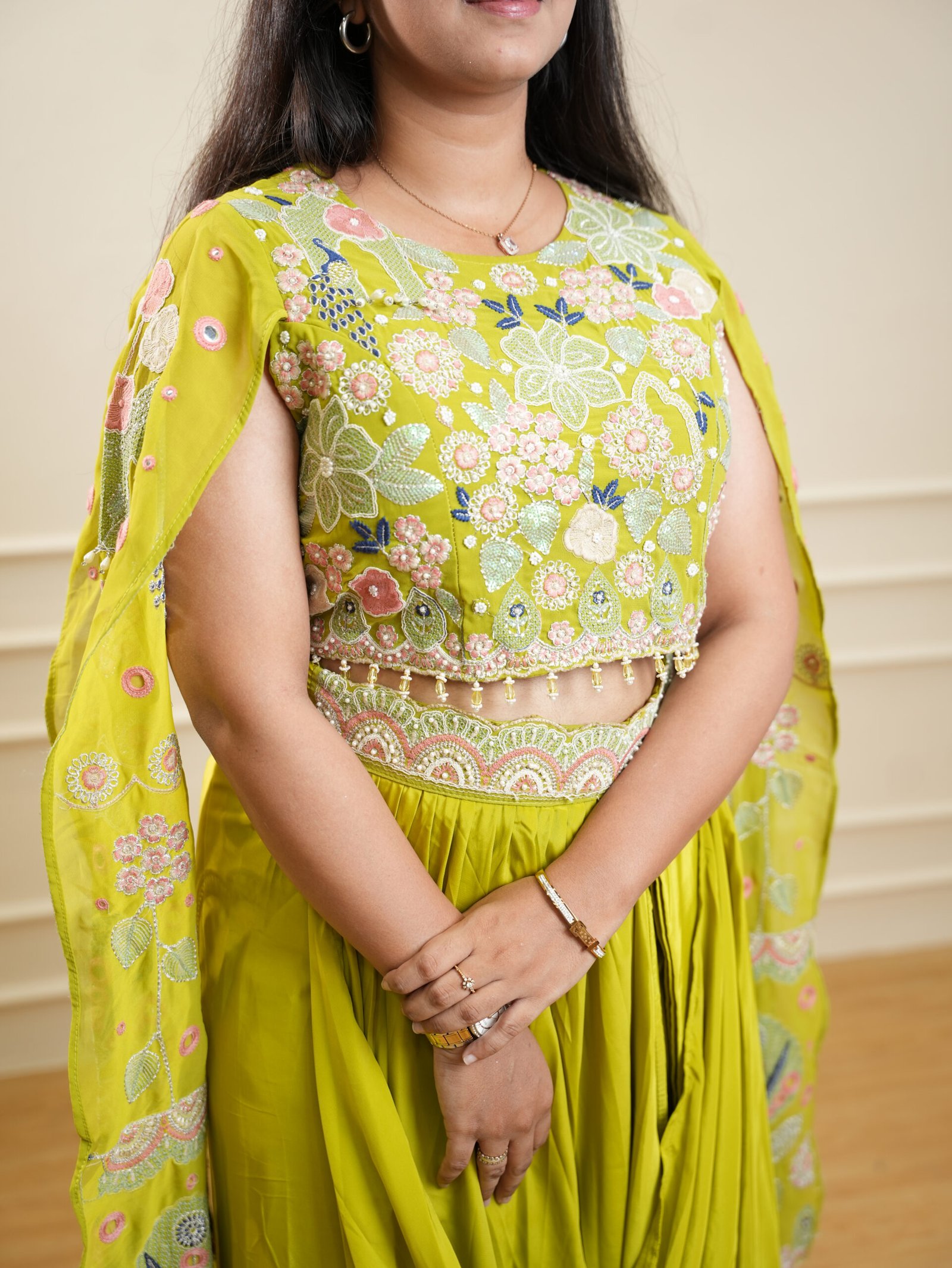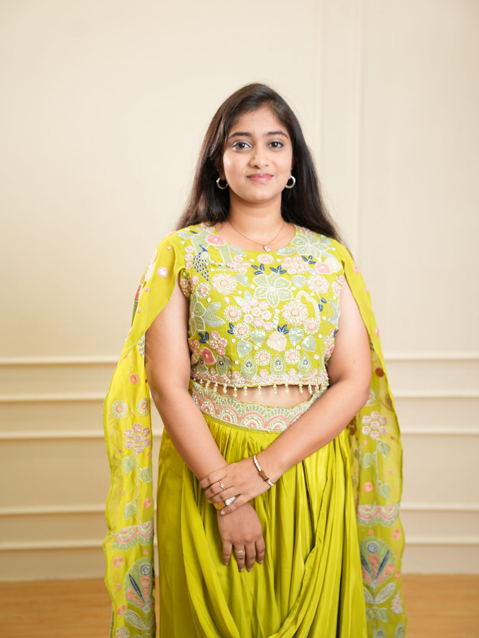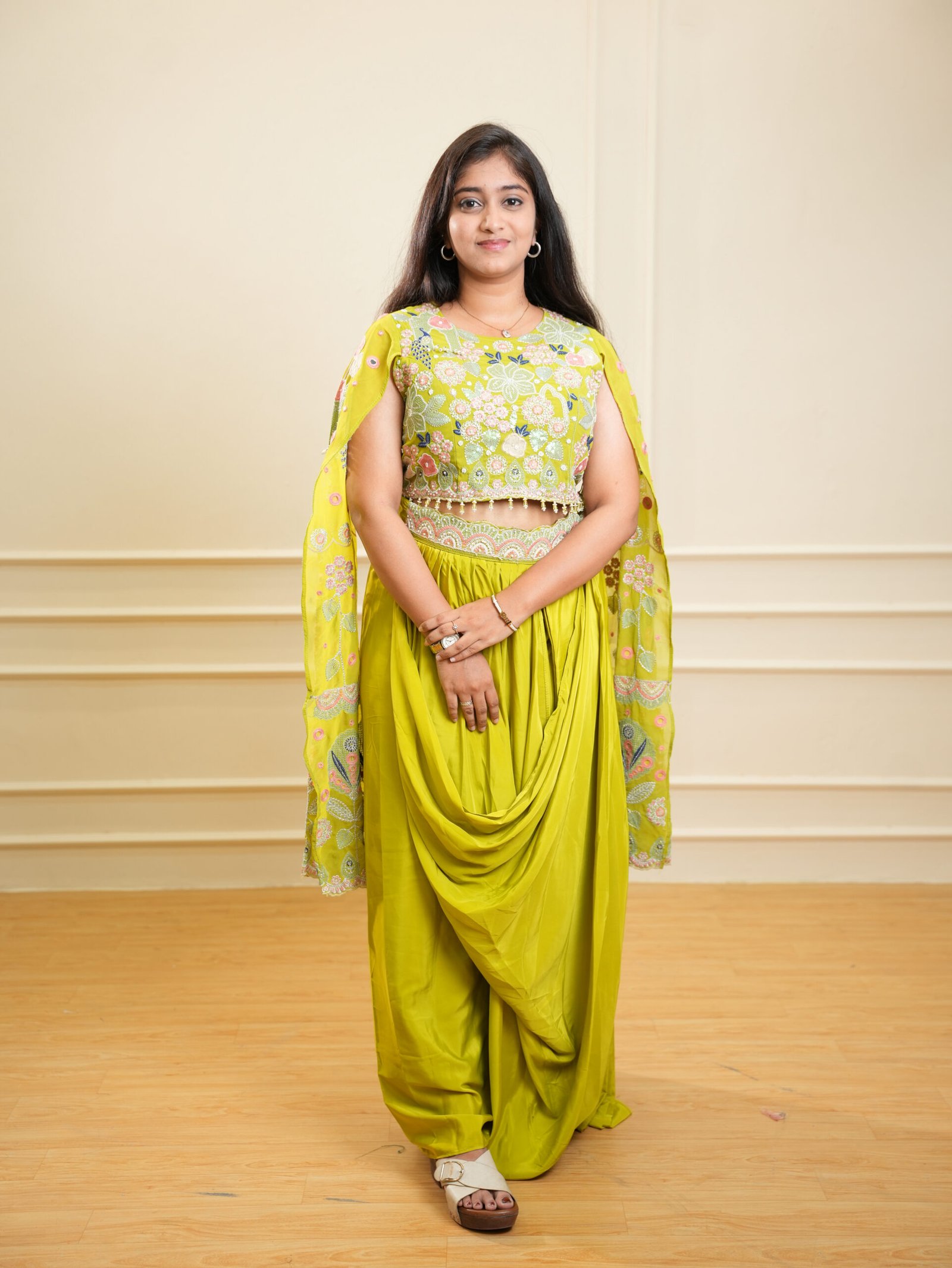 Make a bold festive statement with this lime green embroidered dhoti lehenga set, designed to blend modern silhouettes with traditional detailing. The ensemble features a beautifully embroidered blouse that adds intricate texture and craftsmanship, balanced perfectly with a draped dhoti‑style lehenga bottom for a unique and stylish look.