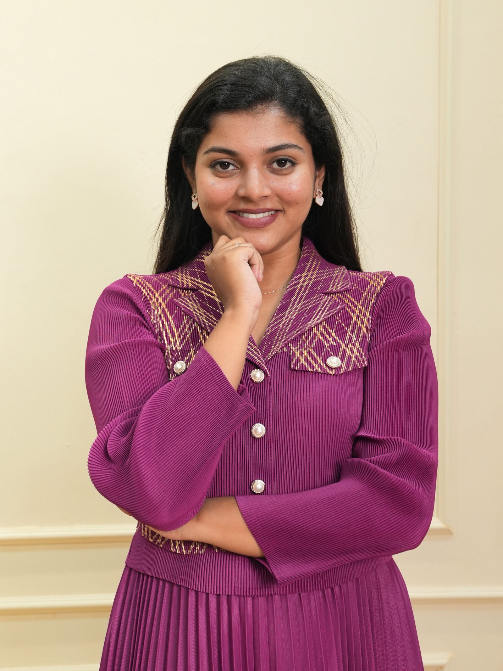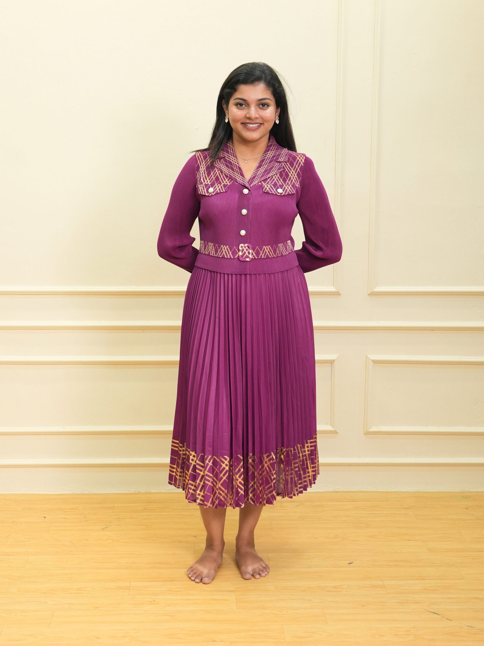 This magenta textured top with pleated midi dress combines bold color, elegant detailing, and a comfortable fit. The textured button-down top showcases fine swirl patterns paired with geometric printed accents on the collar and waistline, adding a unique and stylish contrast. The long sleeves are designed with soft structure, giving the upper half a refined and polished look.