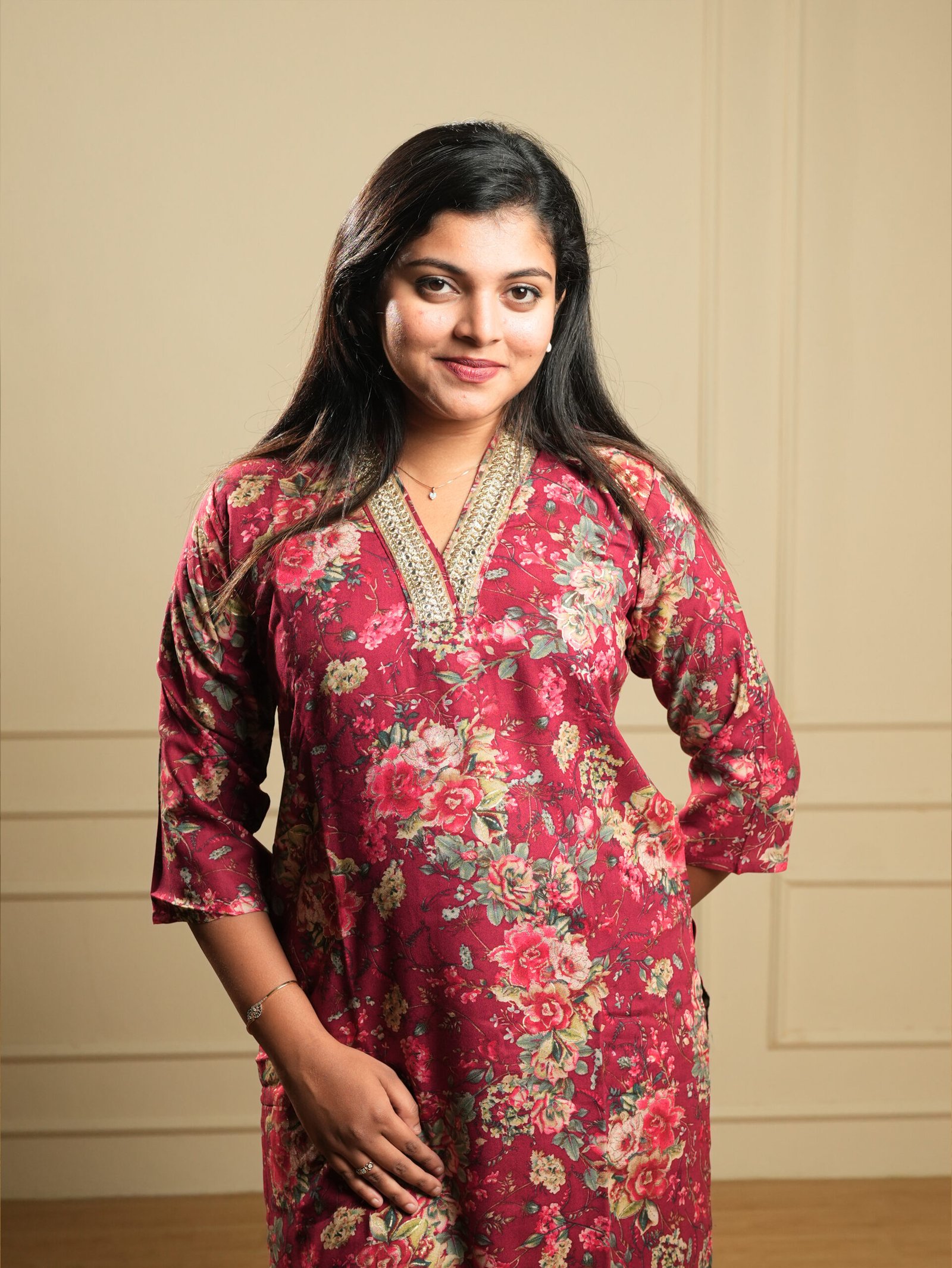 - Rich maroon base with elegant floral print
