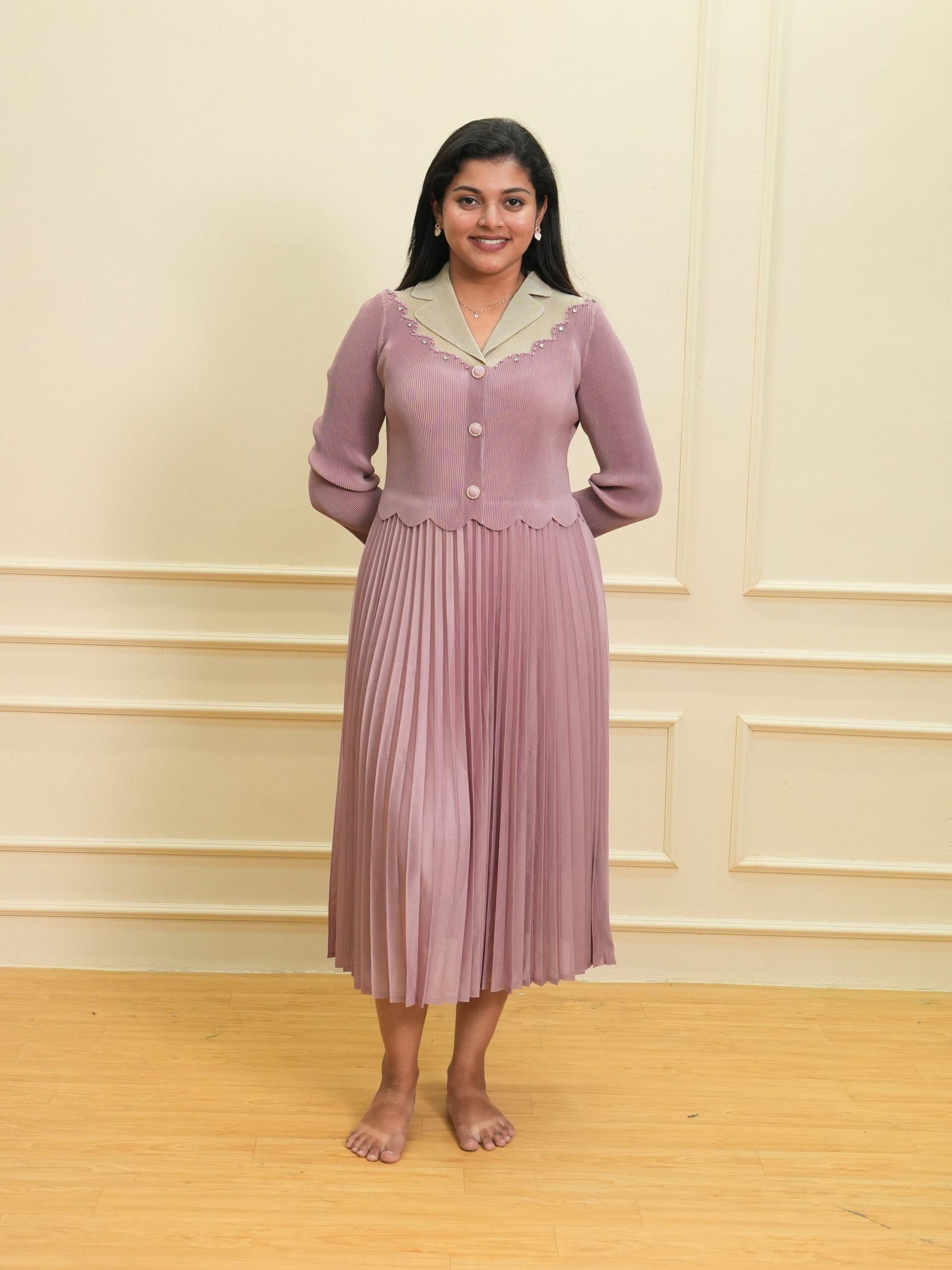 This mauve textured top with pleated midi dress offers a refined blend of comfort, structure, and sophisticated style. The upper section includes a beautifully textured button-down top with soft swirl detailing and a contrasting light beige collar, creating a subtle yet elegant design element. The sleeves feature a gently gathered structure that adds dimension without overwhelming the silhouette.