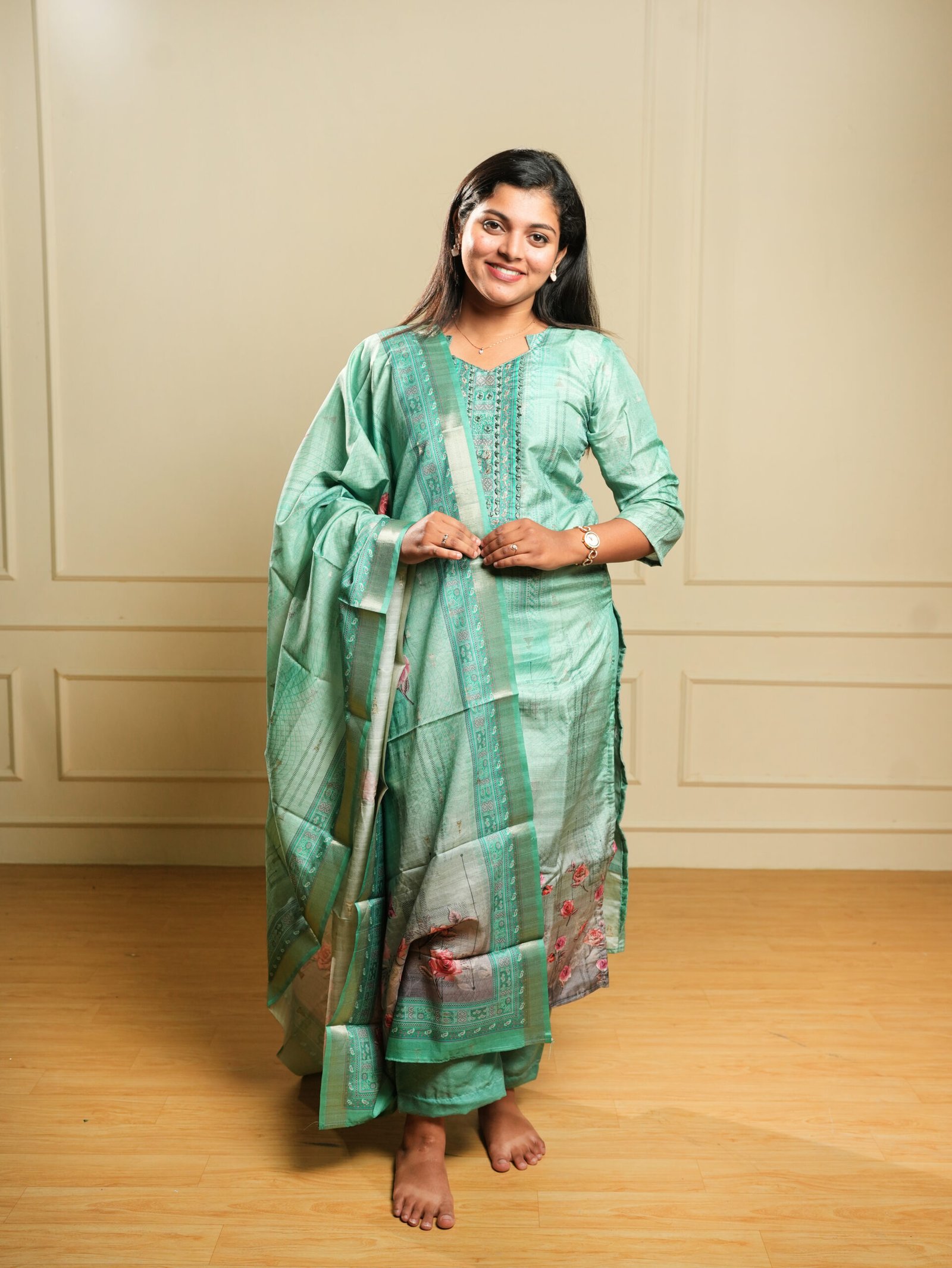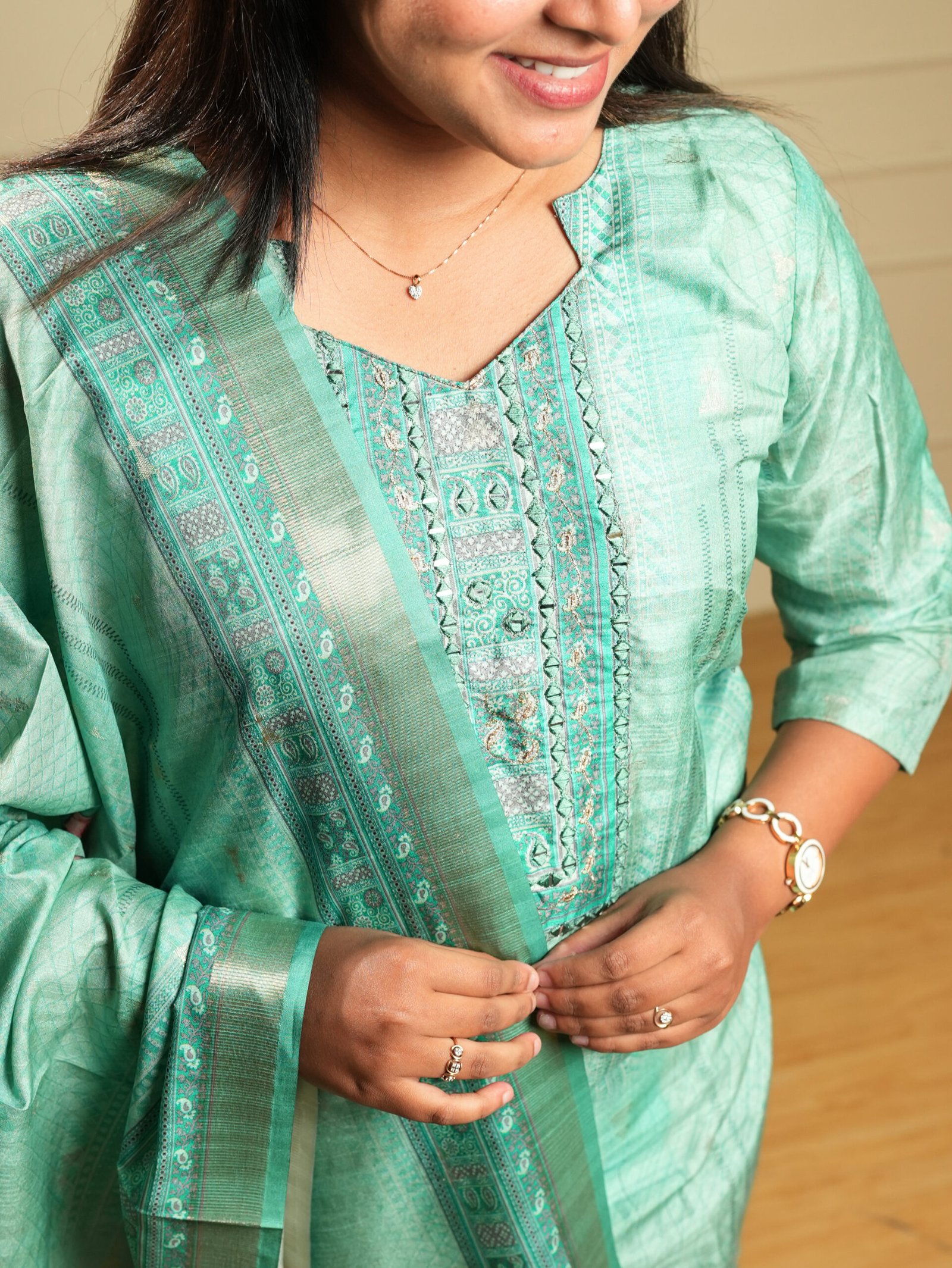 Sophisticated mint green kurta set in a lustrous silk-blend fabric, featuring an elegant mirror and thread embroidered front placket. Paired with matching wide-leg pants and a stunning floral printed Banarasi dupatta with teal zari border. A graceful fusion of traditional embroidery and rich weave craftsmanship.
