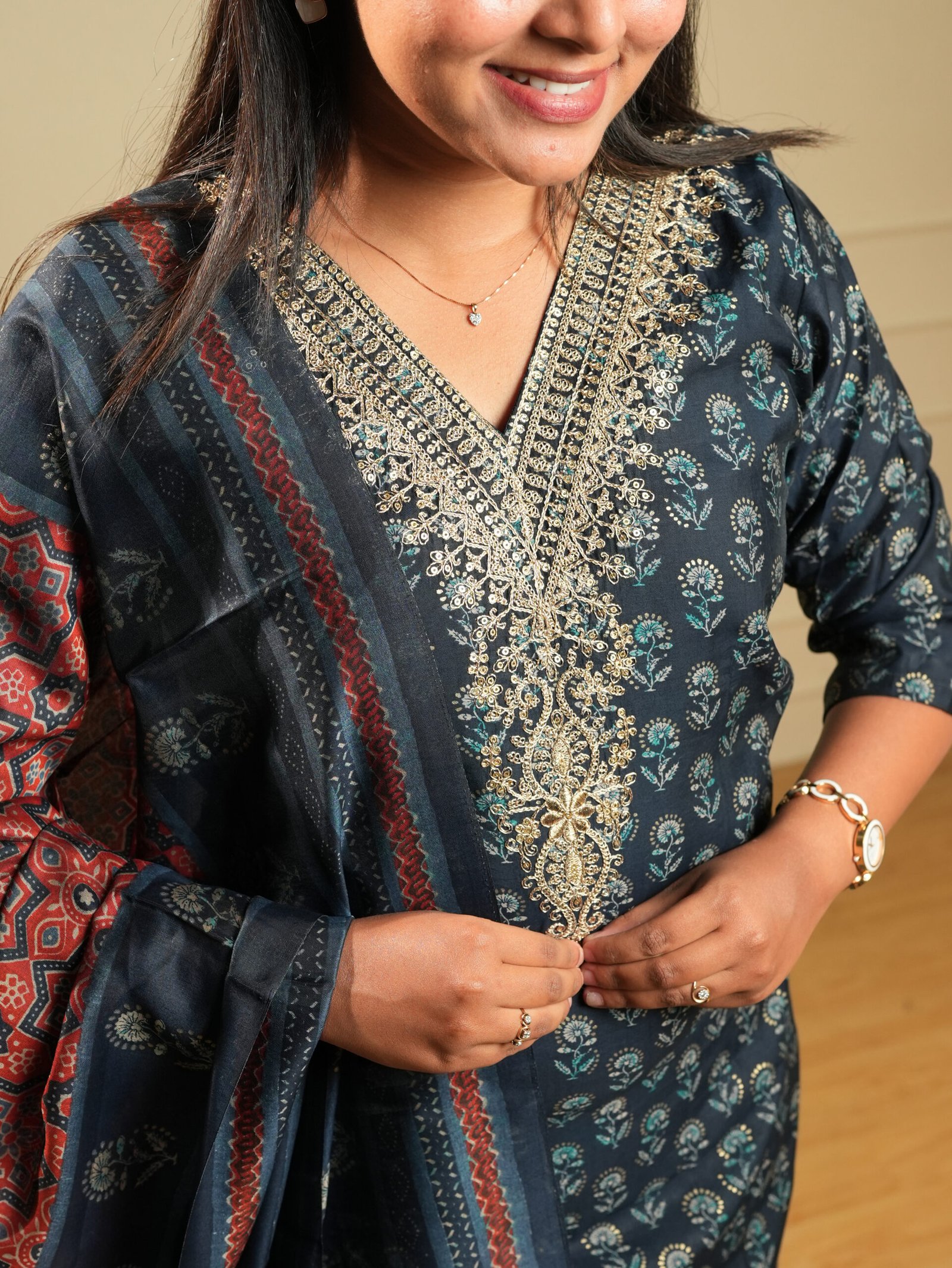 Make a bold and refined statement with this Navy Blue 3-Piece Ajrakh Block Print Kurta Set, a stunning homage to India’s rich textile heritage. The kurta showcases an all-over small floral butii block print in soft teal and beige tones against a deep navy base, giving it a classic yet contemporary ethnic appeal.
