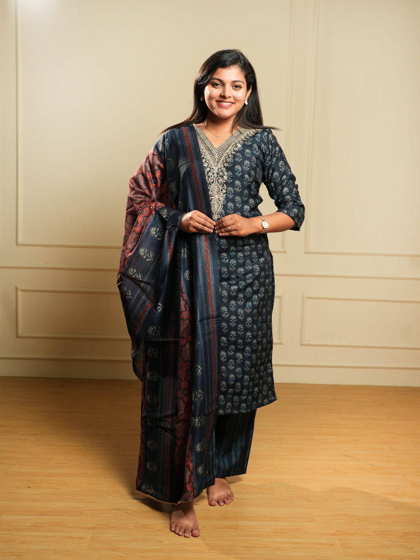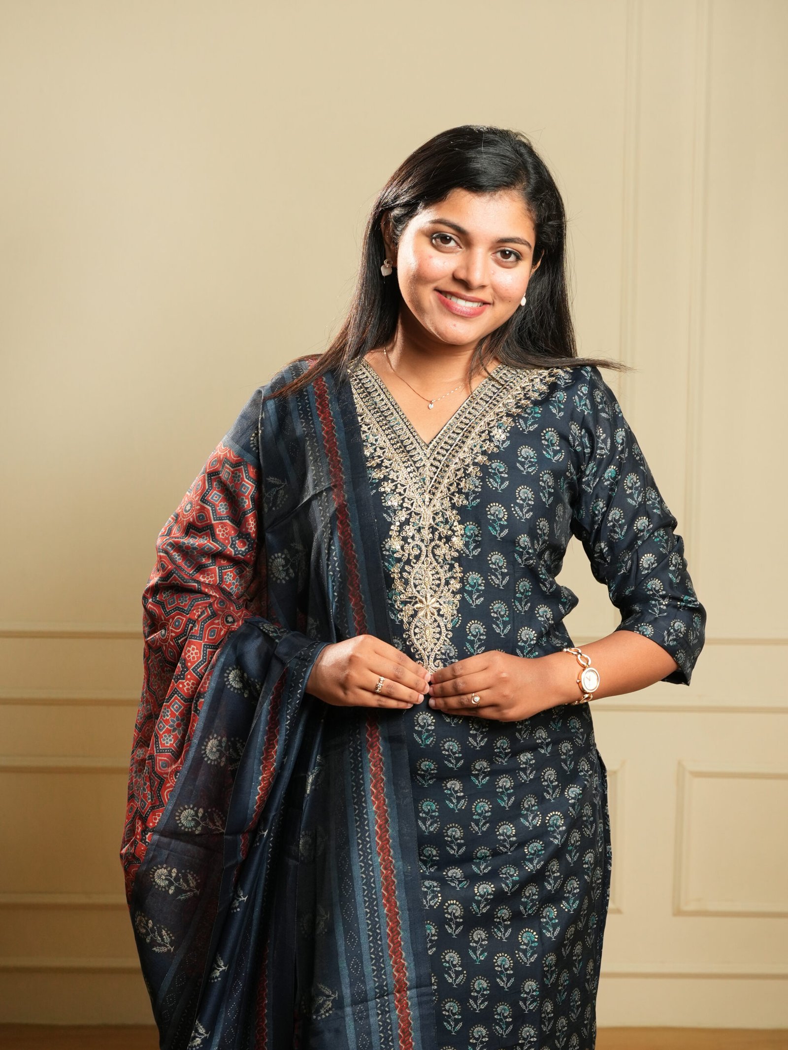 - Dupatta: Ajrakh block printed dupatta with navy, red, and beige geometric floral motifs and bold striped border