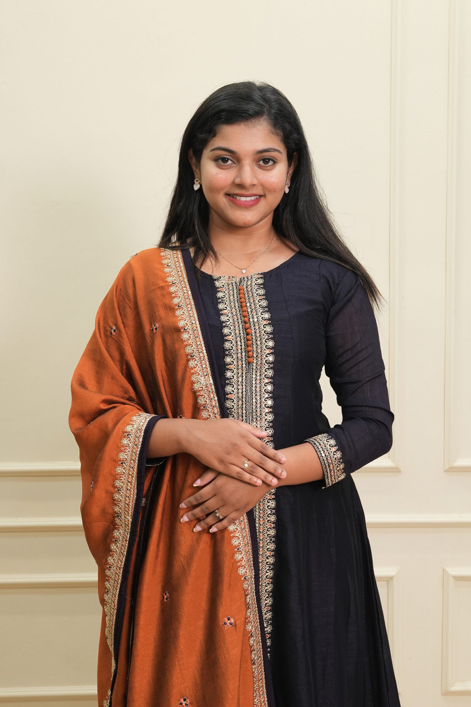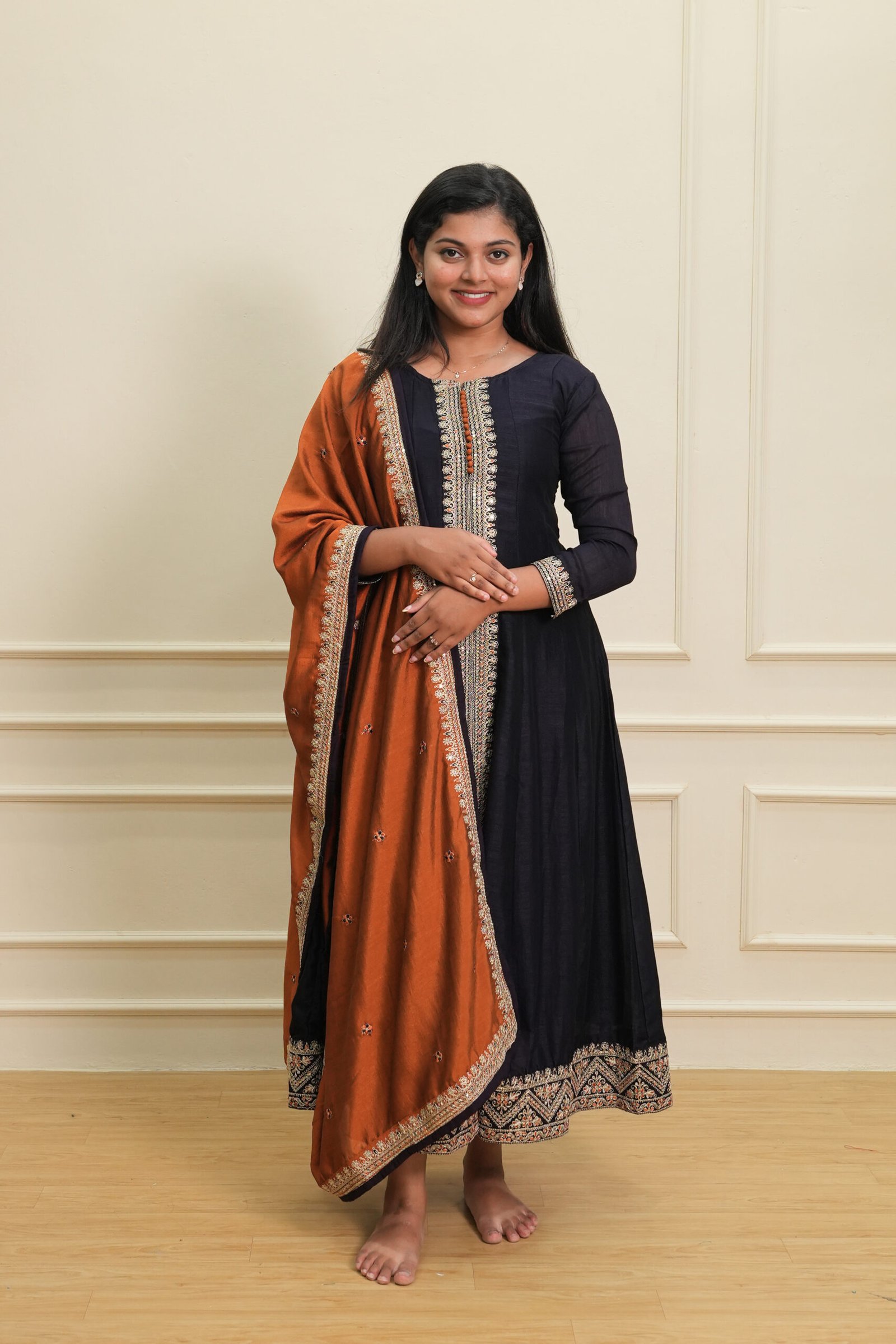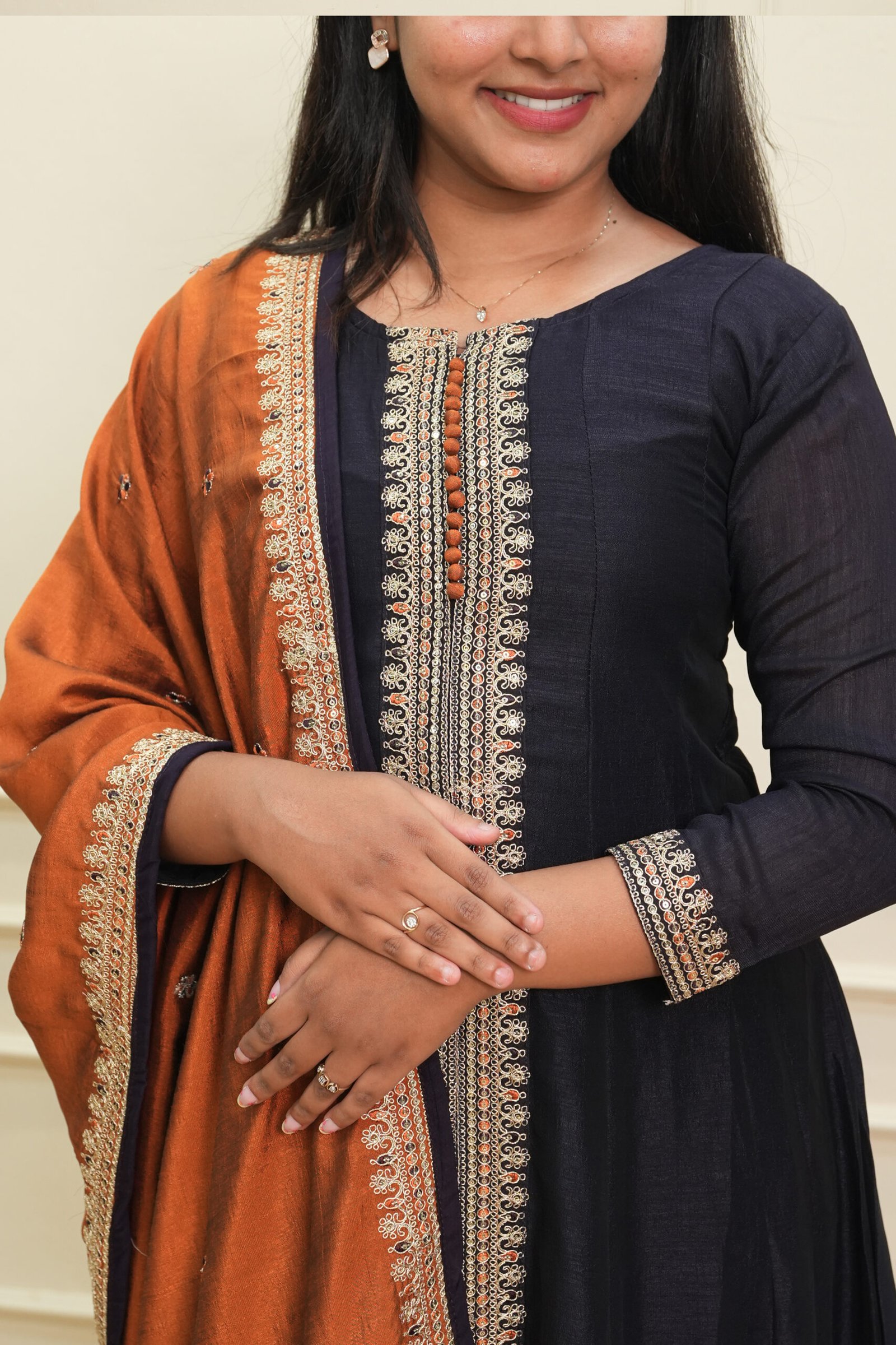 This navy blue embroidered suit set offers a refined and traditional look ideal for festive celebrations, special gatherings, and cultural functions. The kurta features beautiful embroidery along the neckline, front panel, sleeves, and hemline, adding richness and elegance to the deep navy tone. Its straight‑cut silhouette ensures comfort, style, and ease of movement for all‑day wear.