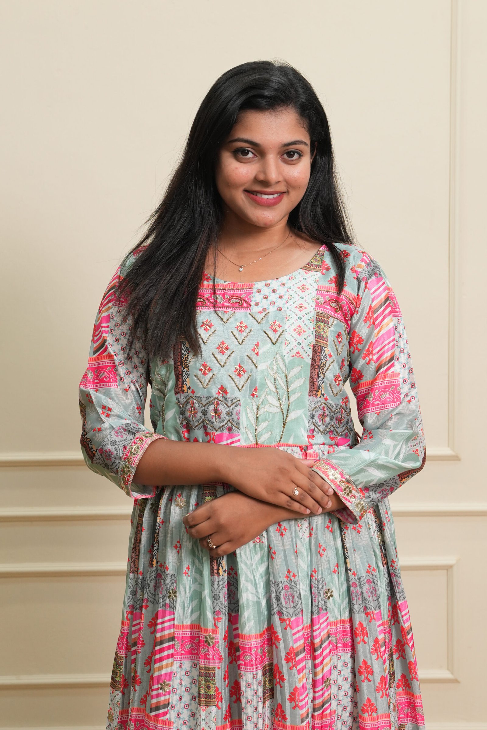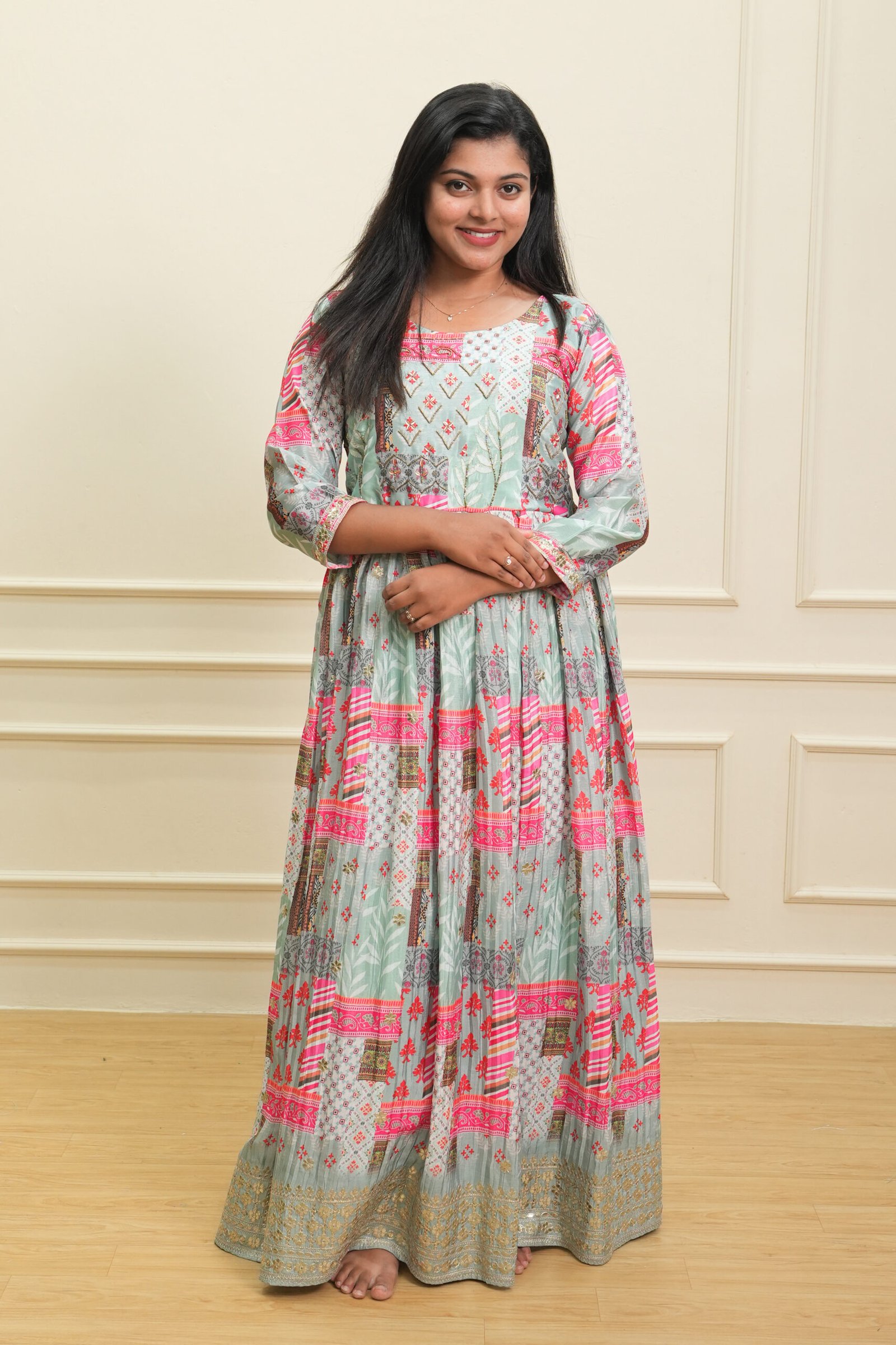 This pastel green and pink printed ethnic maxi dress combines vibrant cultural charm with a soft, modern pastel palette. The dress showcases intricate all-over ethnic motifs in coordinated patterns, creating a visually rich and festive appearance. The 3/4 sleeves add a modest, elegant touch, while the round neckline maintains a classic and comfortable fit.