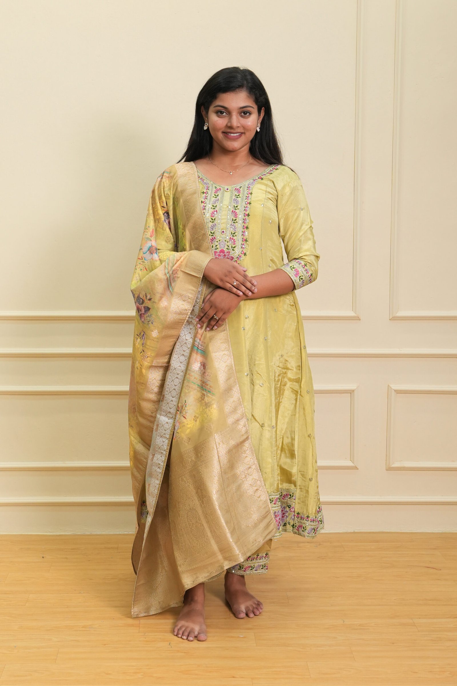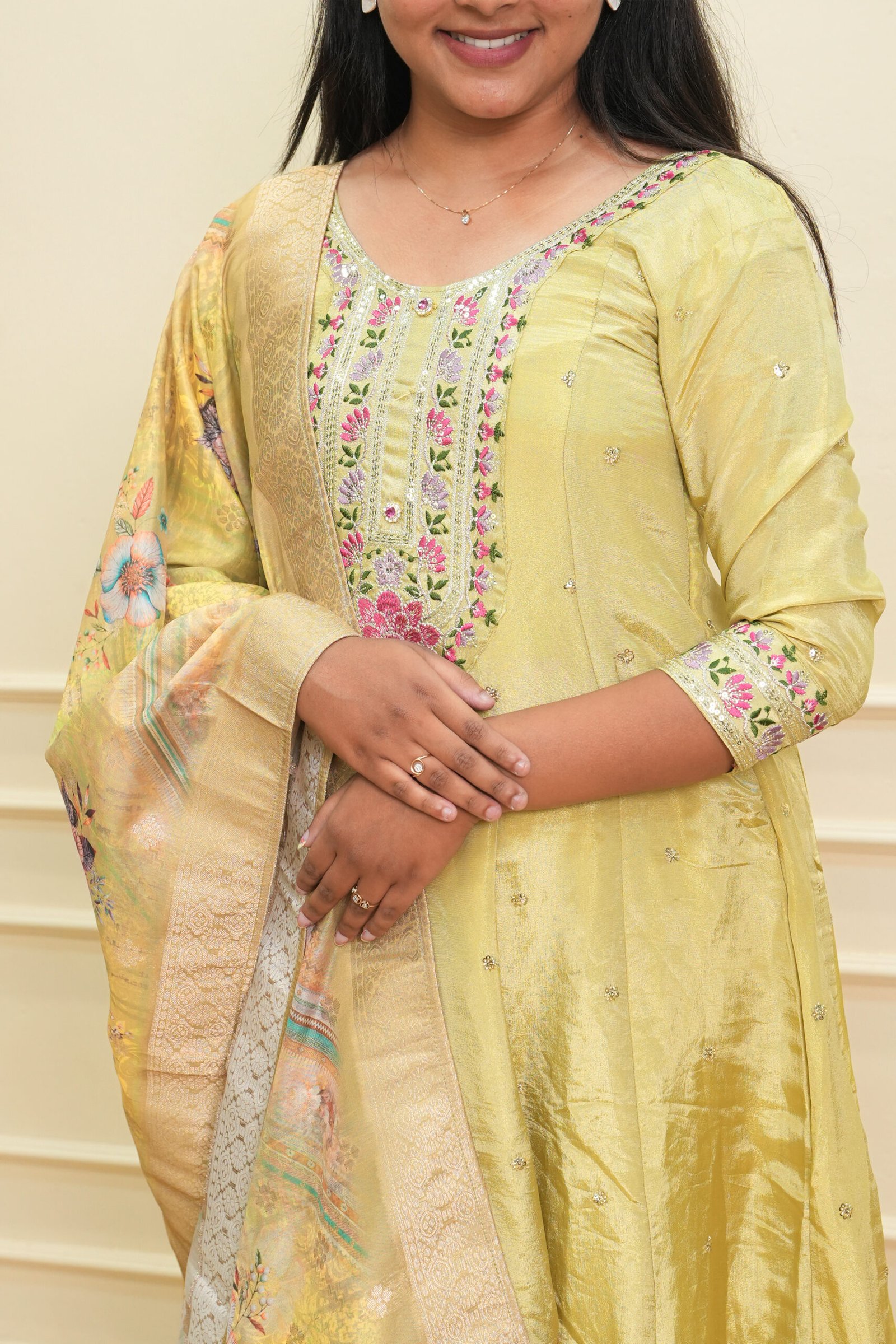 This pastel yellow embroidered Anarkali suit set is designed to offer elegance and charm for festive and celebratory occasions. The Anarkali features intricate embroidery along the neckline, bodice, sleeves, and hemline, adding beautiful handcrafted detailing that enhances the pastel tone. The flared silhouette provides a graceful fall, creating a refined and traditional look suitable for day and evening events.