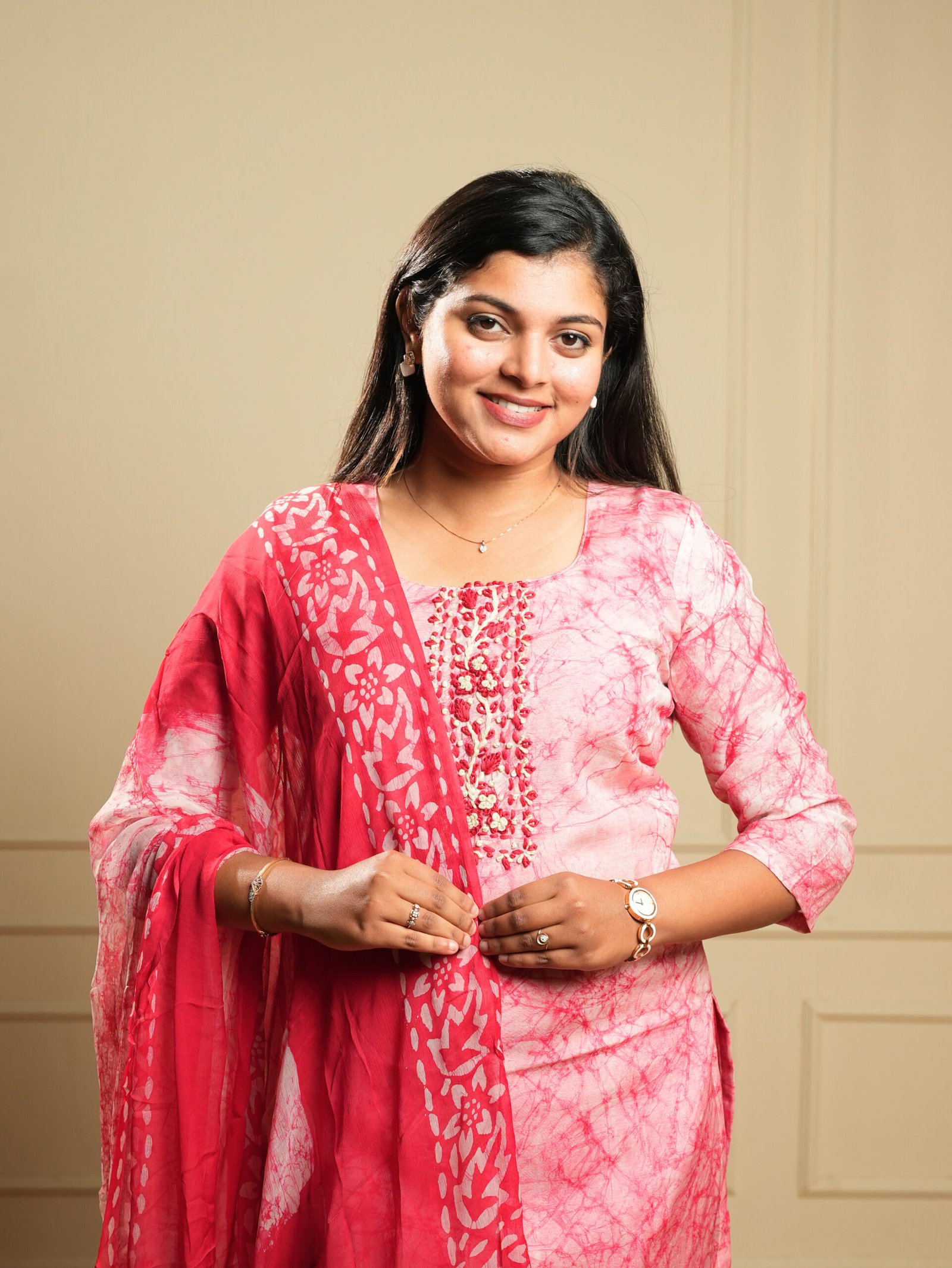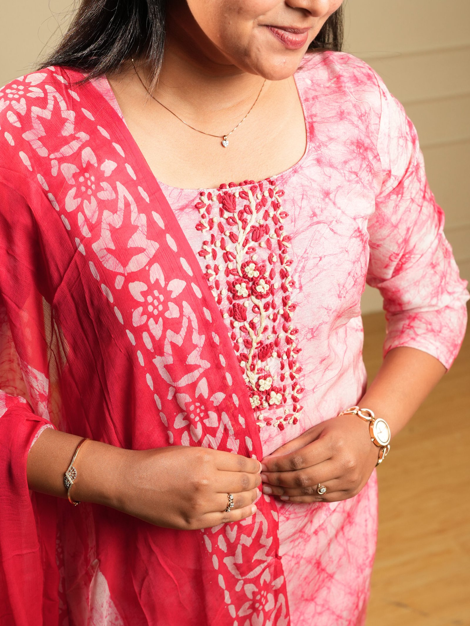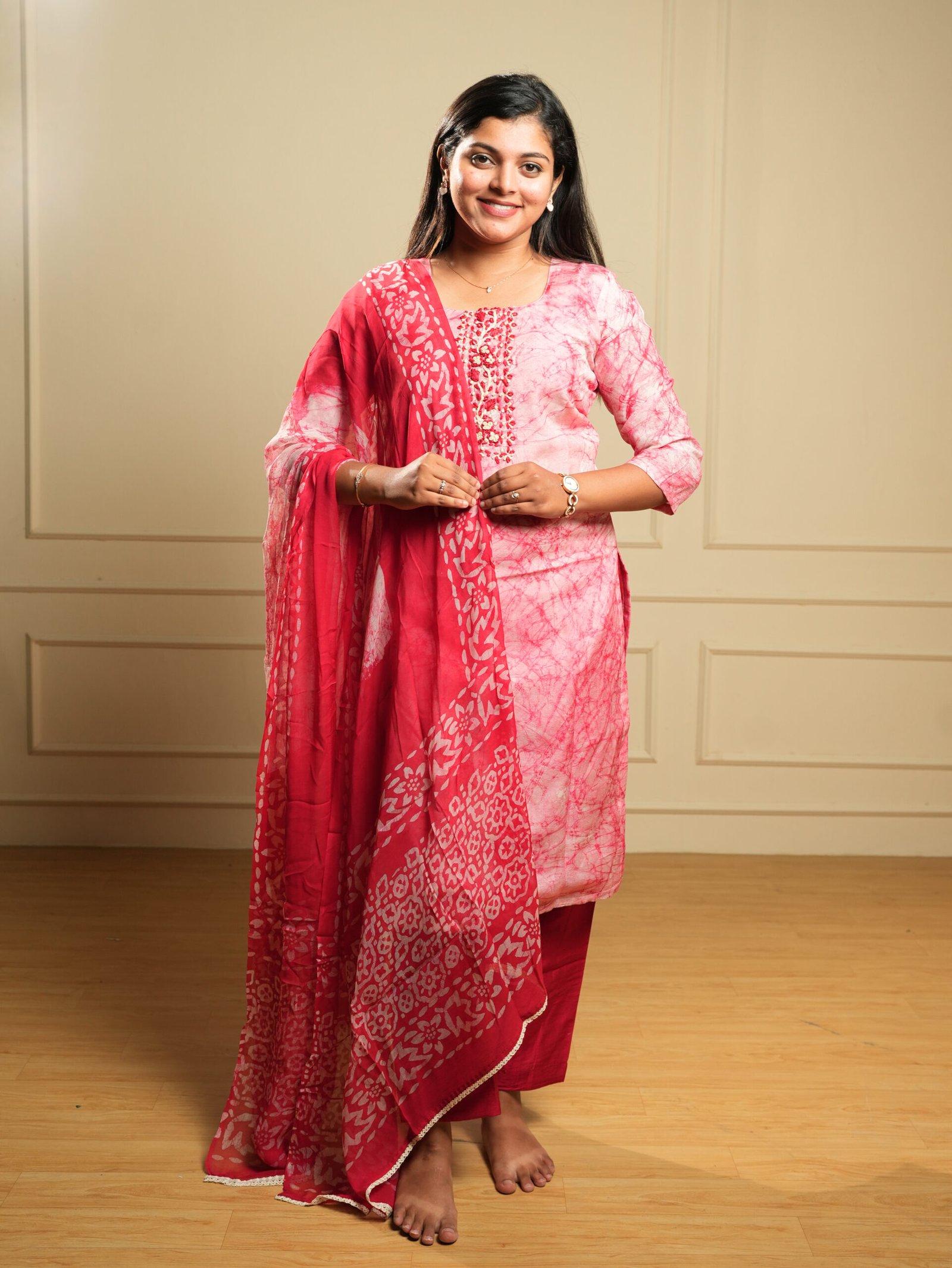 Celebrate the art of traditional Indian textile crafts with this Pink & Red 3-Piece Batik Tie-Dye Kurta Set, a vibrant and soulful ensemble that effortlessly blends artisanal charm with festive elegance. The kurta features a stunning all-over batik/shibori tie-dye pattern in soft pink and white tones, creating a naturally organic, hand-crafted appearance unique to every piece.