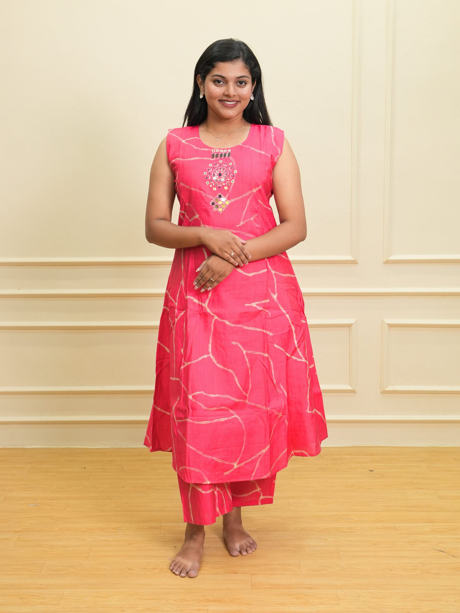 This eye‑catching pink sleeveless kurta set blends comfort with statement style. Designed with a soft, breathable fabric, the kurta features an elegant abstract print that adds a contemporary charm. The highlight of the outfit is the beautifully embellished neckline, adding a touch of festive sophistication. The flared silhouette offers graceful movement, while the matching printed bottoms complete the coordinated look.