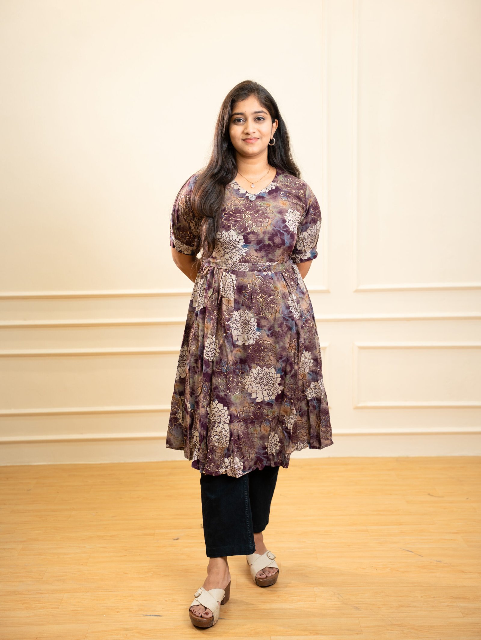 Add a touch of elegance to everyday dressing with this purple floral printed tunic set, designed for comfort, versatility, and modern ethnic styling. The tunic features delicate floral motifs spread evenly across the fabric, creating a balanced and graceful visual appeal