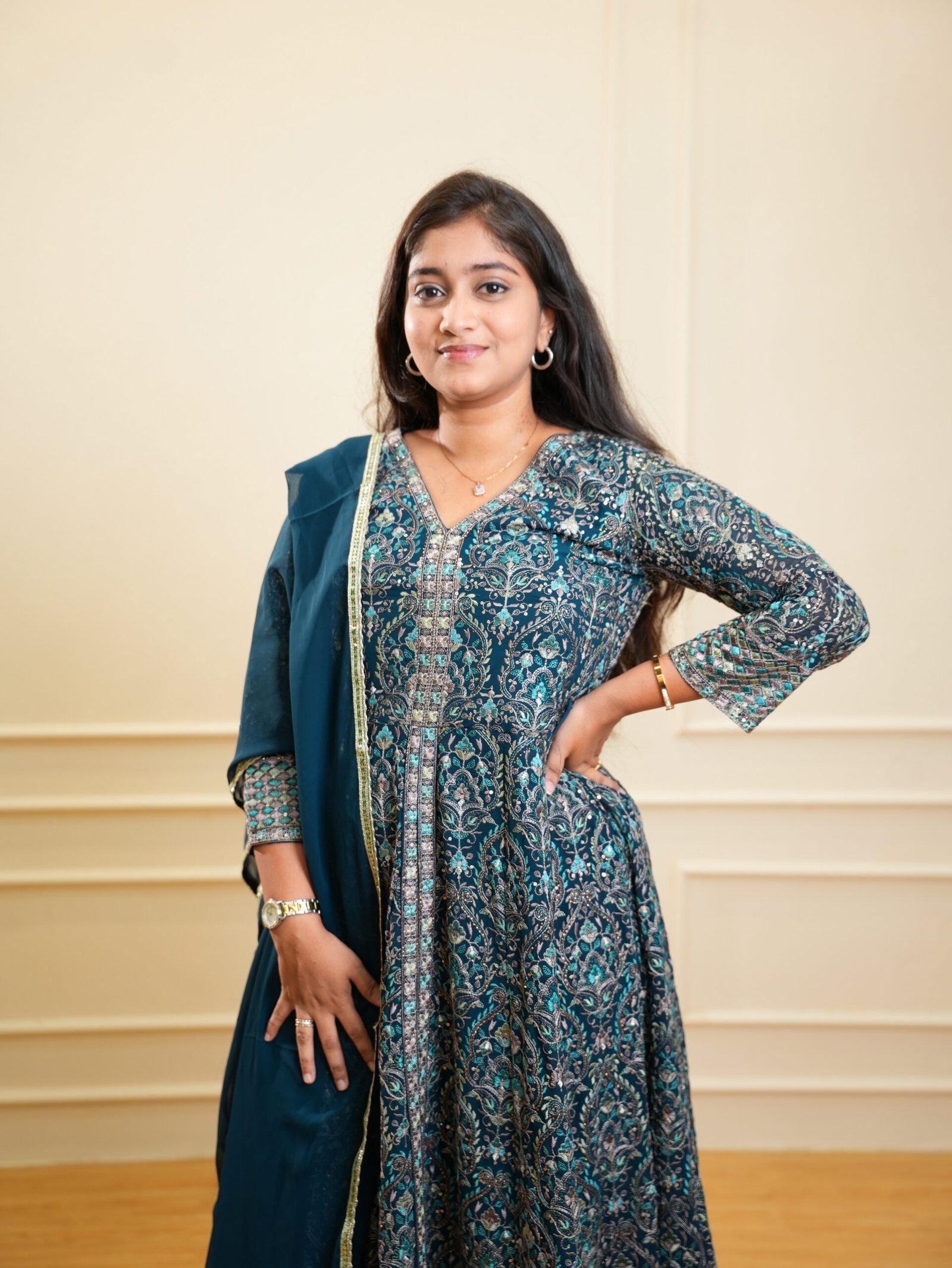 - Flared Anarkali silhouette for graceful movement