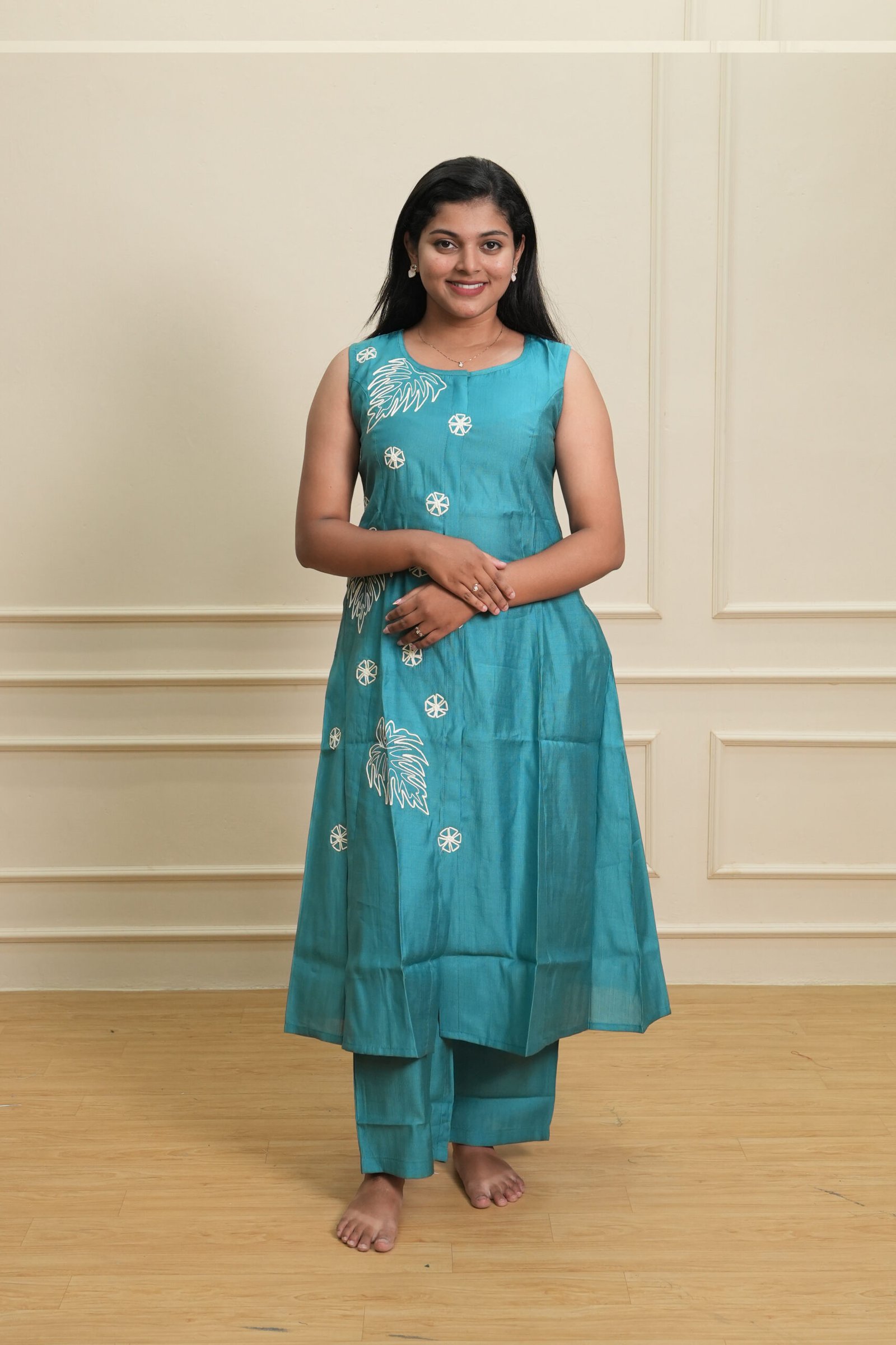 This teal blue sleeveless printed kurti set blends effortless elegance with everyday comfort. The kurti features a sleeveless design with a relaxed straight fit, providing ease of movement and a contemporary look. The printed detailing across the front adds a touch of charm while keeping the outfit simple and versatile.