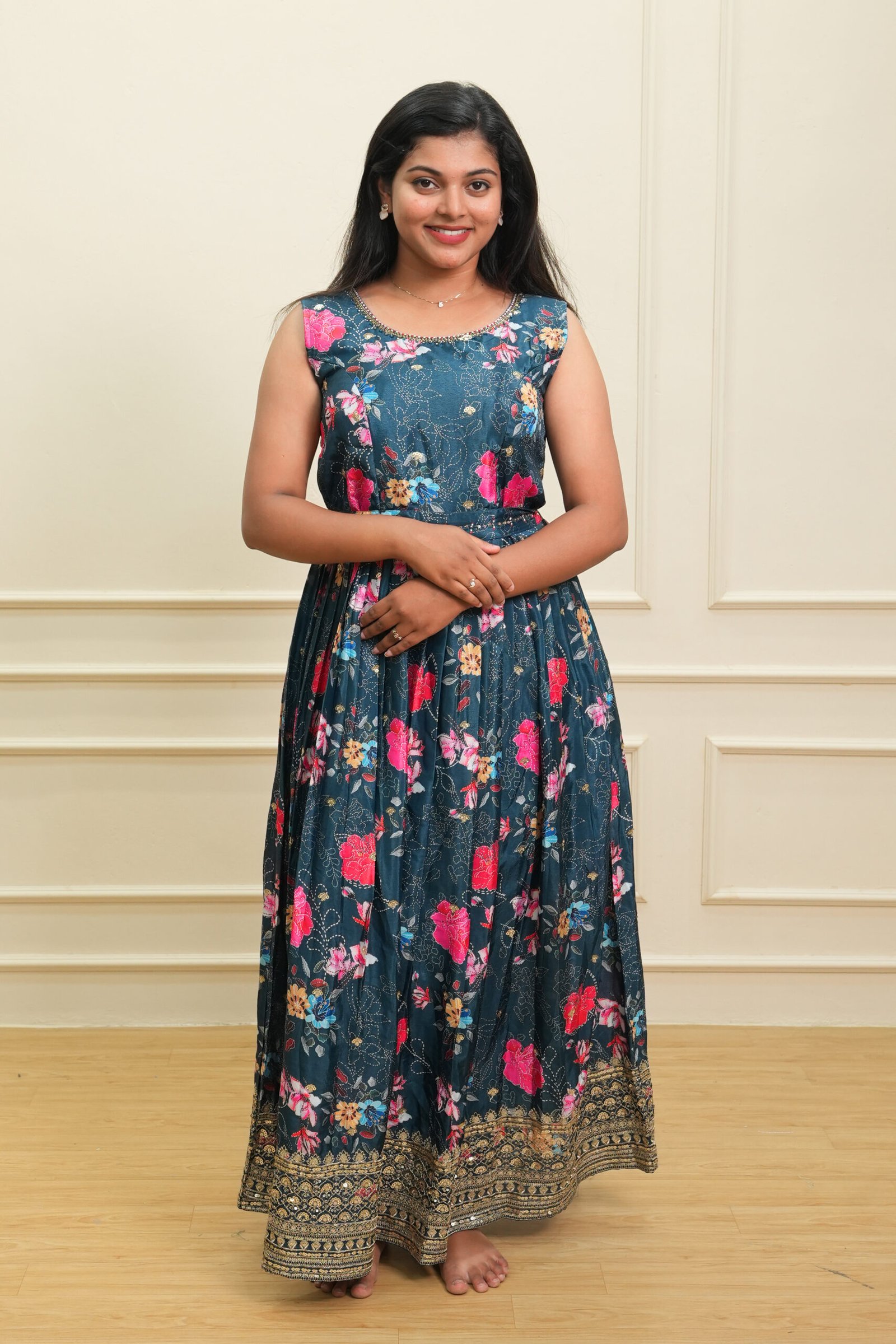 This teal floral sleeveless maxi dress blends elegance with everyday comfort. Designed with an all‑over floral print in bright contrasting shades, the dress delivers a refreshing and vibrant aesthetic. The sleeveless bodice provides ease and versatility, making it a great choice for warm weather or layered styling.