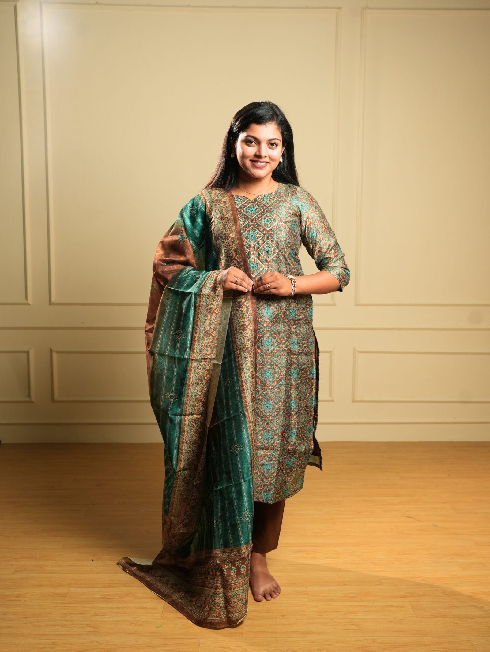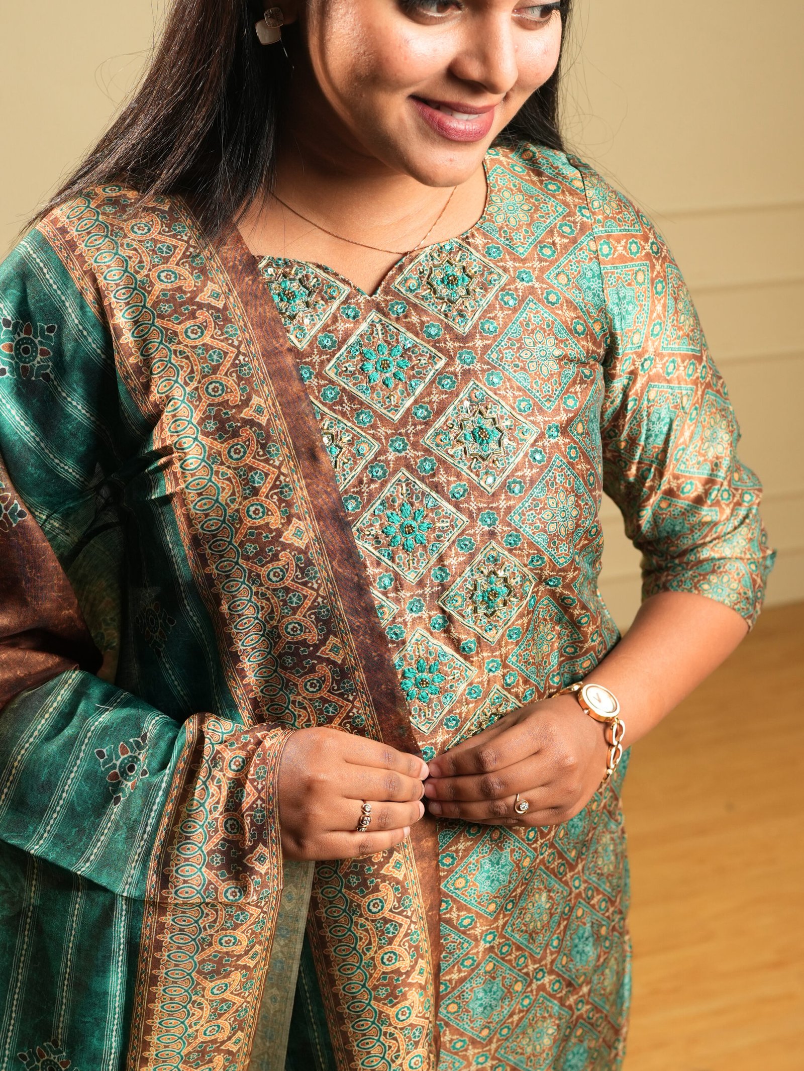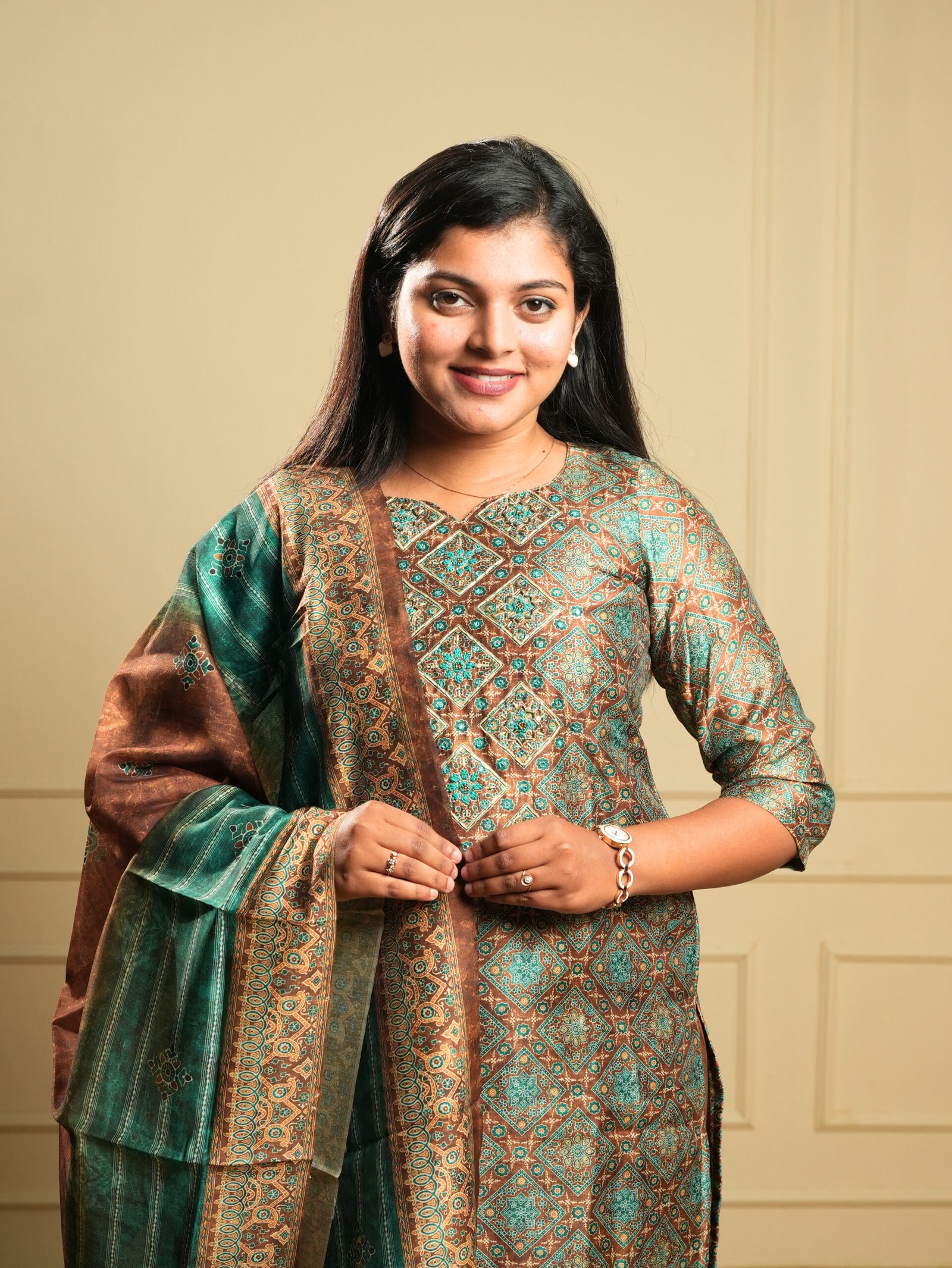 Bring home a touch of luxury with this Teal Green Brocade Printed Kurti Set with Dupatta, crafted for festive elegance and sophisticated ethnic charm. The kurti features detailed brocade-inspired prints in golden and earthy tones, adding a regal appeal suitable for celebrations and traditional events. The fabric drapes gracefully while offering comfort, making it ideal for long hours of wear.