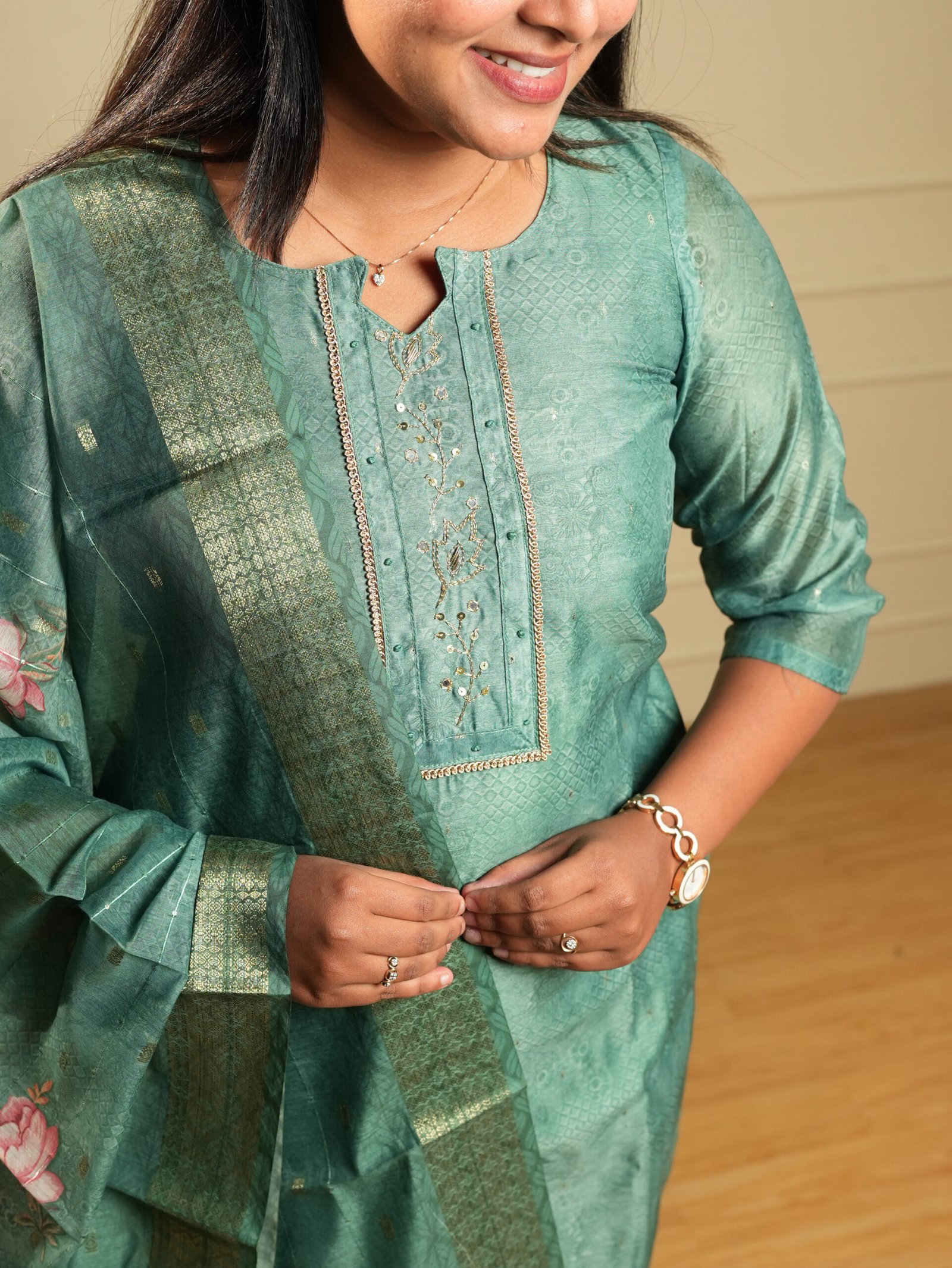 - Neckline: Round neck with embroidered yoke featuring thread, sequin, and lace trim detailing