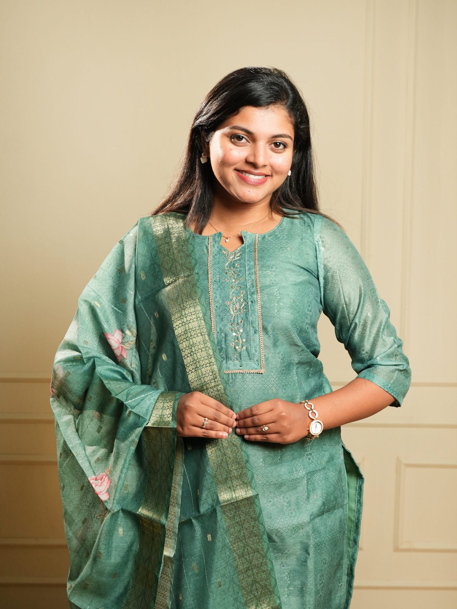 Make a lasting impression with this Teal Green 3-Piece Embroidered Kurta Set, a celebration of classic Indian craftsmanship. The kurta features a beautifully crafted embroidered yoke panel with sequin, thread, and schiffli-style detailing, framed with a delicate lace trim — giving it a refined festive appeal.