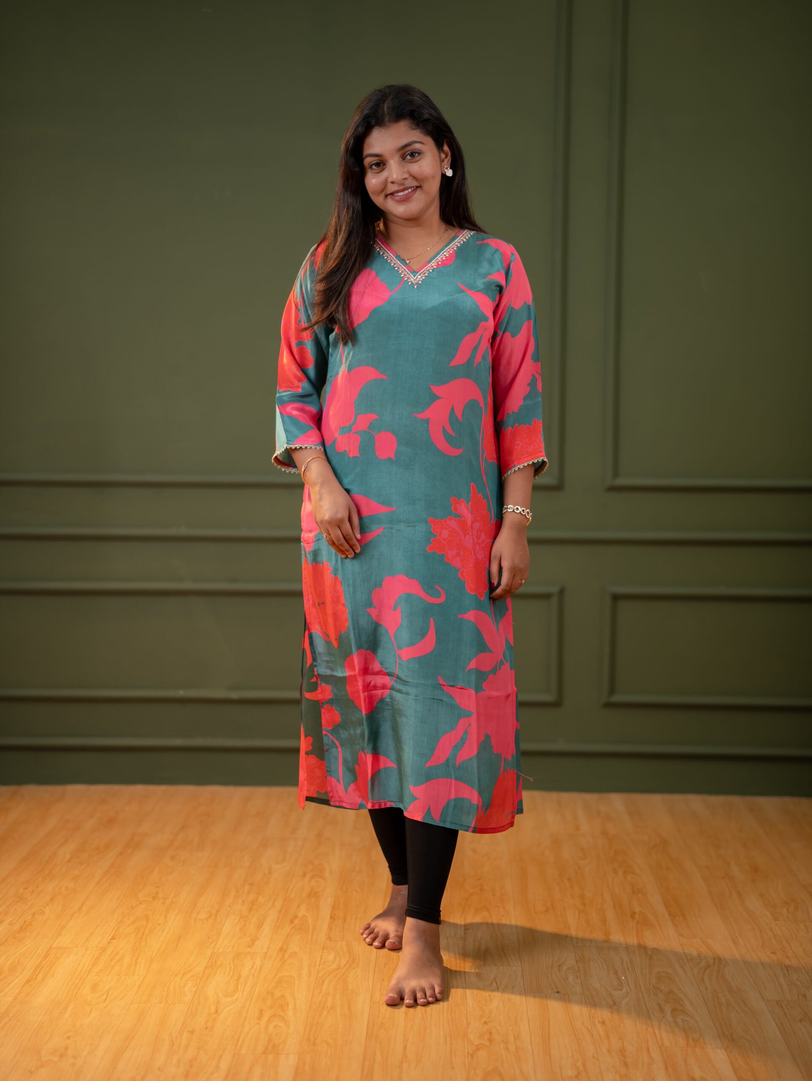 Bright, bold, and effortlessly stylish — this teal green floral kurti is designed to make everyday dressing feel special. The vibrant pink floral prints add a fresh pop of color, while the straight fit keeps the look clean and comfortable. Perfect for work, casual outings, or small gatherings, it’s a versatile addition to your ethnic wardrobe.