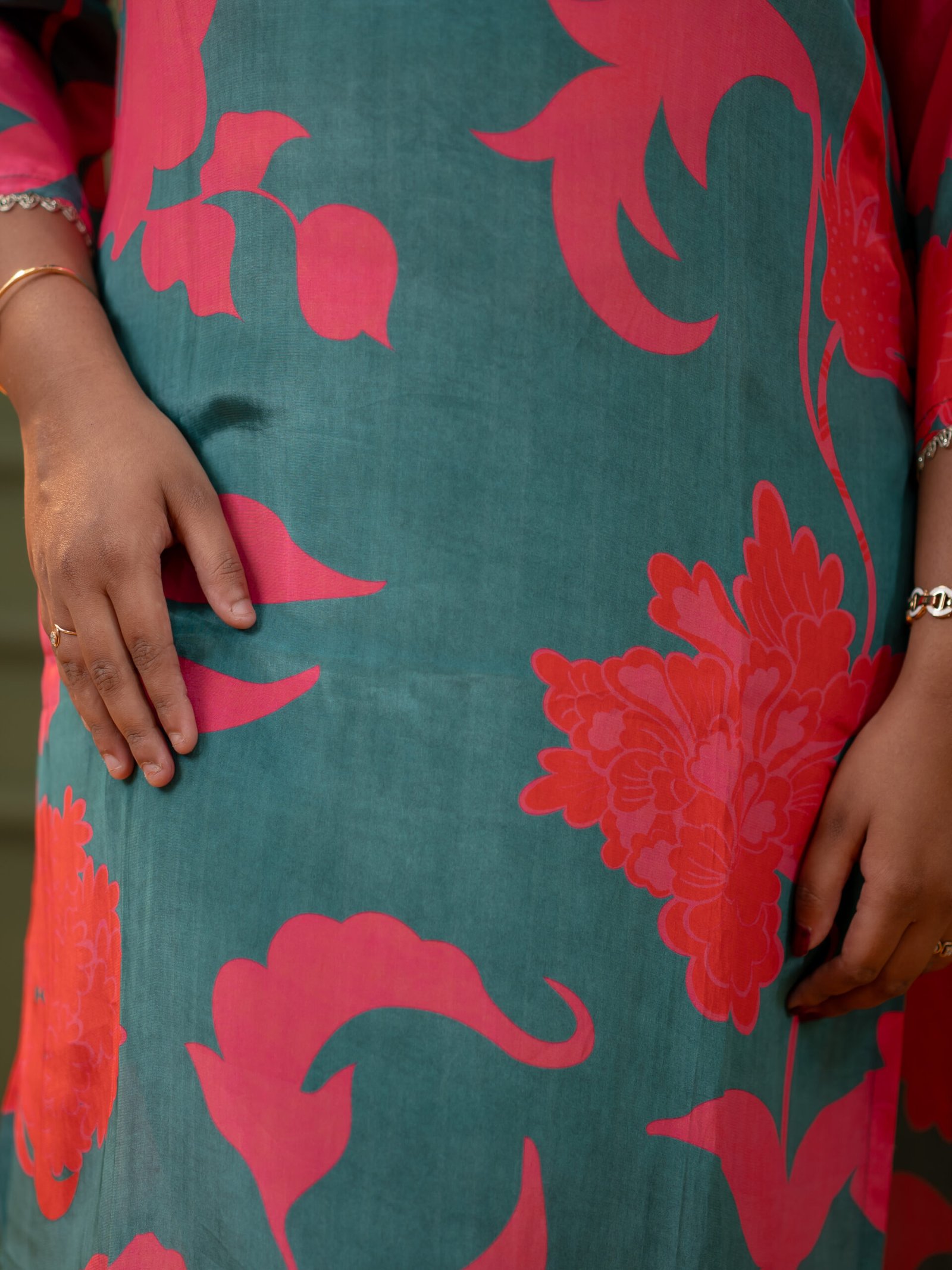 Teal green base with bold pink floral print