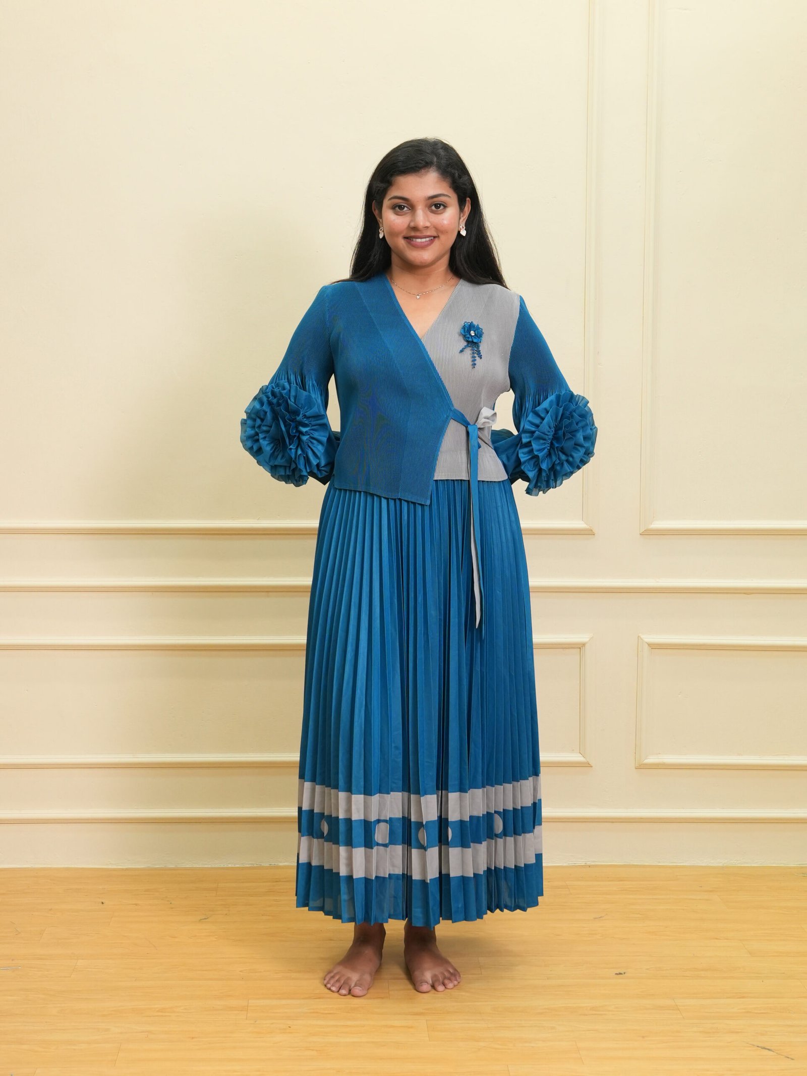 This teal and grey textured wrap top with pleated ombre maxi dress offers a perfect balance of modern design and graceful movement. The top features intricate textured swirl patterns in a wrap-style silhouette, secured with a tie-up belt for an adjustable and flattering fit. A decorative floral accent on the bodice adds a touch of sophistication. The voluminous layered ruffle sleeves create a designer statement and elevate the look.