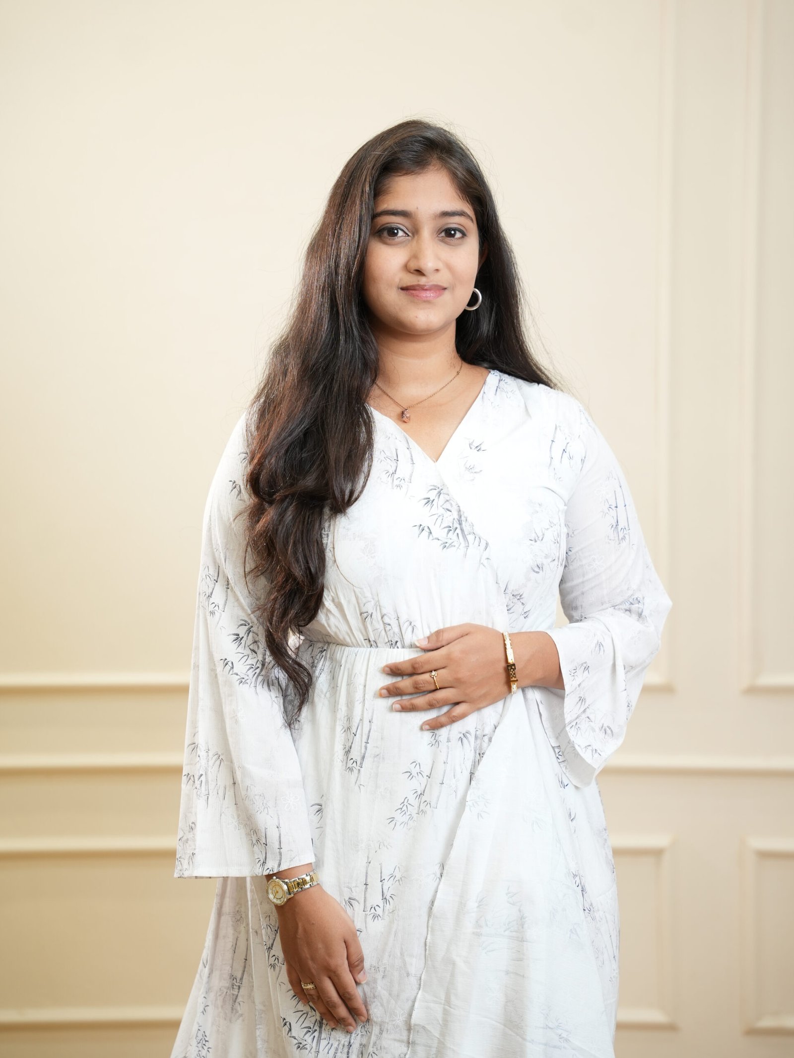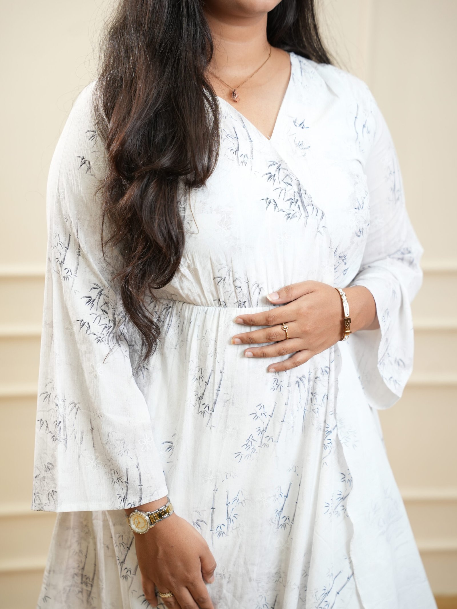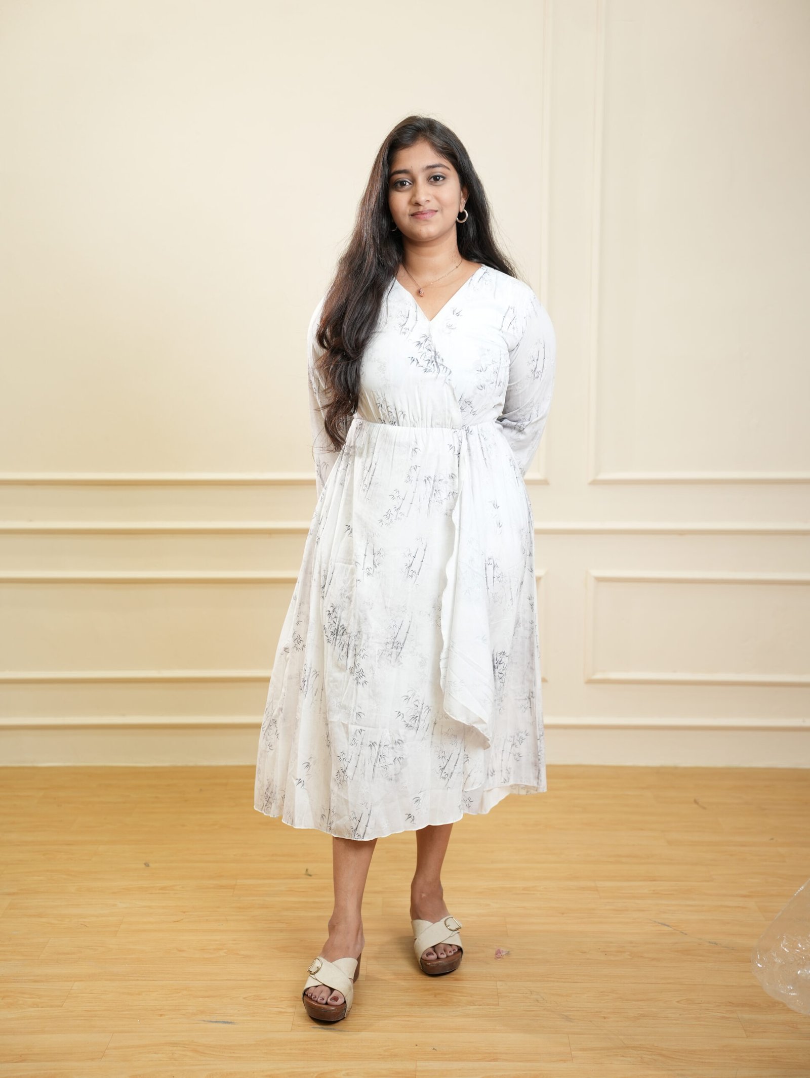 Stay effortlessly stylish with this white abstract printed midi dress, crafted for comfort and timeless appeal. The dress features soft abstract patterns gently scattered across a clean white base, creating a minimal yet sophisticated visual aesthetic.