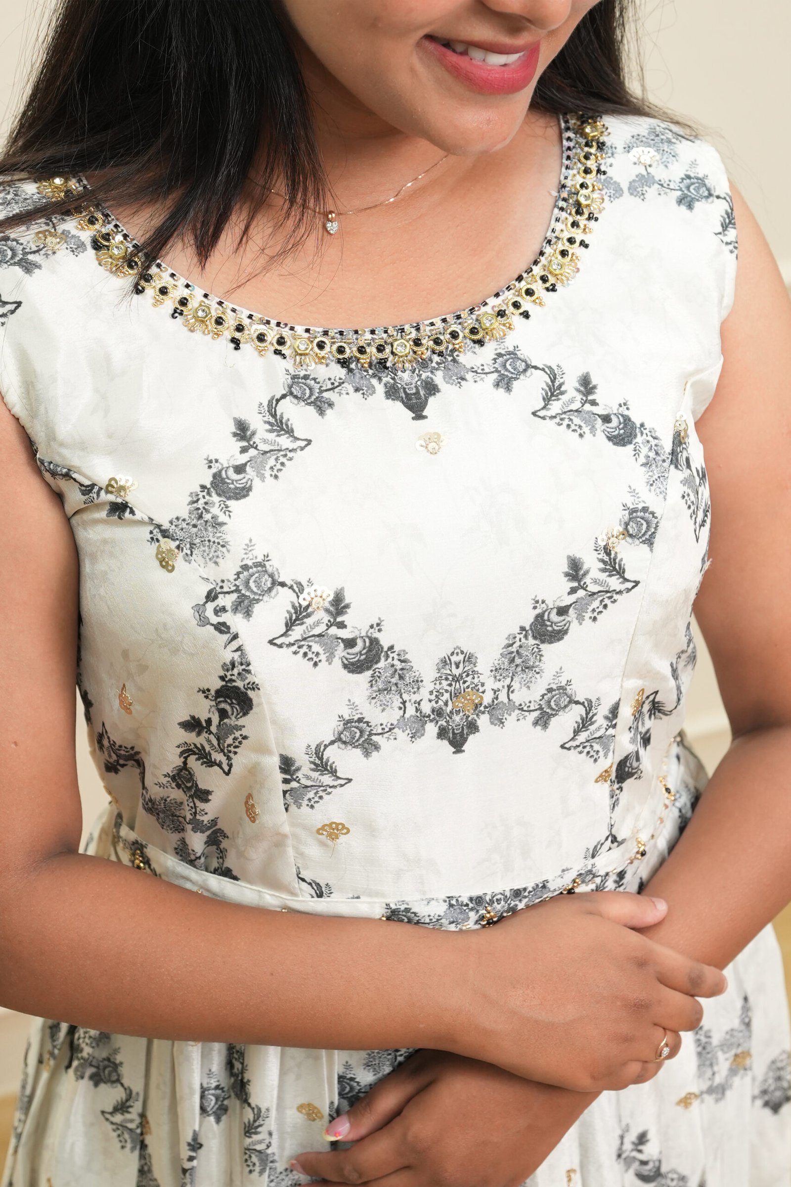 This white sleeveless ethnic printed maxi dress combines traditional artistry with a timeless, minimal aesthetic. The dress showcases detailed ethnic-inspired motifs arranged in a symmetrical pattern across the bodice and skirt, adding a touch of sophistication to the overall look. Crafted in a lightweight, flowy fabric, it ensures comfort while maintaining an elegant, structured drape.