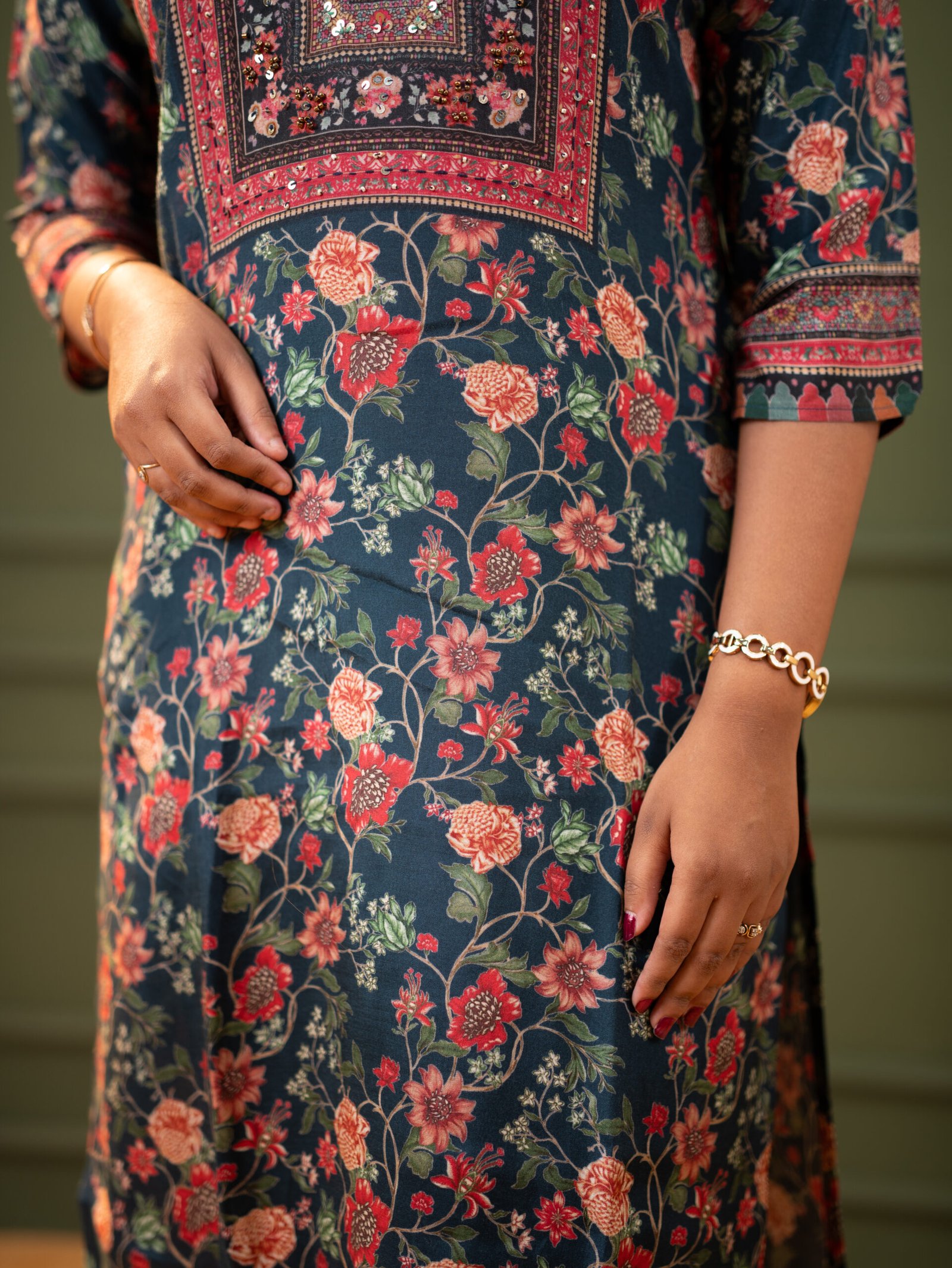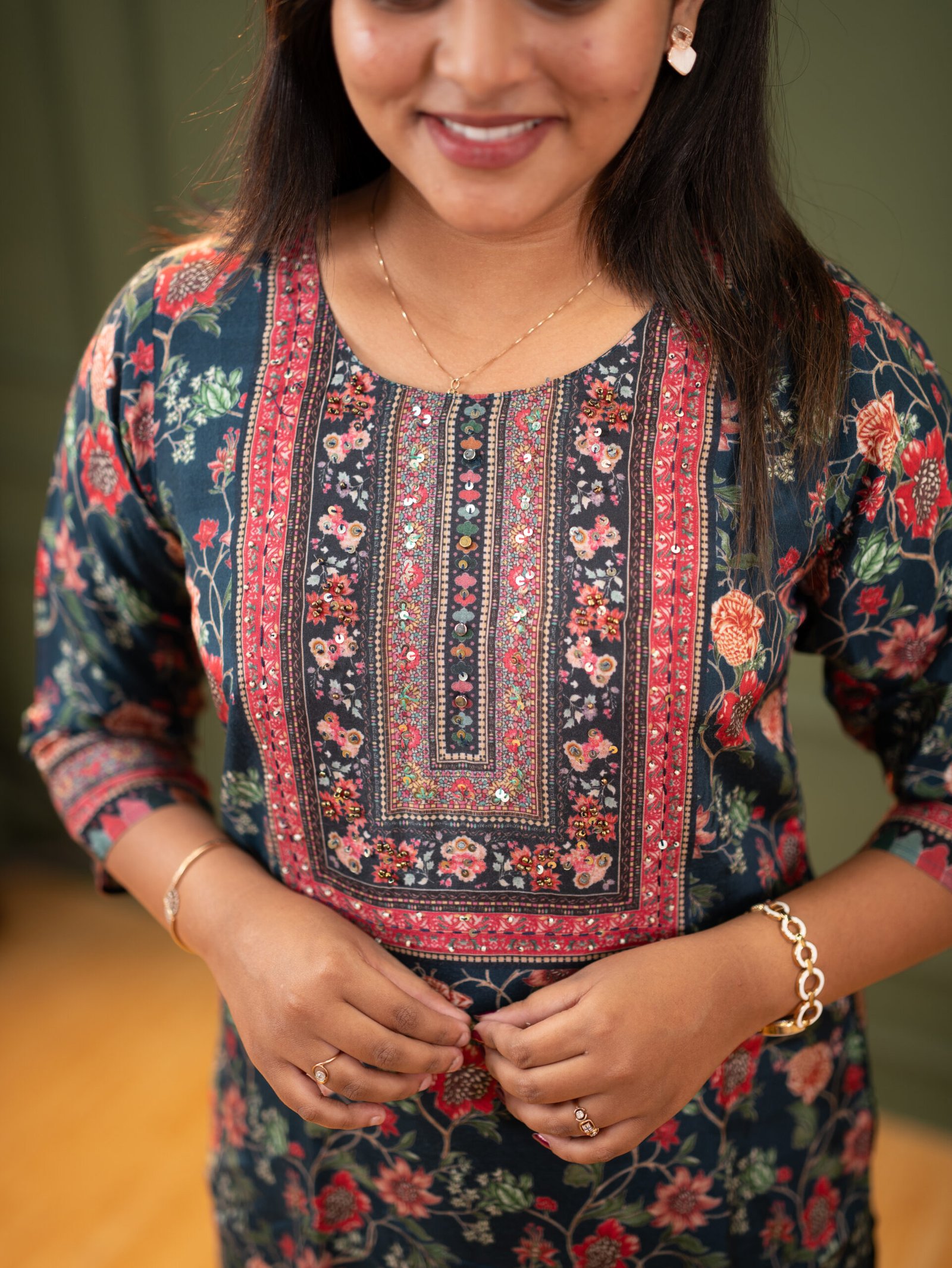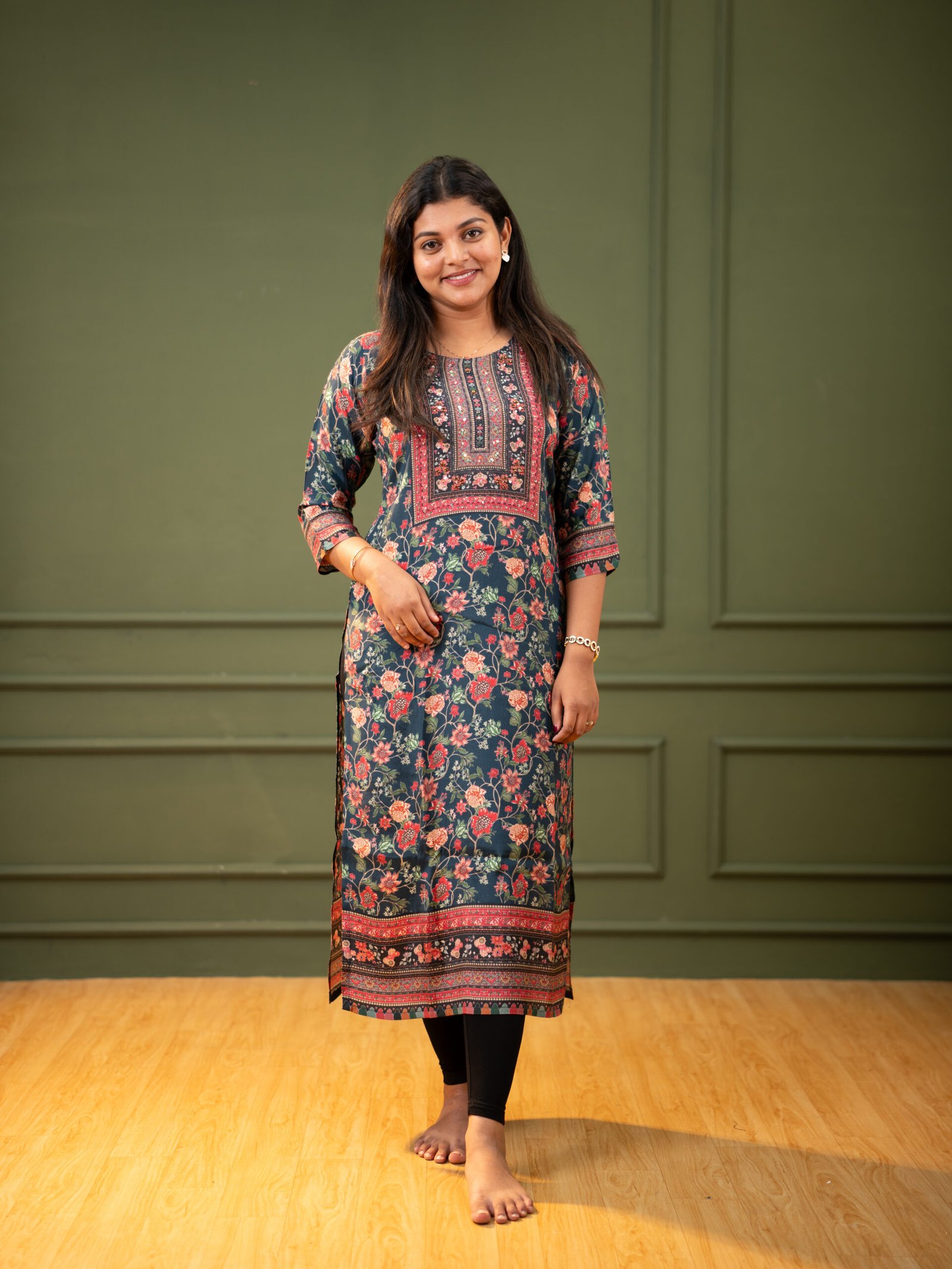 Refresh your everyday style with this Deep Teal Floral Print Straight Fit Kurti. Designed with a rich botanical pattern and a flattering straight silhouette, this kurti is perfect for office wear, casual outings, and small gatherings. The soft, breathable fabric ensures all-day comfort, while the decorative chest panel and 3/4th sleeves add a sophisticated touch. Pair it with black leggings or cigarette pants for a simple and polished ethnic look.