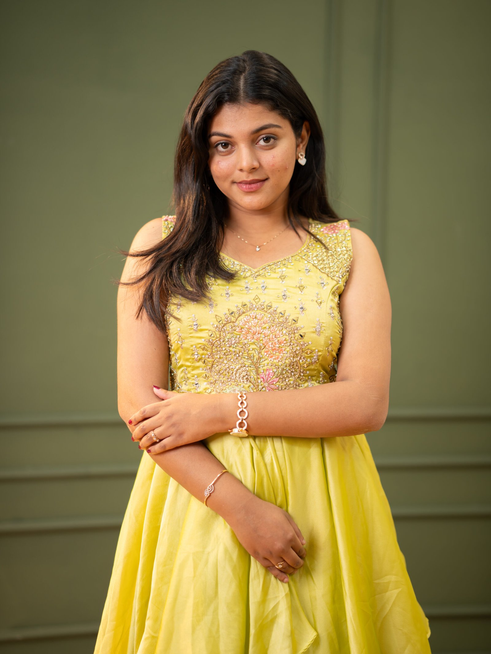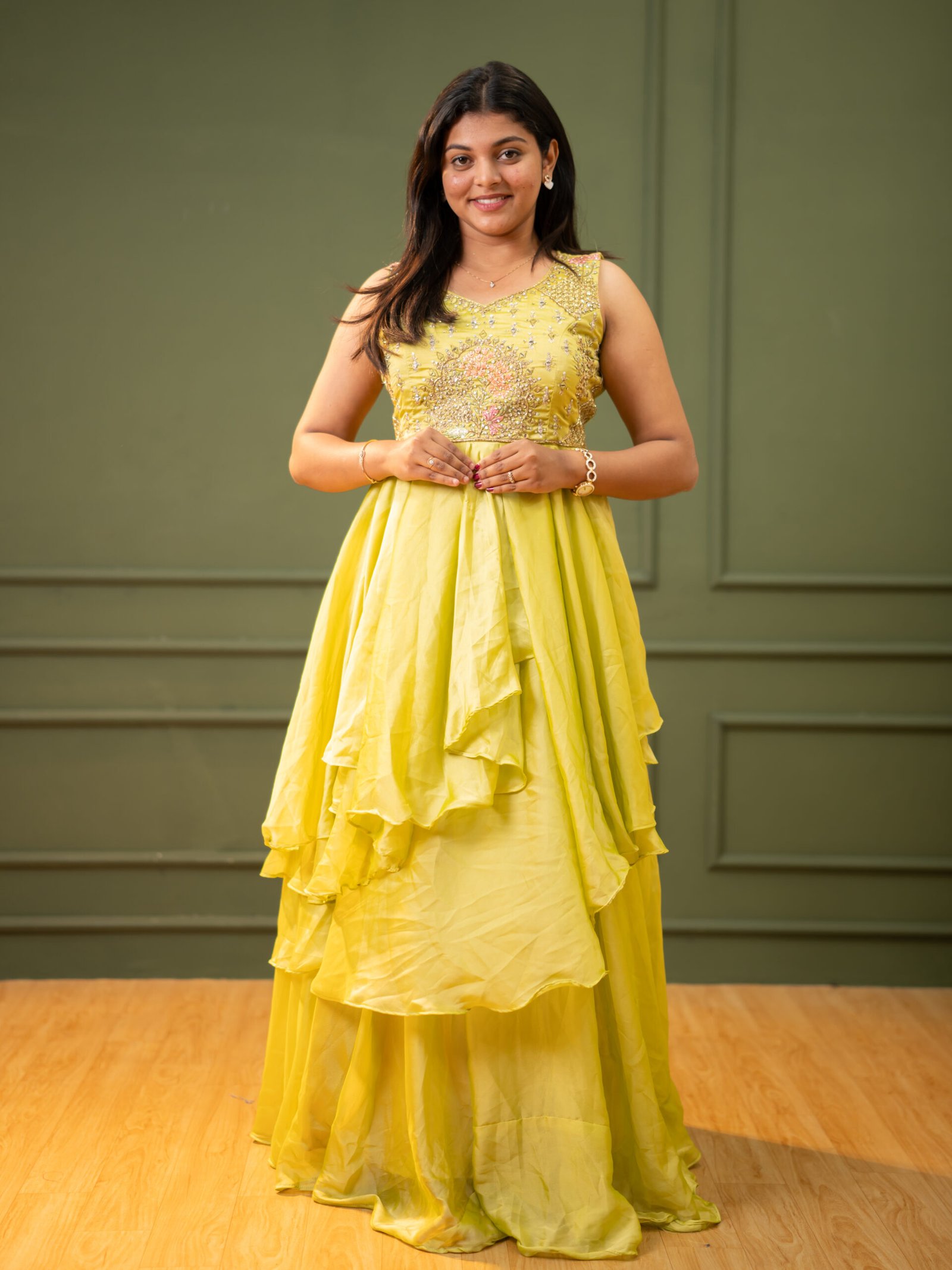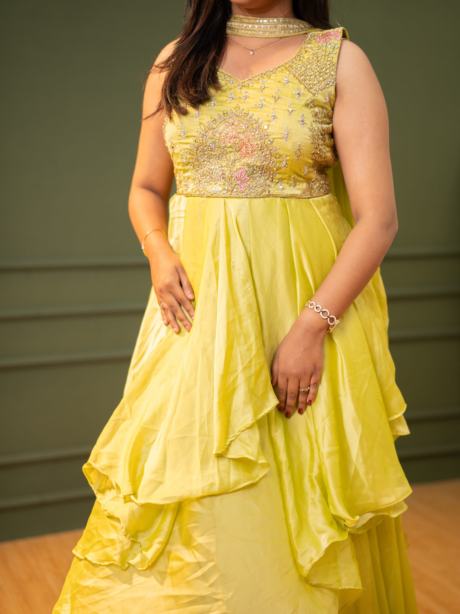 Radiate brightness at your next celebration in this vibrant Lemon Yellow Party Frock. This ensemble features a beautifully embellished bodice and a high-volume skirt with playful, asymmetrical layers. Combining a fresh color palette with intricate sparkling details, this frock is designed to be both fun and formal.