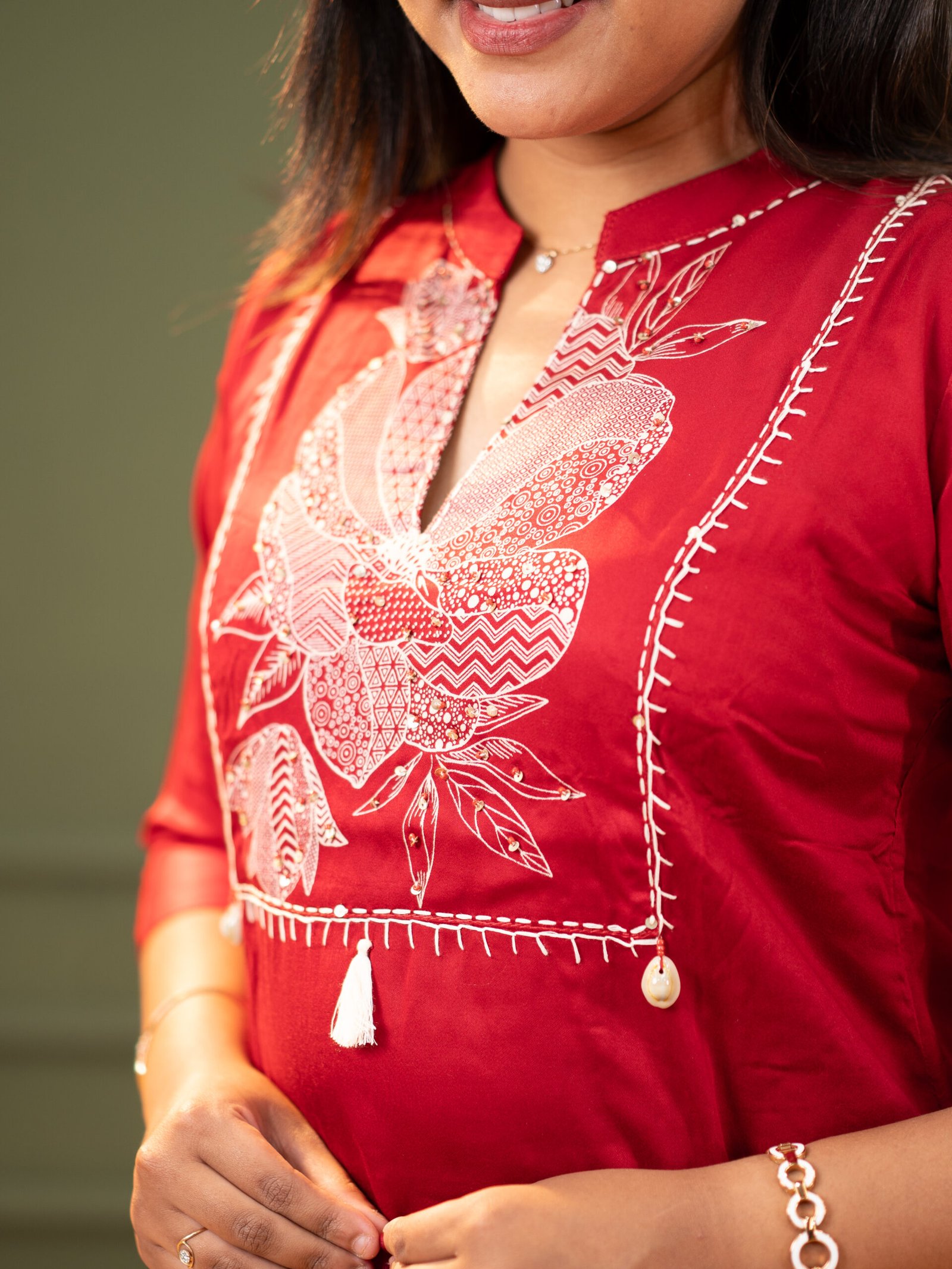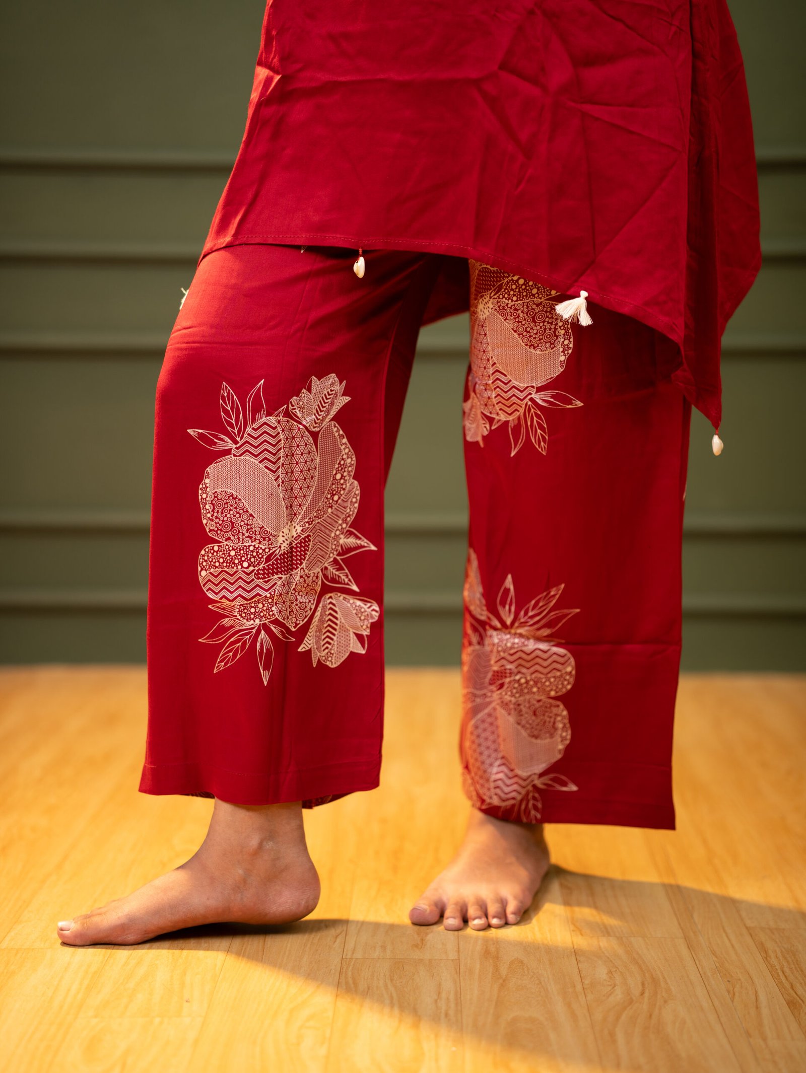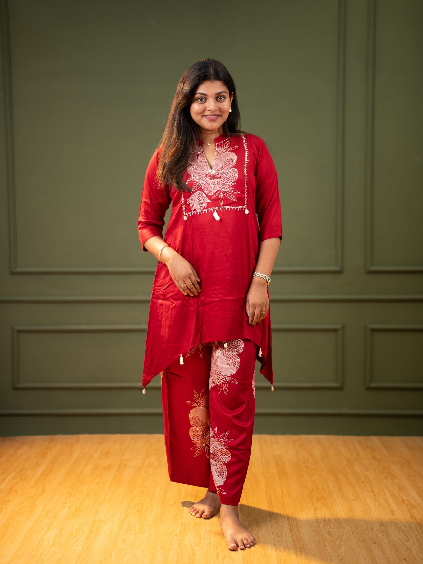 Enhance your ethnic wardrobe with this elegant Women’s Red Floral Co-Ord Set, designed for comfort and timeless style. This beautiful two-piece set features a finely embroidered kurta with delicate floral motifs and tassel detailing, paired with matching printed straight-fit pants for a coordinated look.