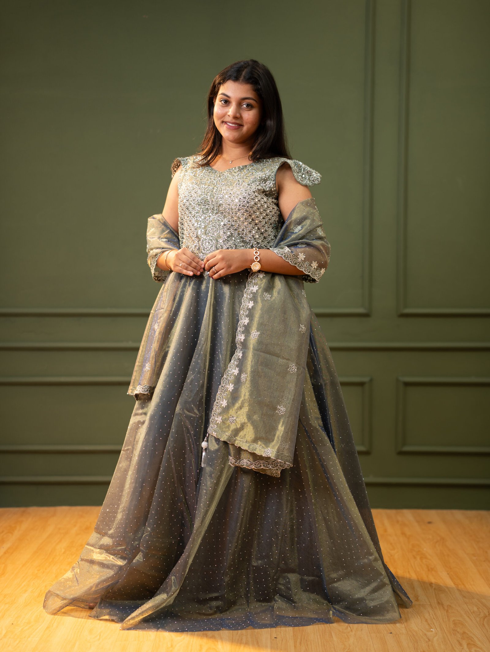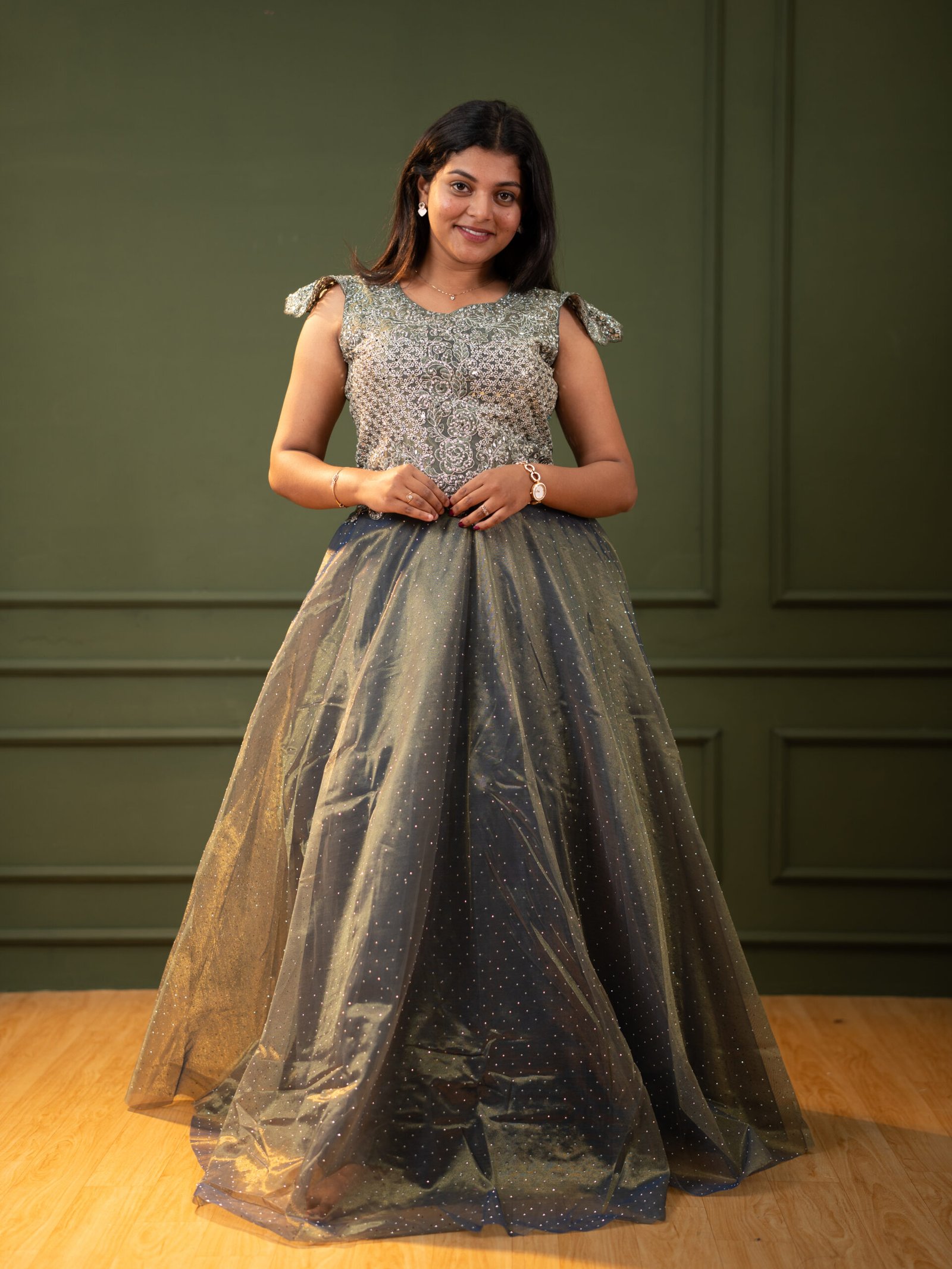 Make a grand entrance with this stunning Evening Gown, a perfect blend of intricate traditional craftsmanship and modern silhouette. Featuring a heavily embroidered sage green bodice and a voluminous charcoal net skirt, this gown is designed to make you the star of any festive event or formal party.