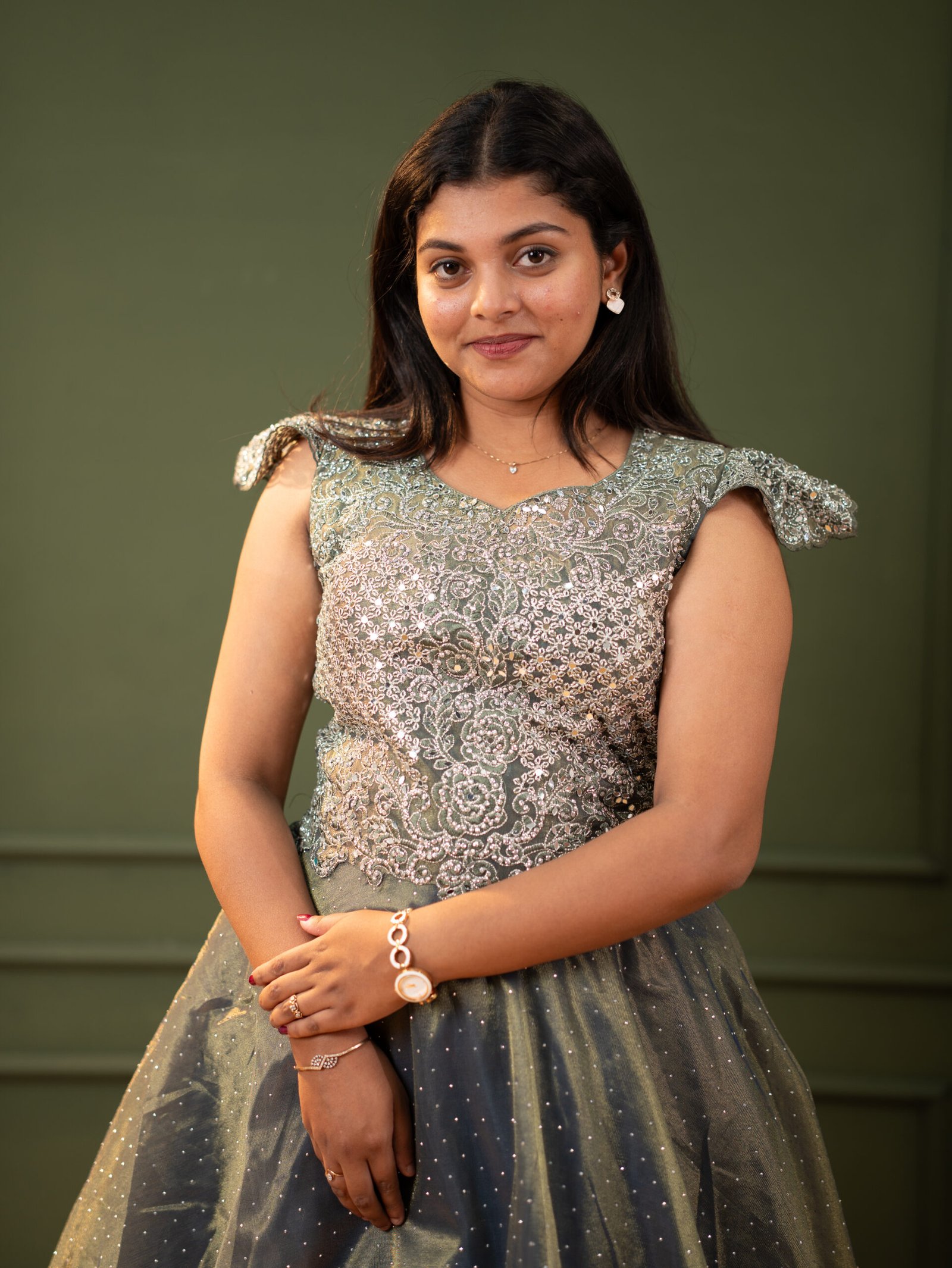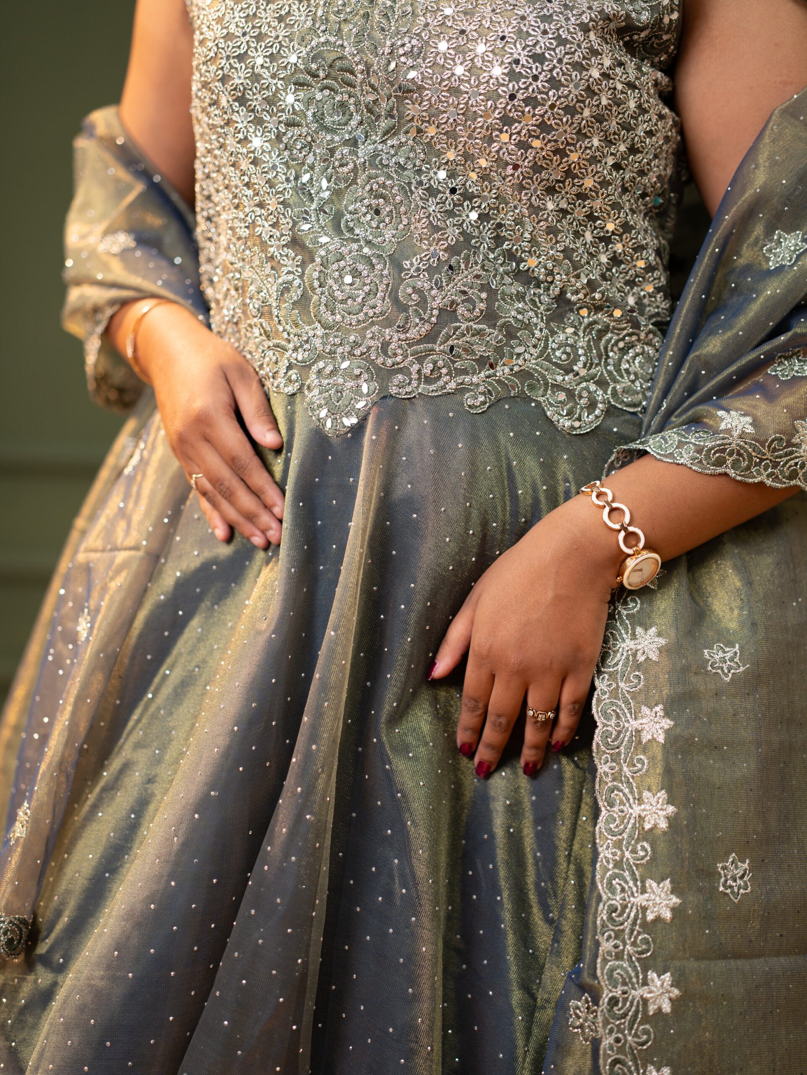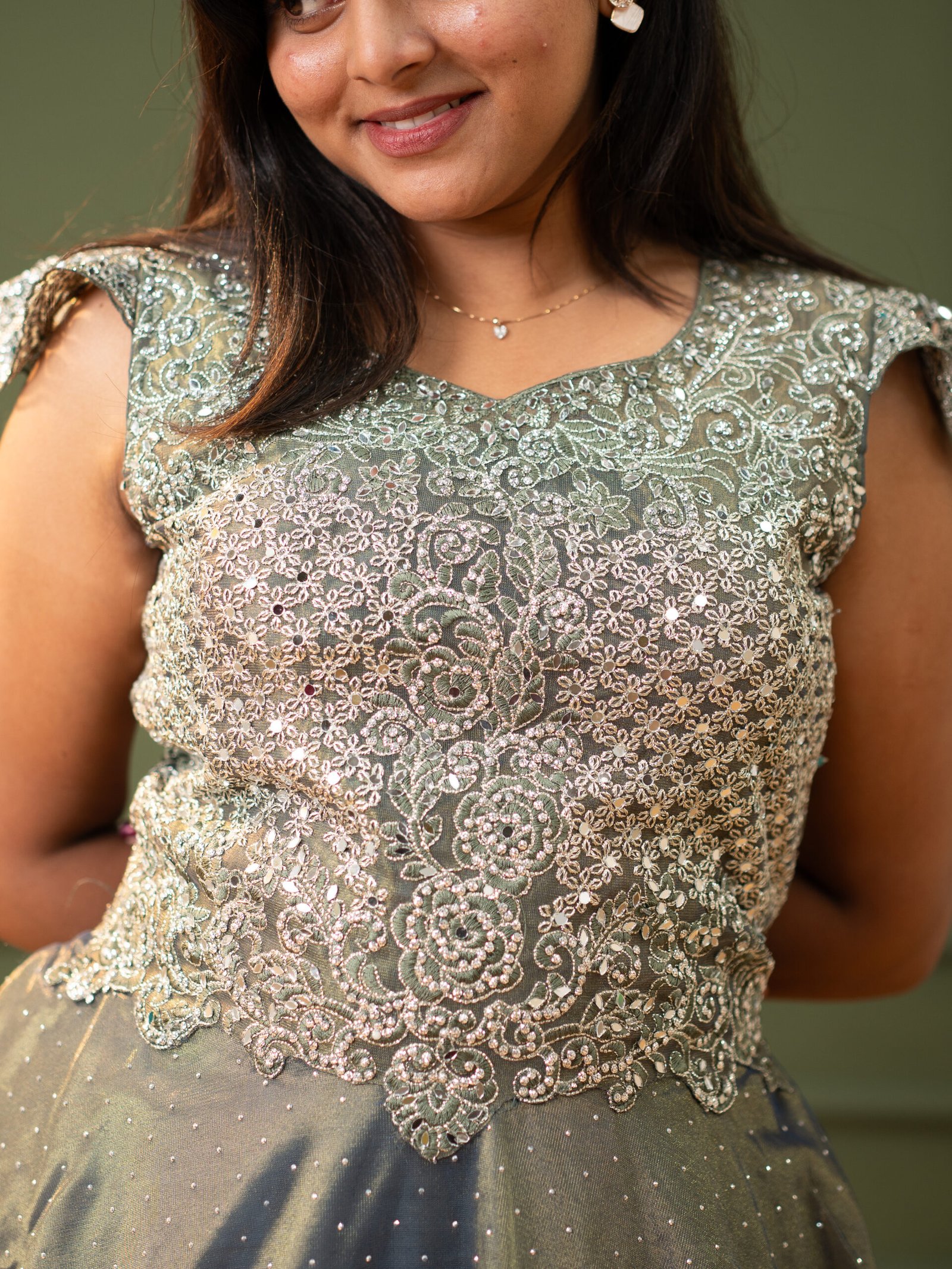 Exquisite Bodice: Detailed sage green top with silver thread-work and floral embroidery.