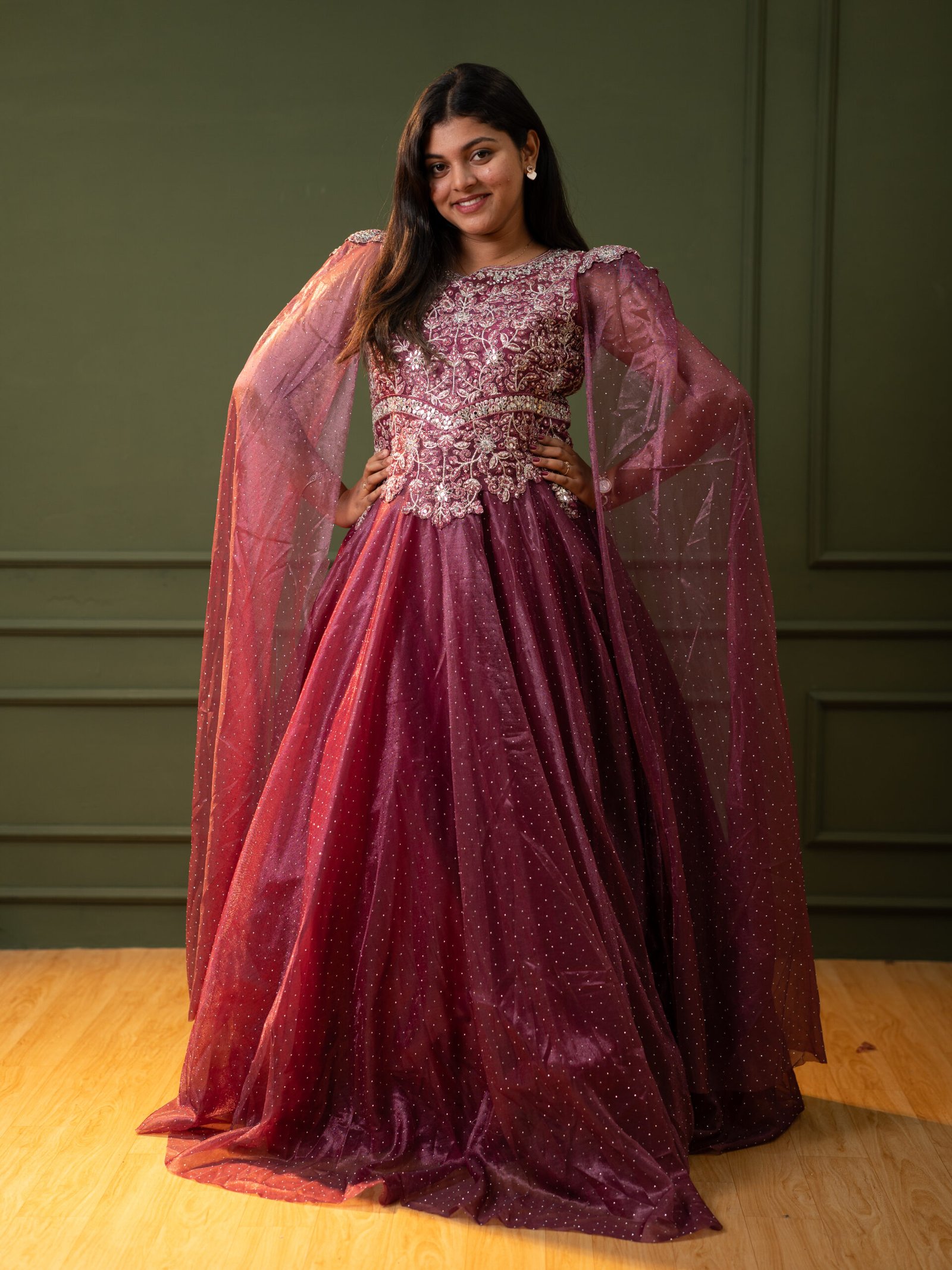 Command the room in this breathtaking Wine Purple Evening Gown. Combining high-fashion drama with traditional craftsmanship, this gown features a dazzling silver-embroidered bodice and ethereal floor-length cape sleeves. Designed for those who want to make a bold, sophisticated statement, it is the ultimate choice for grand celebrations.